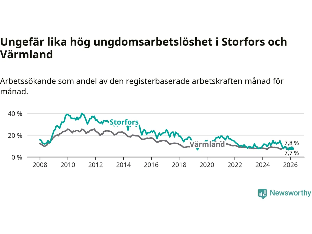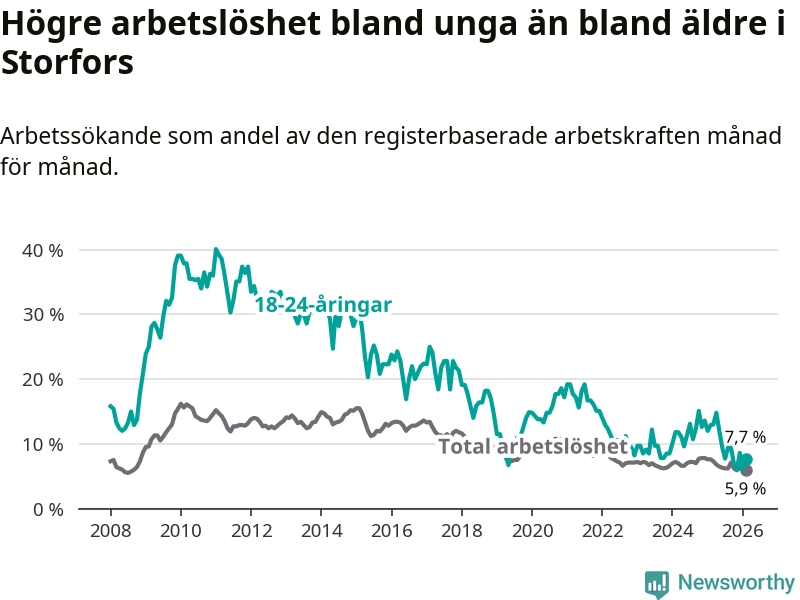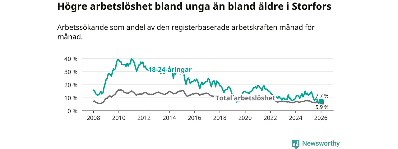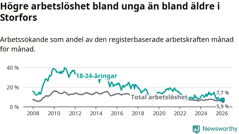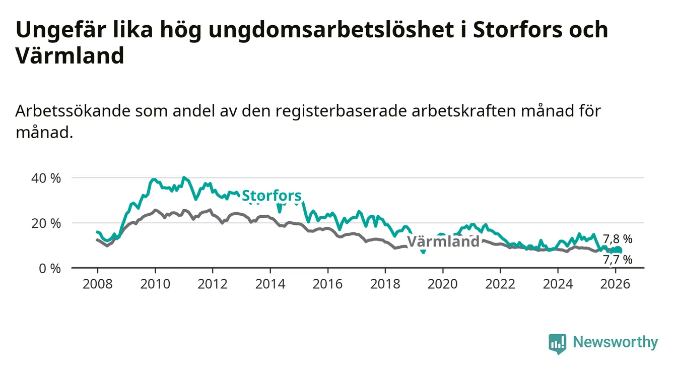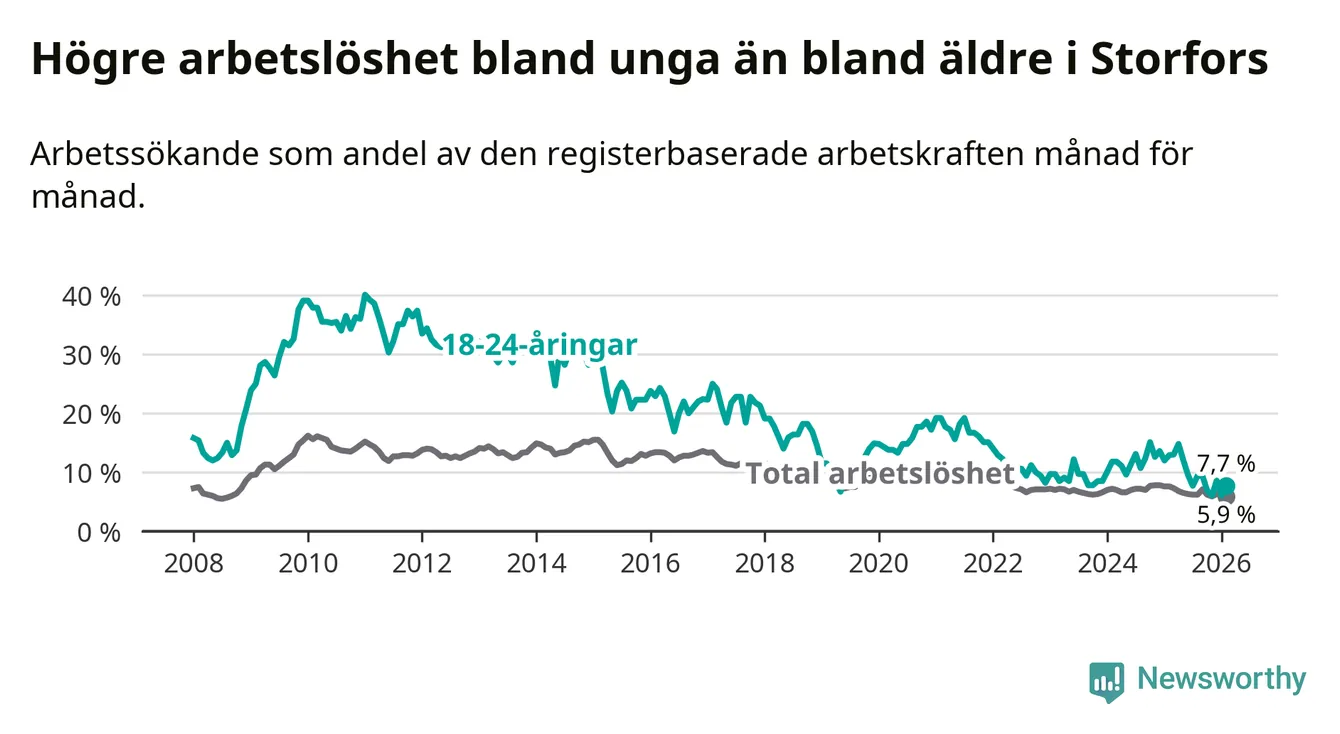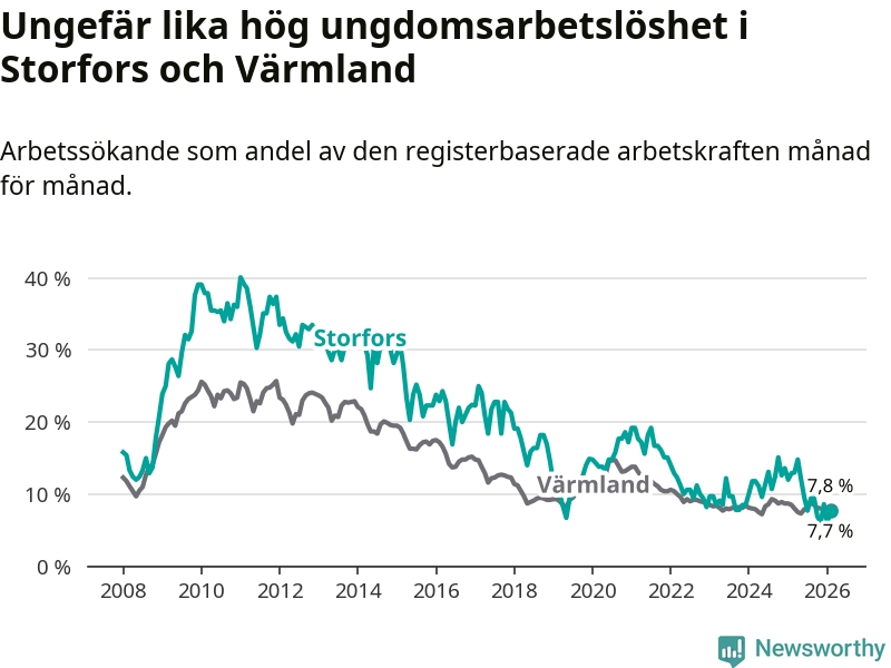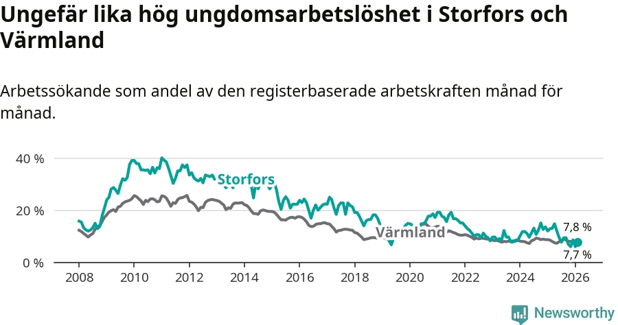 I och med den senaste månadens nedgång har de ungas arbetslöshet i Storfors sjunkit nio månader i följd (ner från 12,1 procent i maj 2025 till 7,7 procent nu).