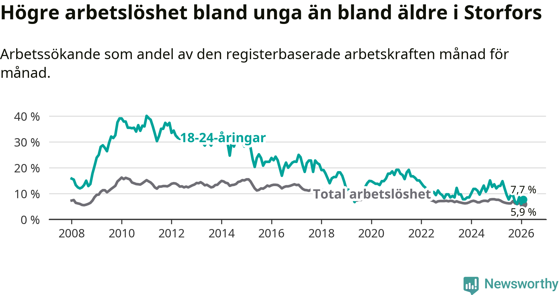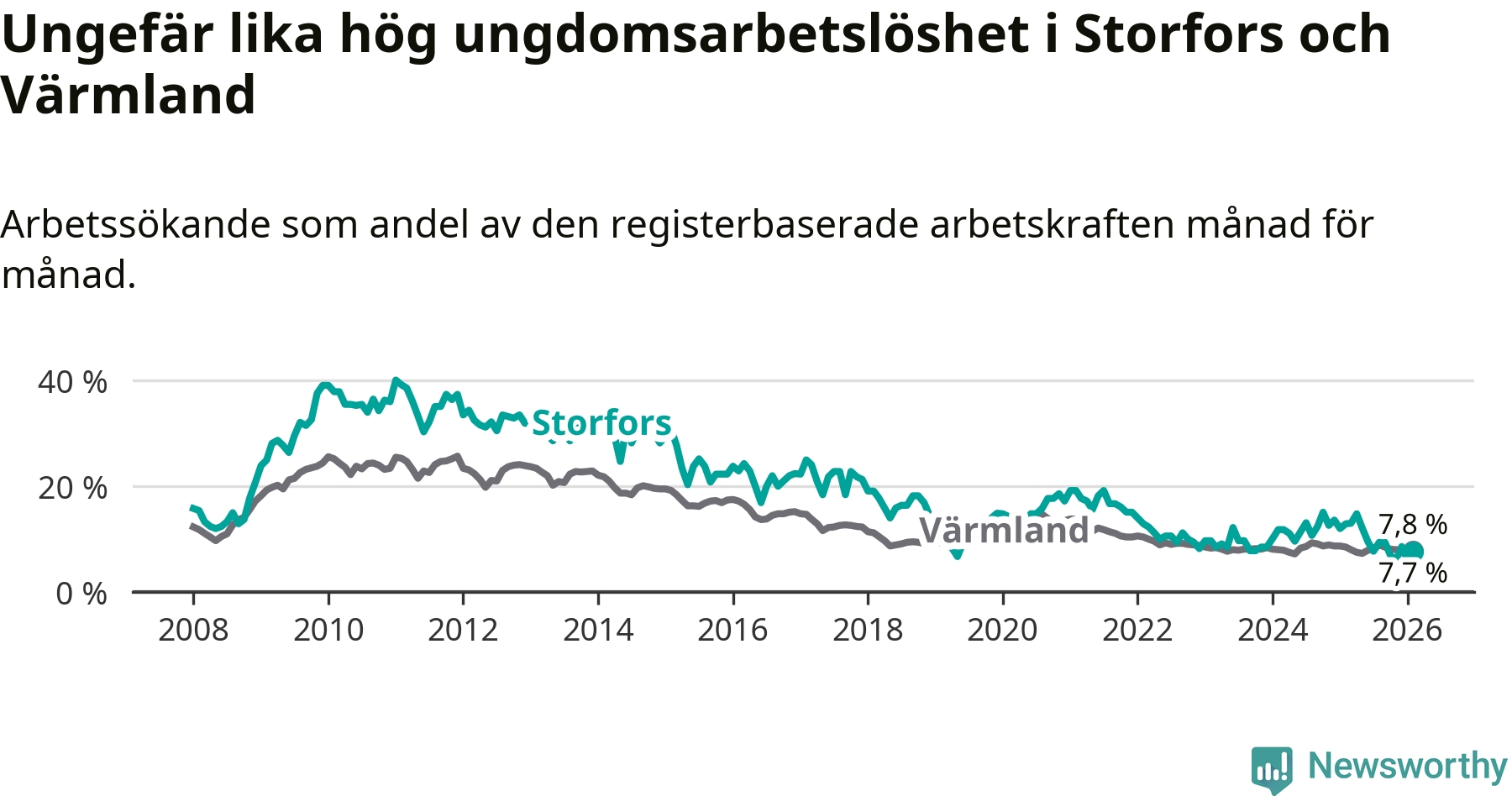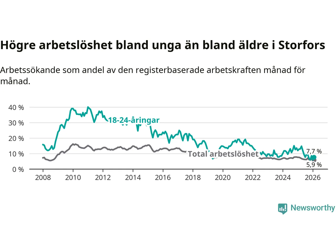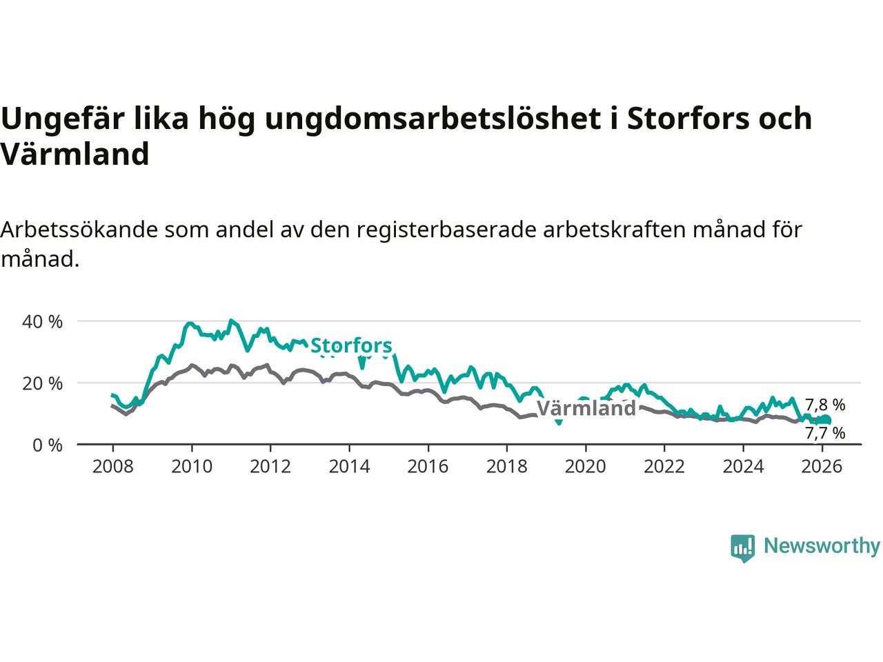 I och med den senaste månadens nedgång har de ungas arbetslöshet i Storfors sjunkit nio månader i följd (ner från 12,1 procent i maj 2025 till 7,7 procent nu).