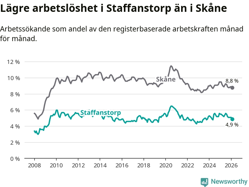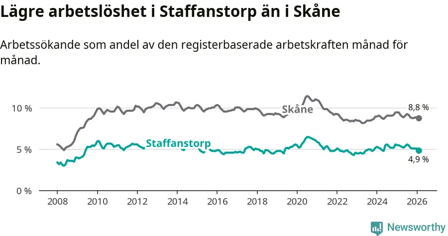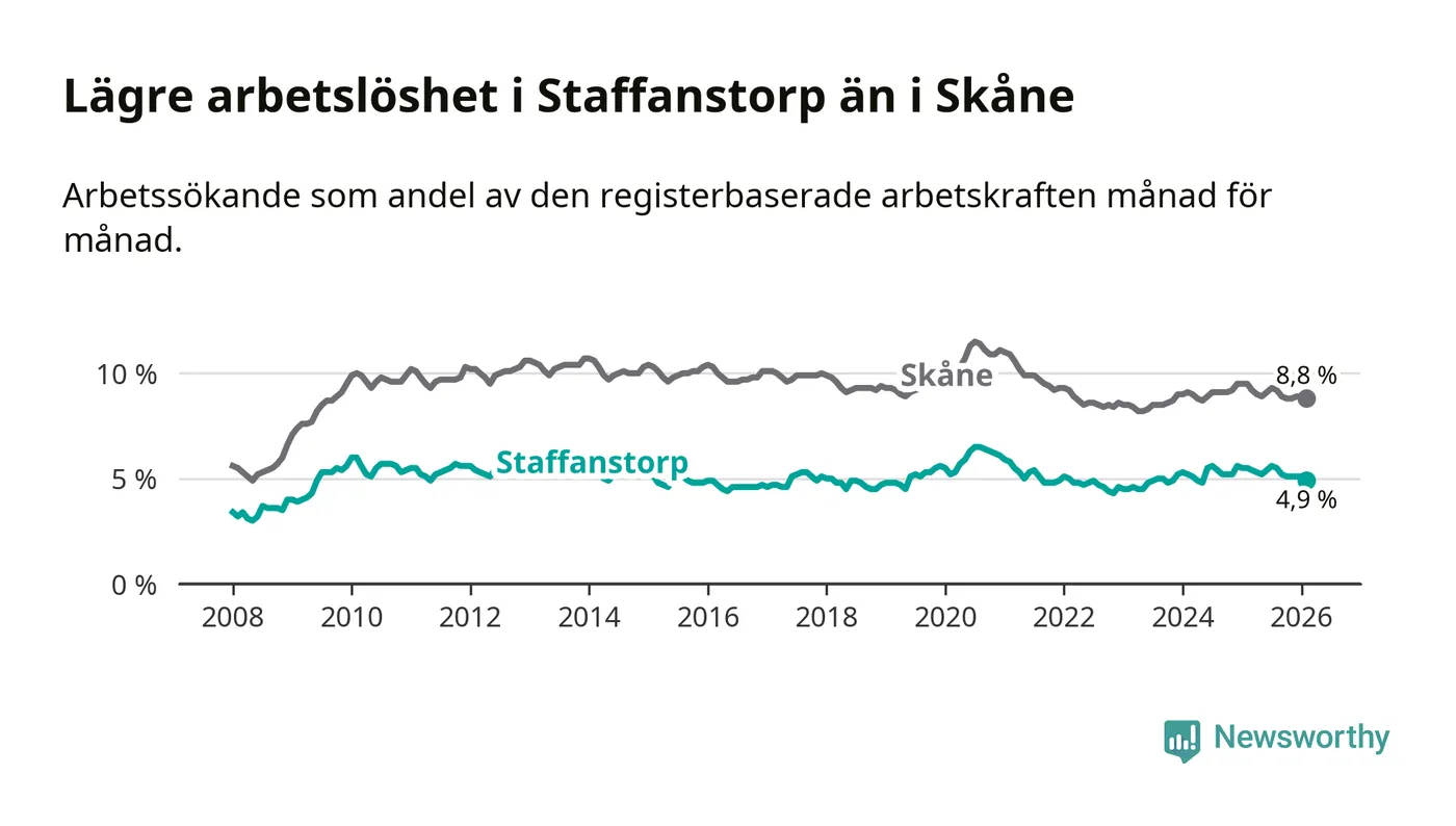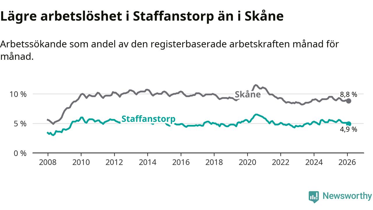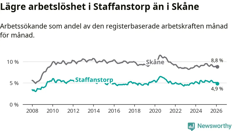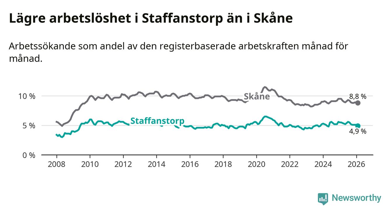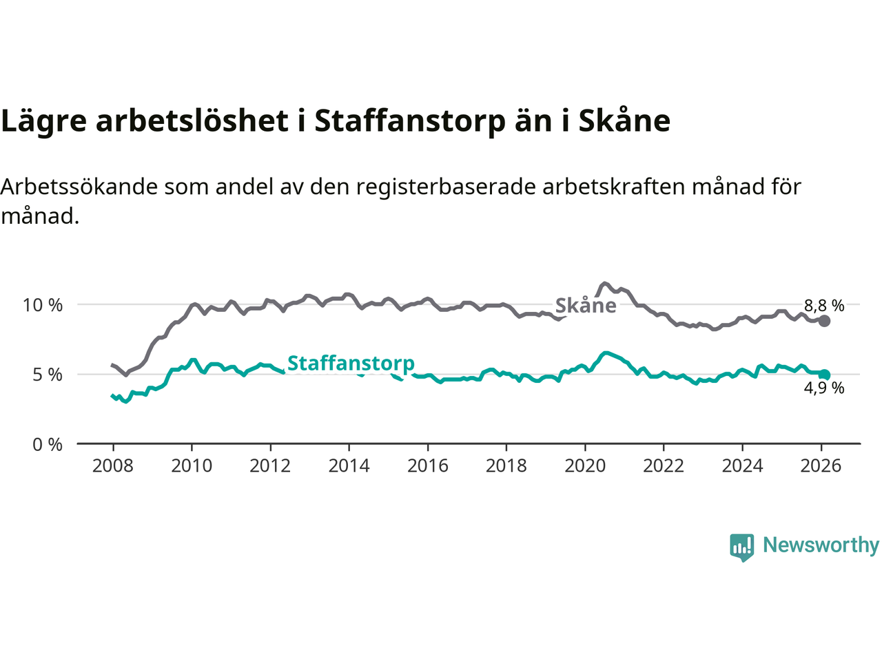 Staffanstorp hade redan tidigare lägre arbetslöshet än snittet i hela Skåne län och nu växer klyftan (4,9 procent i kommunen, jämfört med 8,8 procent i hela länet). Lomma har den lägsta arbetslösheten i länet (3,8 procent), medan Perstorp har den högsta (13,2 procent). För att Staffanstorp skulle komma ner i samma arbetslöshetsnivå som Lomma skulle 151 personer behöva sysselsättas.