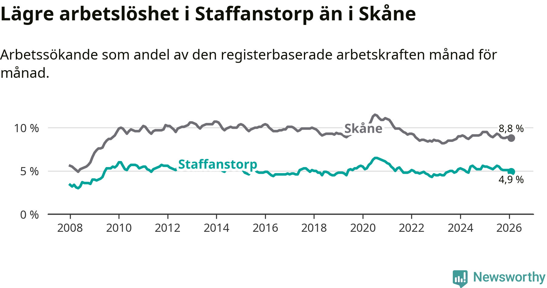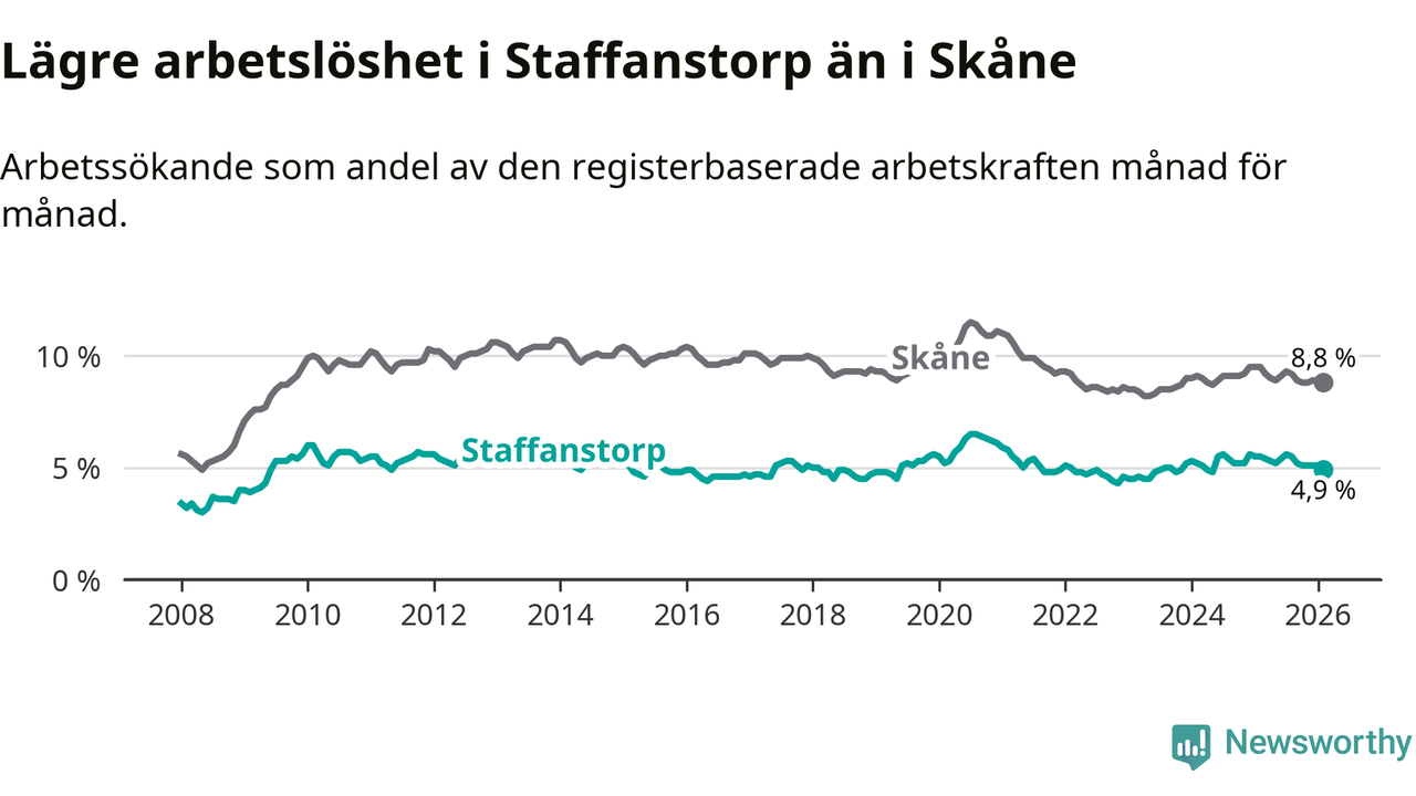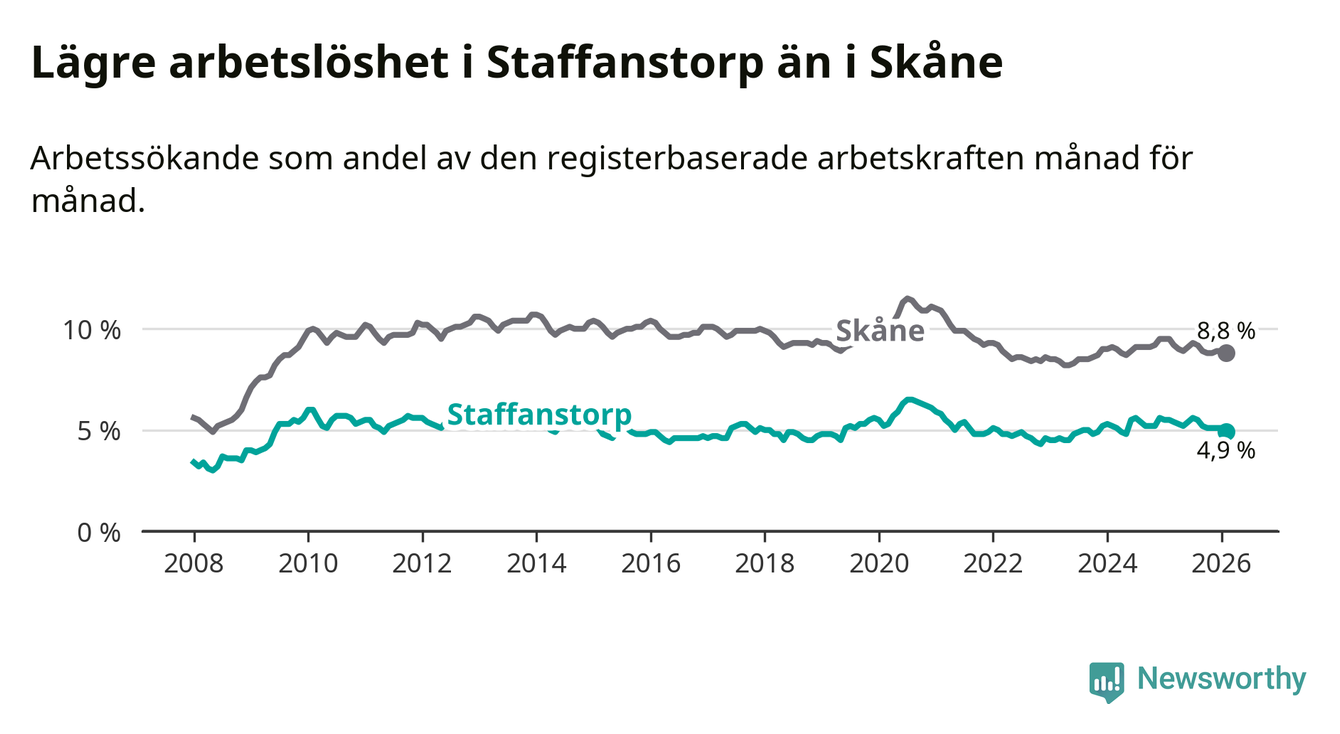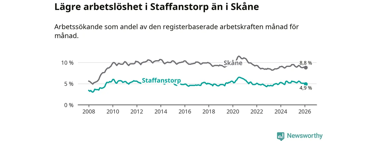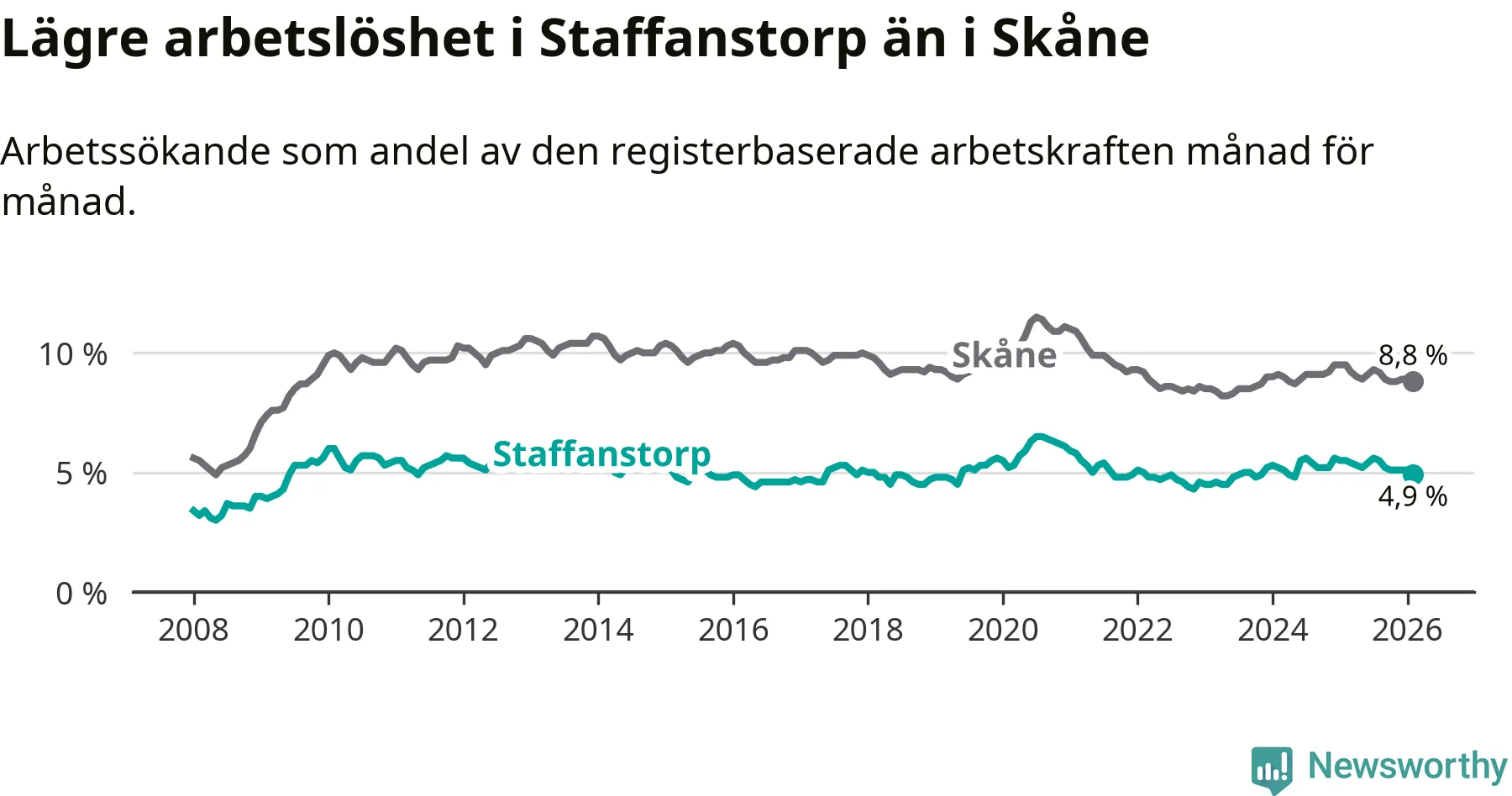 Graf: Arbetslöshet i Staffanstorps kommun och Skåne län