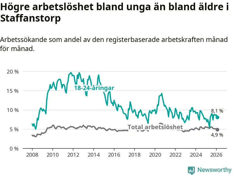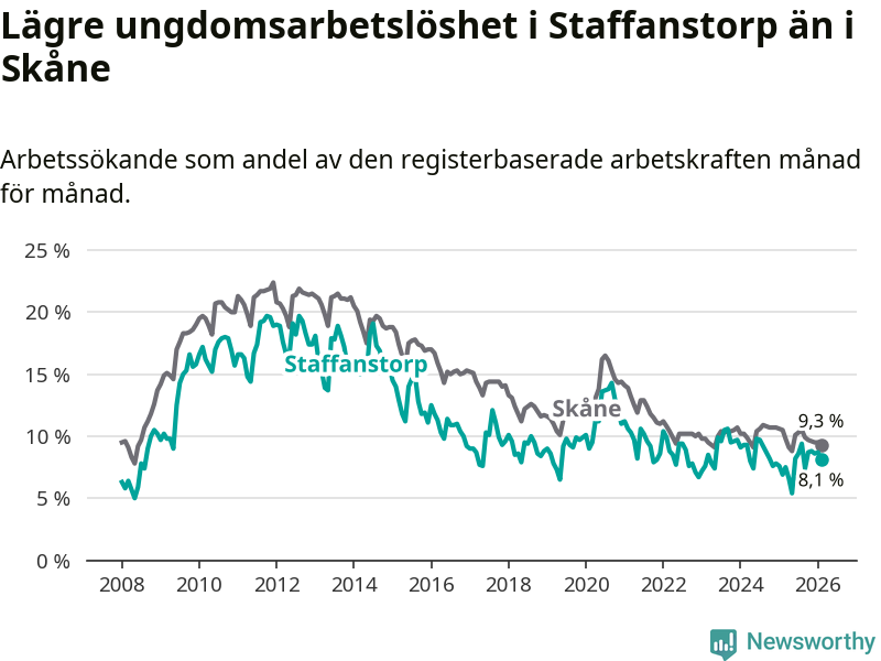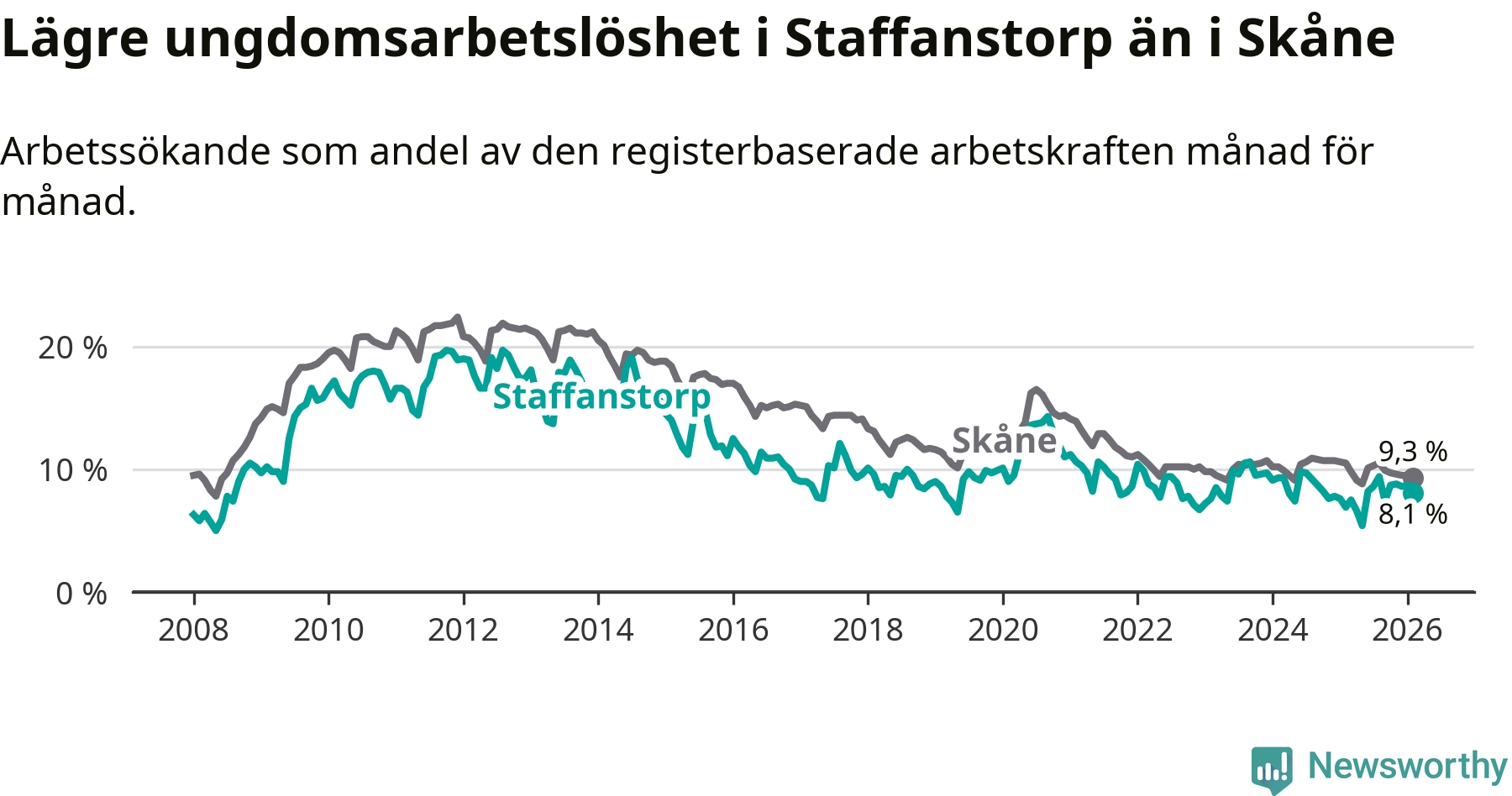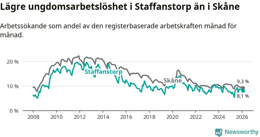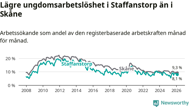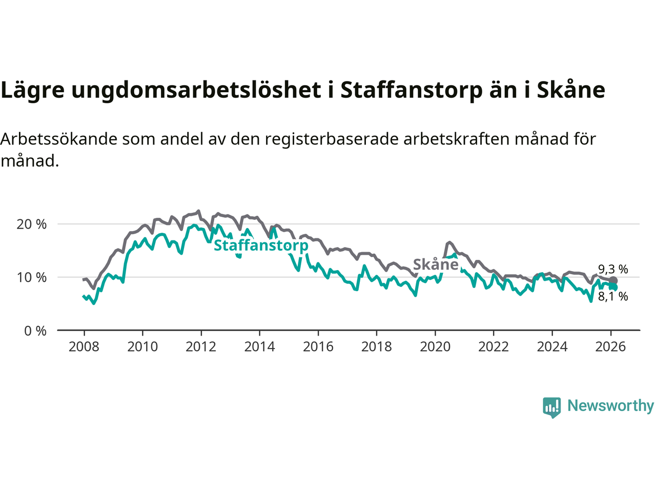 Precis som den totala arbetslösheten ligger ungdomsarbetslösheten i Staffanstorp lägre än i Skåne som helhet. Skillnaden mellan kommunen och länet är 1,2 procentenheter.