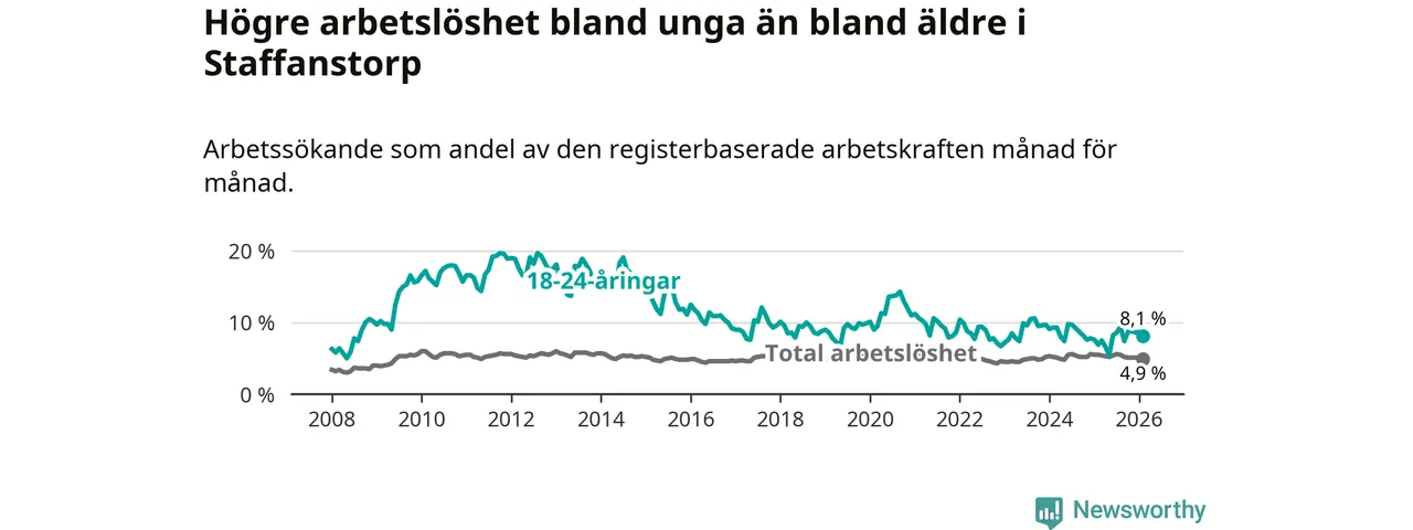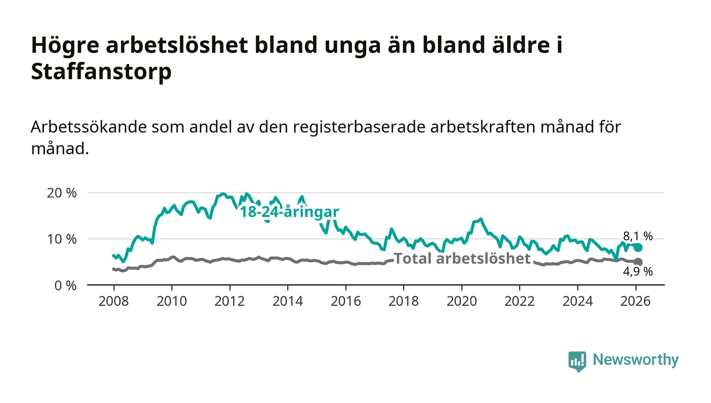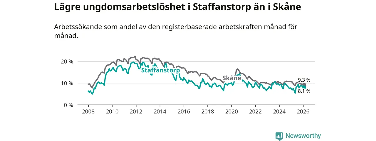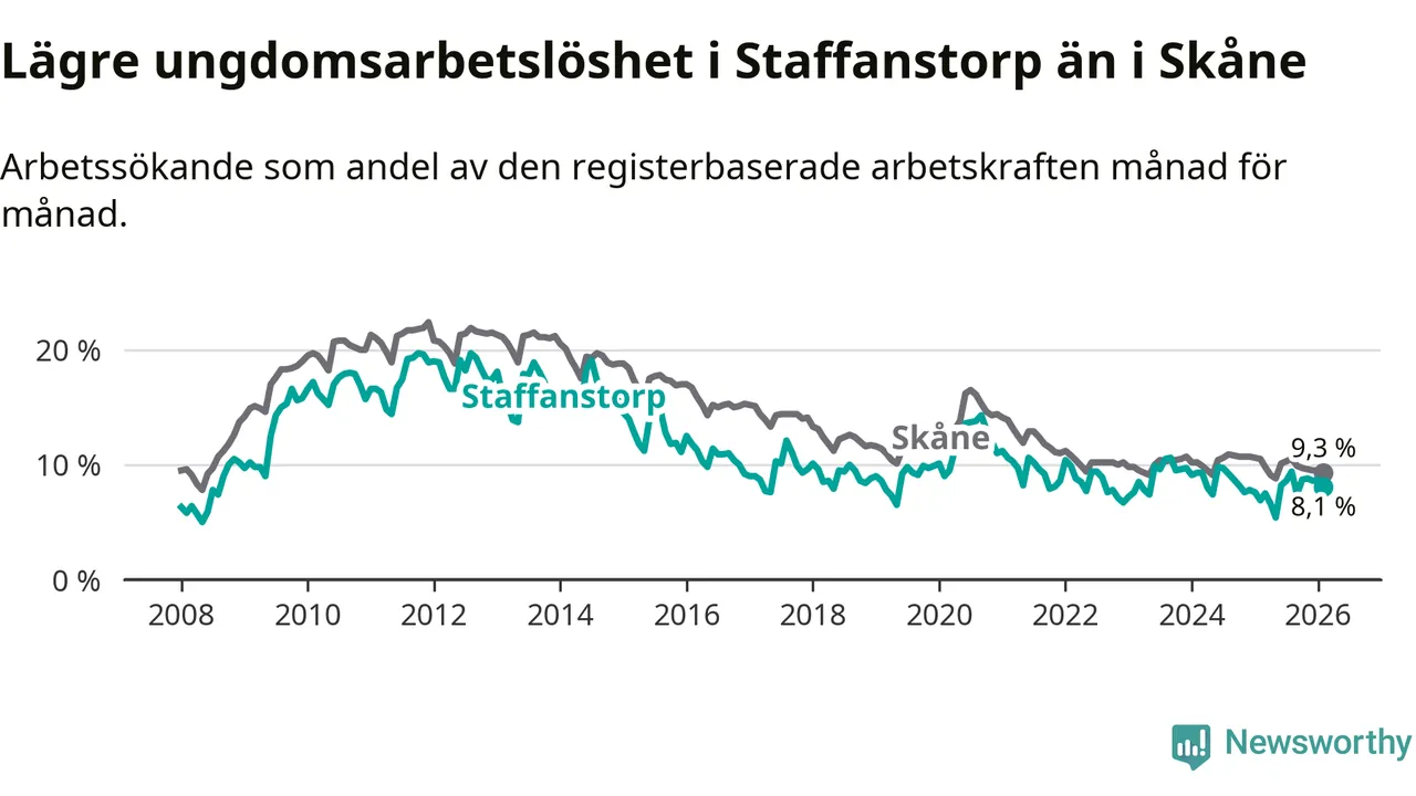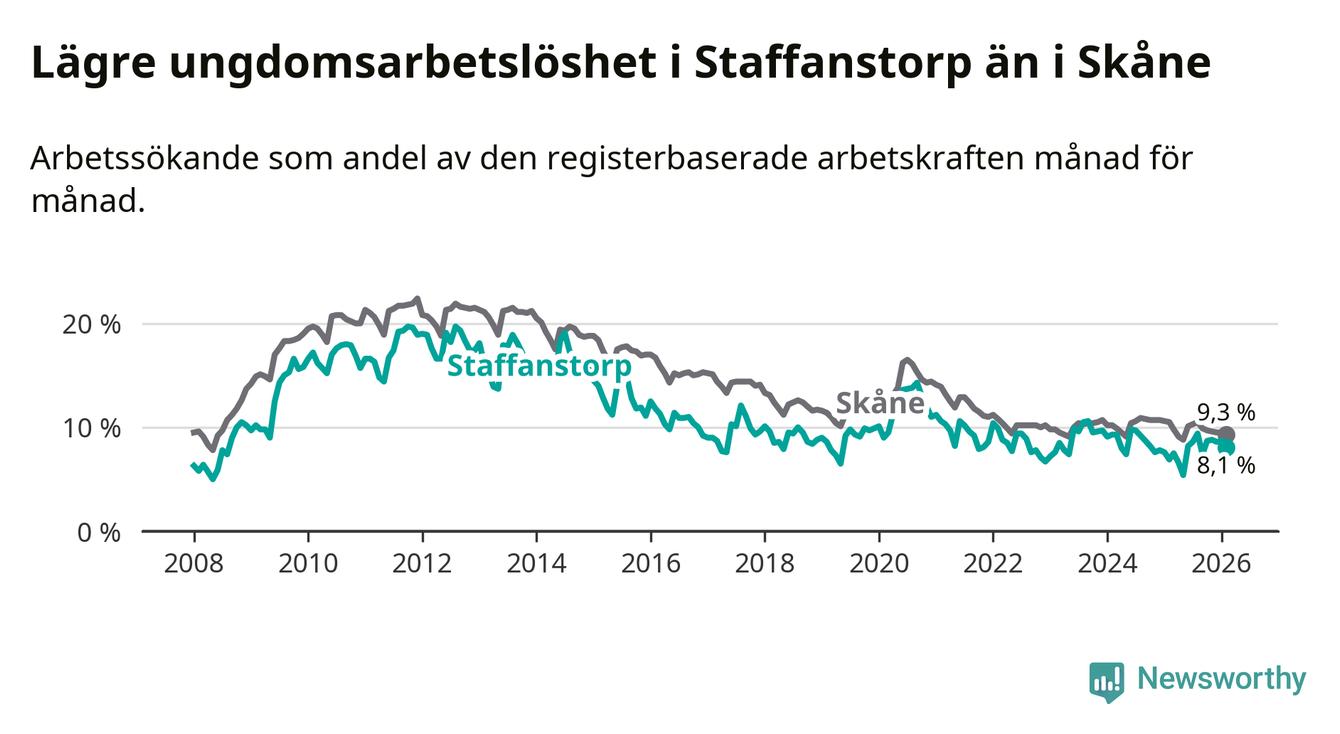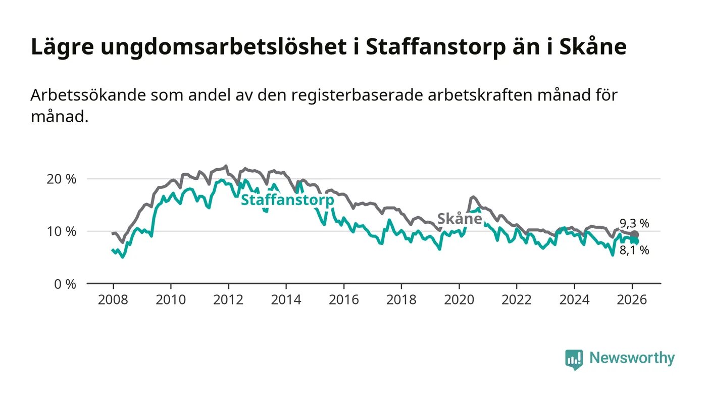 Graf: Arbetslöshet bland unga i Staffanstorps kommun och Skåne län