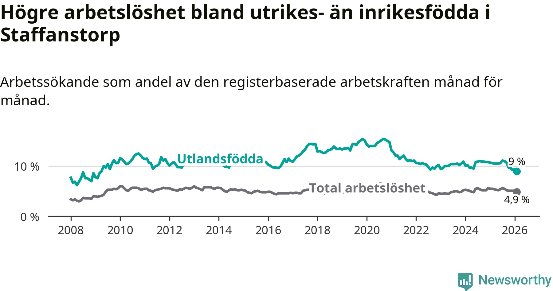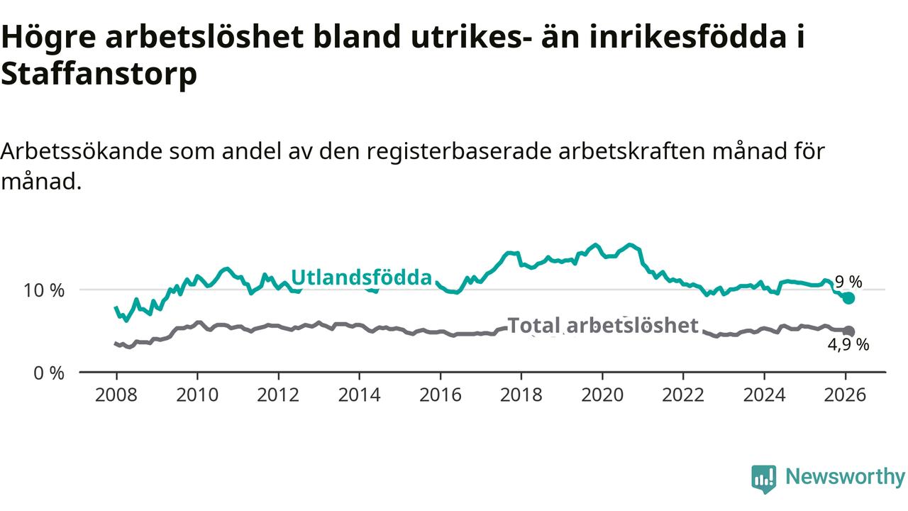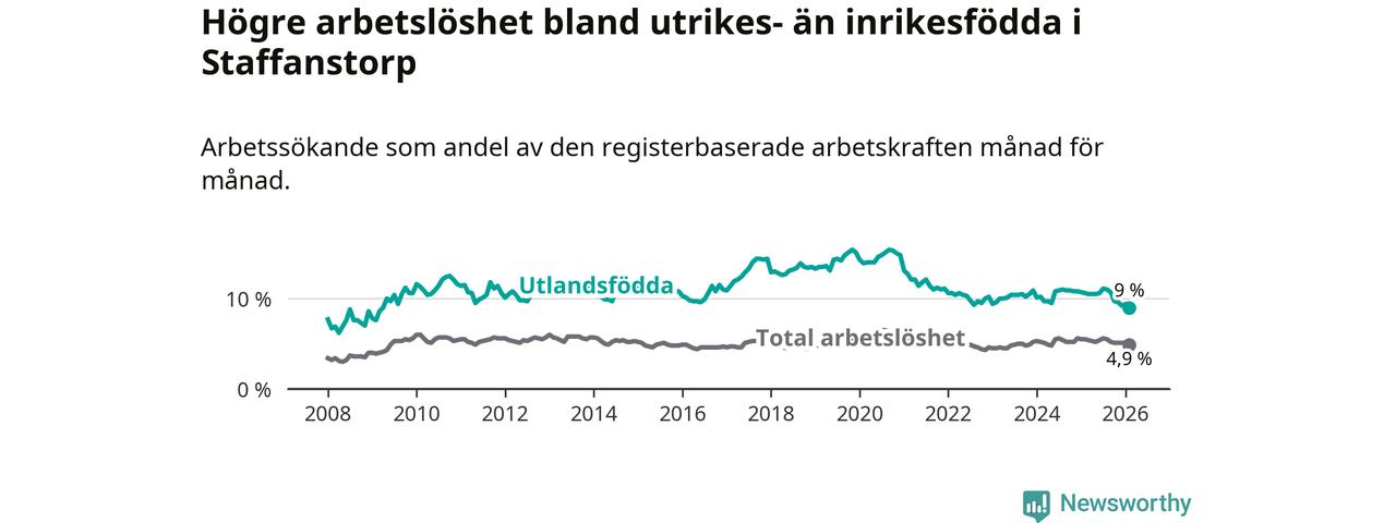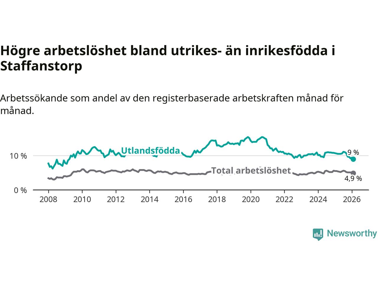 Arbetslösheten bland utlandsfödda var 9,0 procent i Staffanstorp under februari månad, motsvarande 258 av 2 867 personer. Det är 1,6 procentenheter färre än vid samma tidpunkt i fjol (−35 om man räknar personer). Därmed är de utlandsföddas arbetslöshet lägre än vid samma tidpunkt i fjol för sjätte månaden i följd. Sedan augusti 2025 har arbetslösheten bland utlandsfödda minskat från 11,0 till 9,0 procent. Den nuvarande arbetslöshetsnivån är den lägsta sedan april 2009.