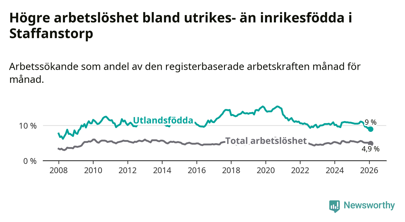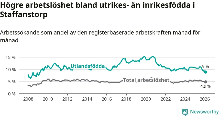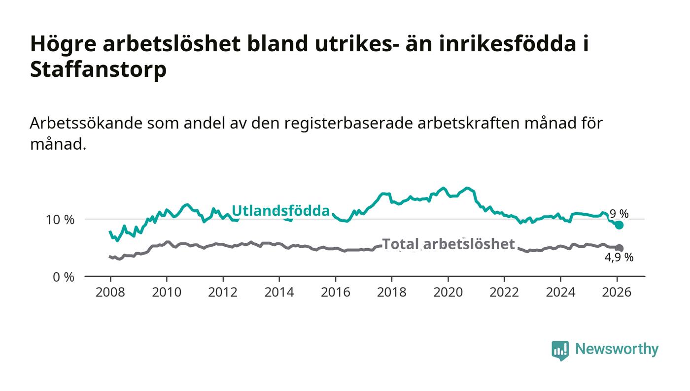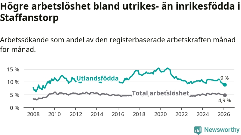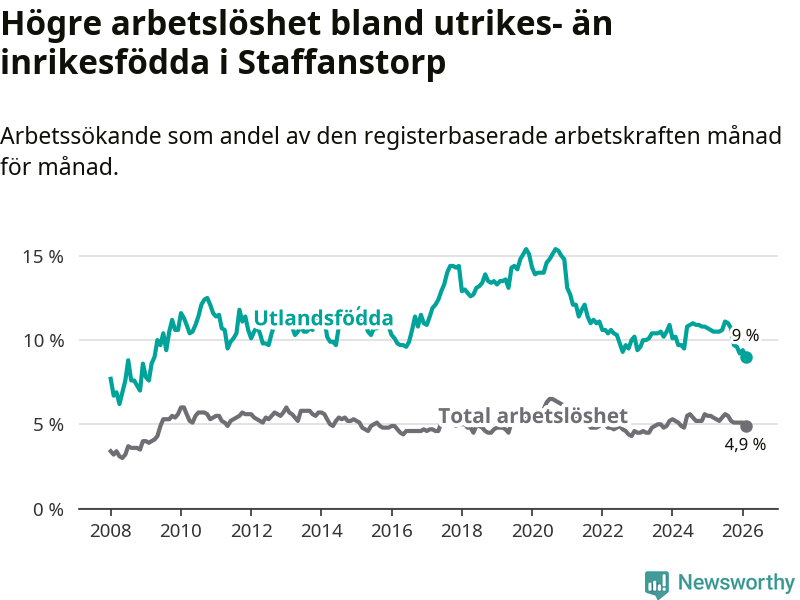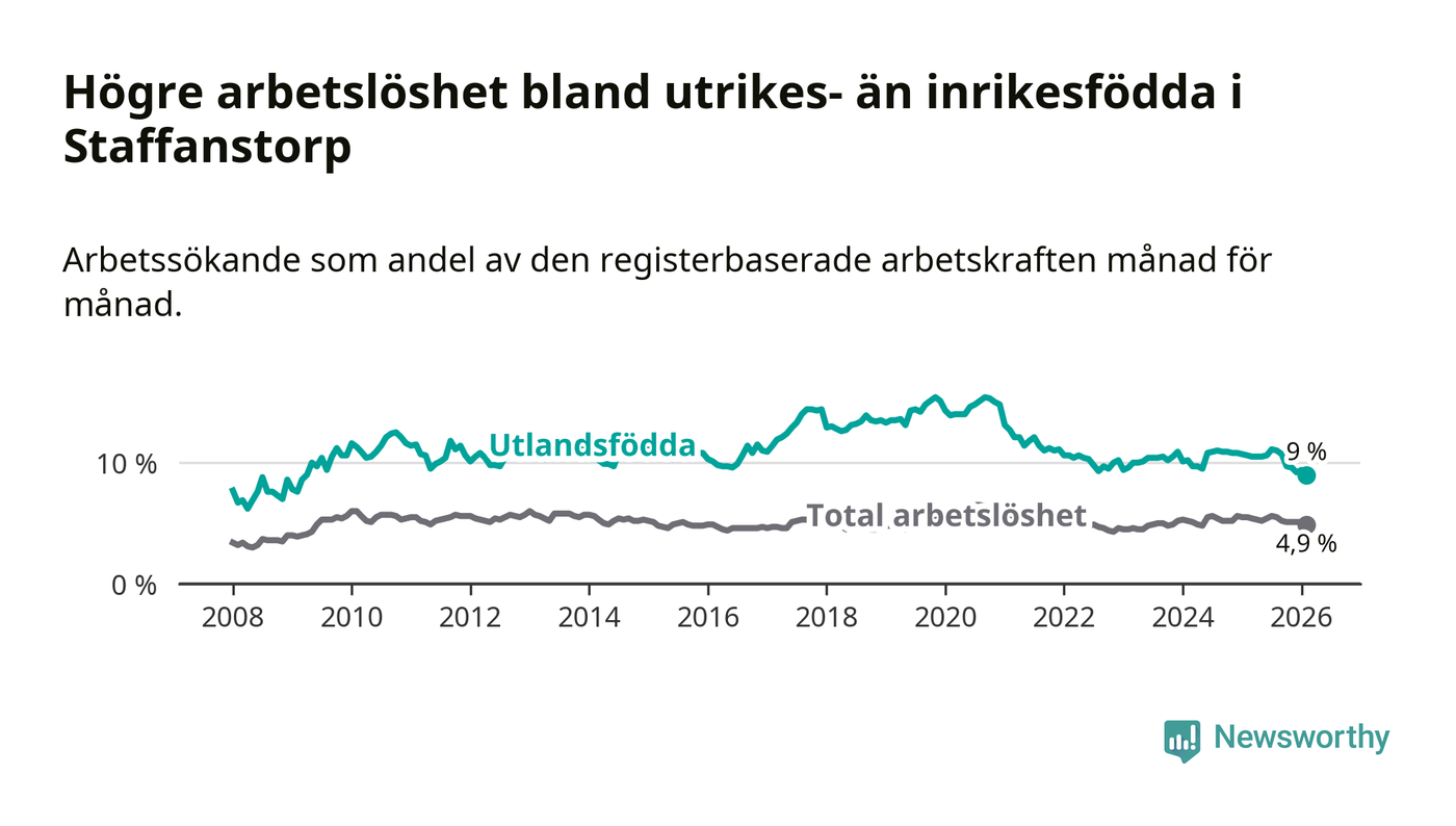 Arbetslösheten bland utlandsfödda var 9,0 procent i Staffanstorp under februari månad, motsvarande 258 av 2 867 personer. Det är 1,6 procentenheter färre än vid samma tidpunkt i fjol (−35 om man räknar personer). Därmed är de utlandsföddas arbetslöshet lägre än vid samma tidpunkt i fjol för sjätte månaden i följd. Sedan augusti 2025 har arbetslösheten bland utlandsfödda minskat från 11,0 till 9,0 procent. Den nuvarande arbetslöshetsnivån är den lägsta sedan april 2009.