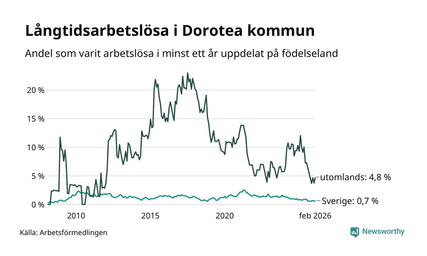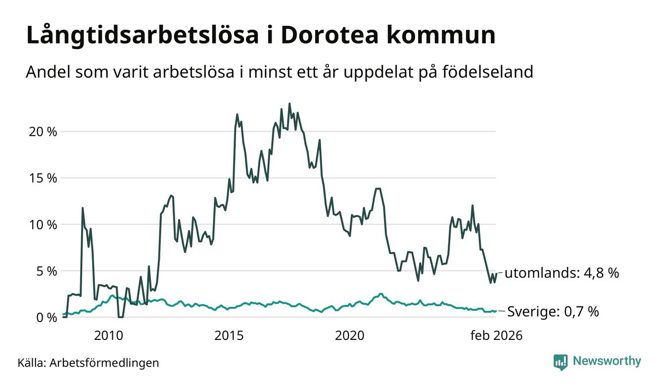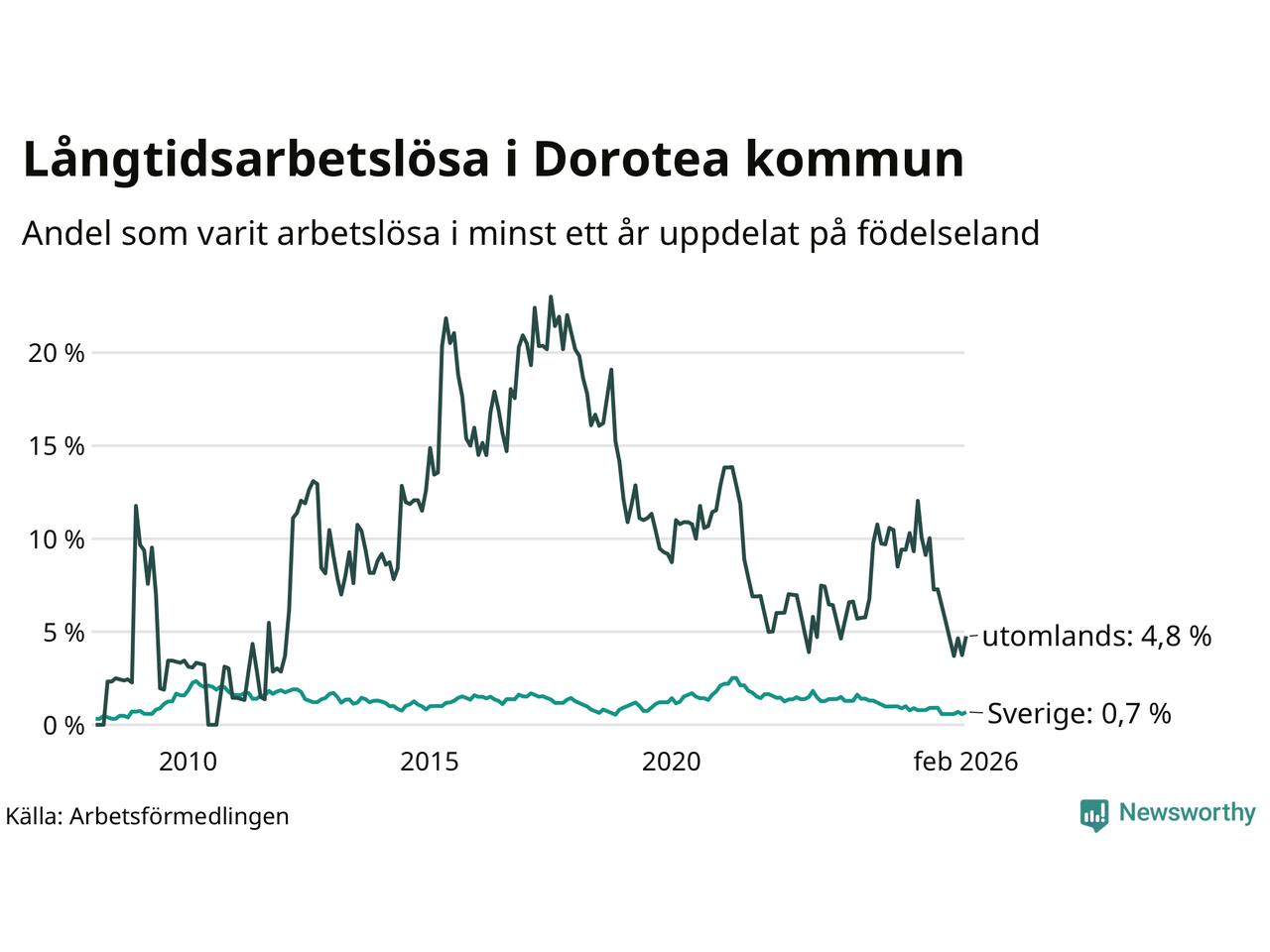 Sex av de långtidsarbetslösa i Dorotea är födda i Sverige, medan fem är födda utomlands. Det innebär att långtidsarbetslösheten bland Sverigefödda är 0,7 procent, medan den är 4,8 procent bland födda utomlands. Även i riket som helhet är arbetslösheten högre bland utrikesfödda.