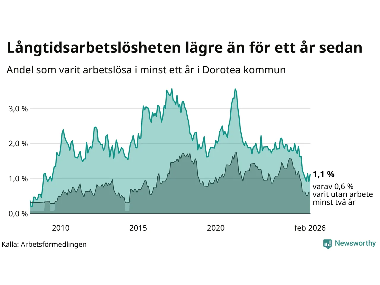 Andelen som varit utan arbete i minst ett år i Dorotea var lägre i februari jämfört med samma månad för ett år sedan. Det visar Arbetsfömedlingens senaste månadsstatistik.