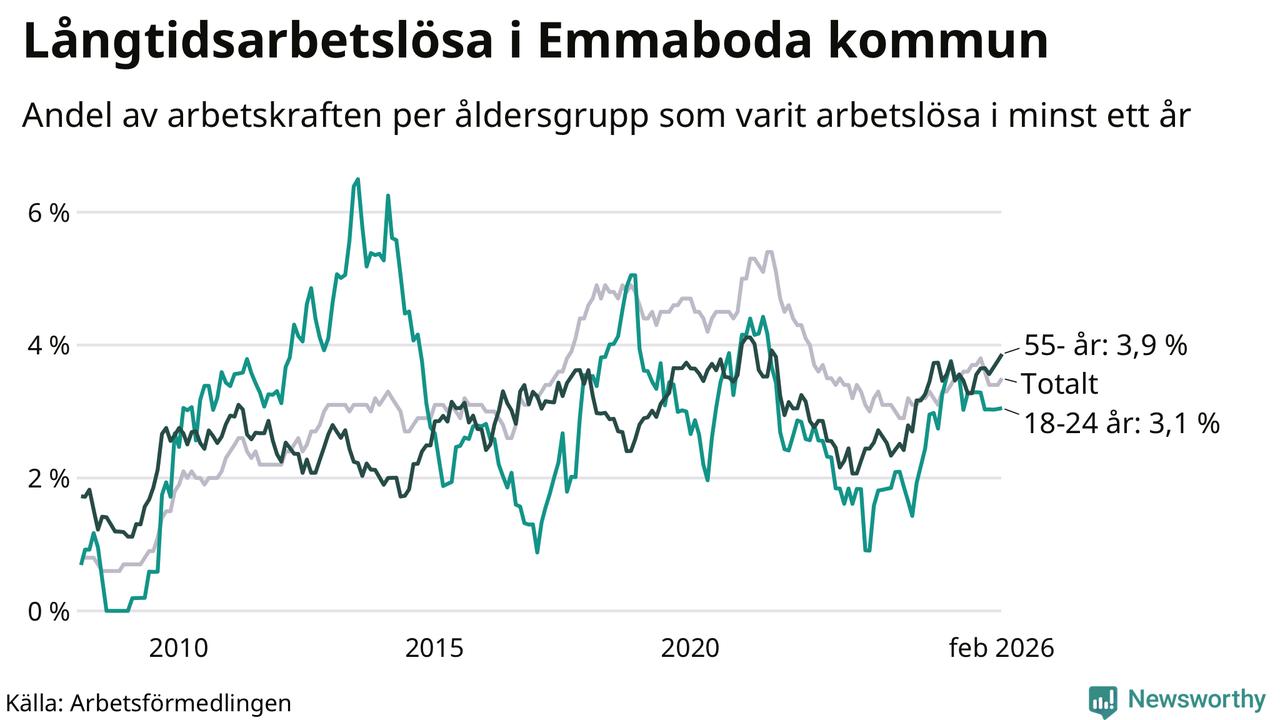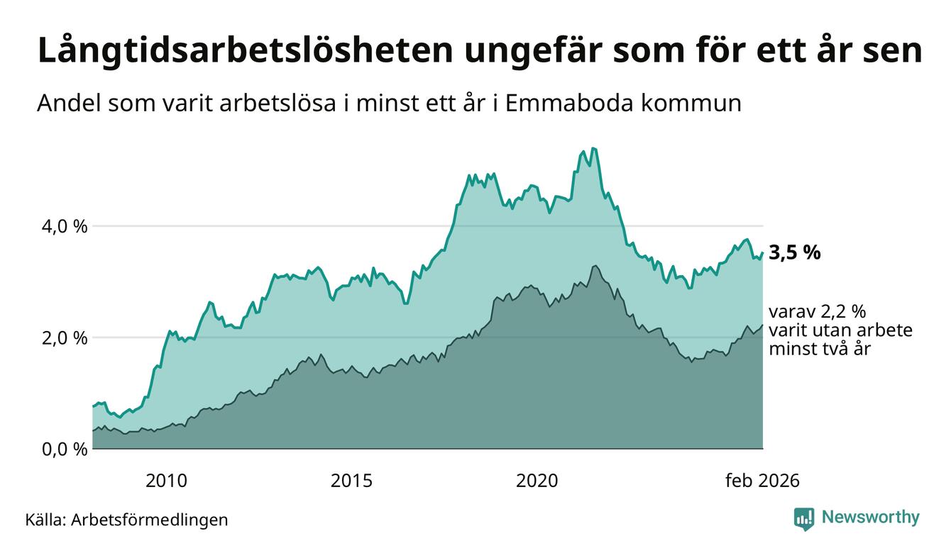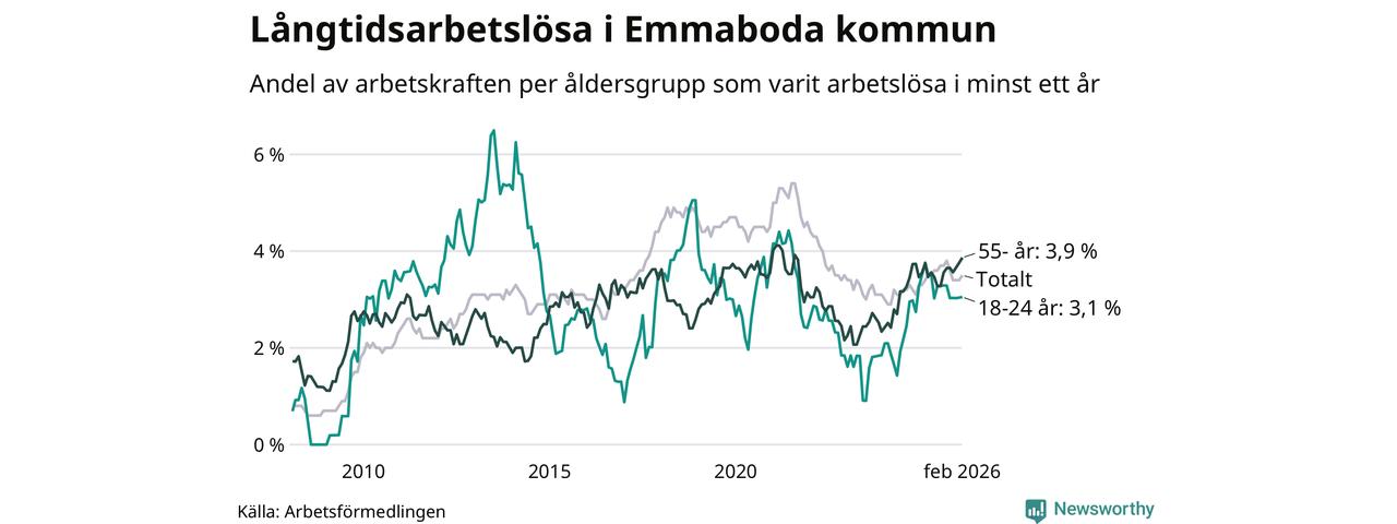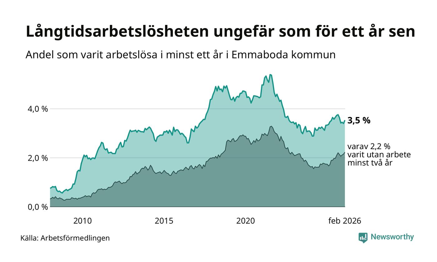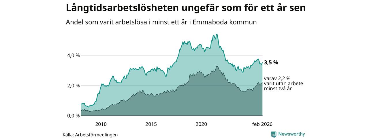I februari hade 141 Emmabodabor varit arbetslösa i minst ett år, vilket är fem fler än månaden innan. 141 personer motsvarar 3,5 procent av arbetskraften i kommunen – andelen långtidsarbetslösa är ungefär på samma nivå som för ett år sedan.