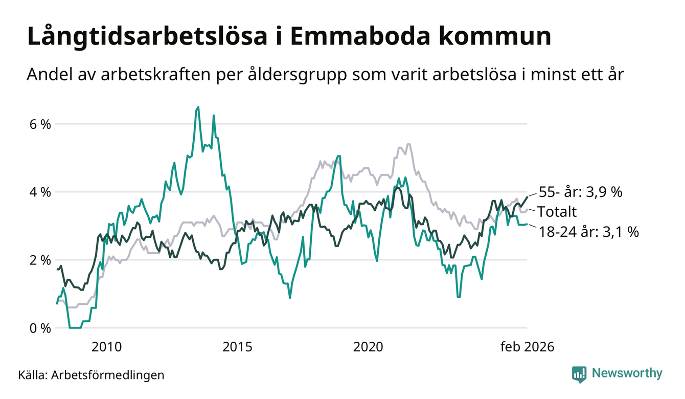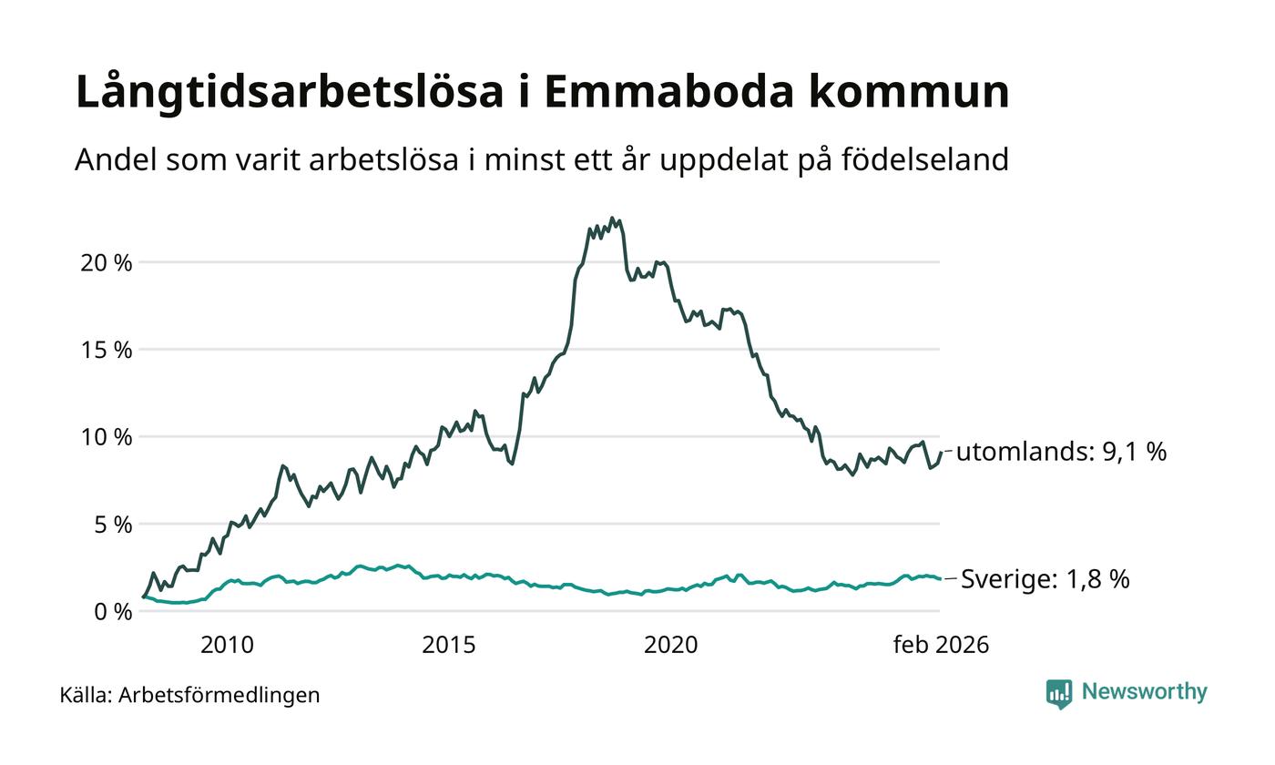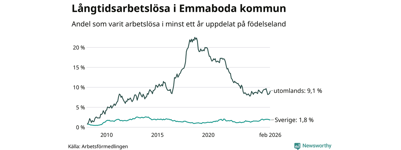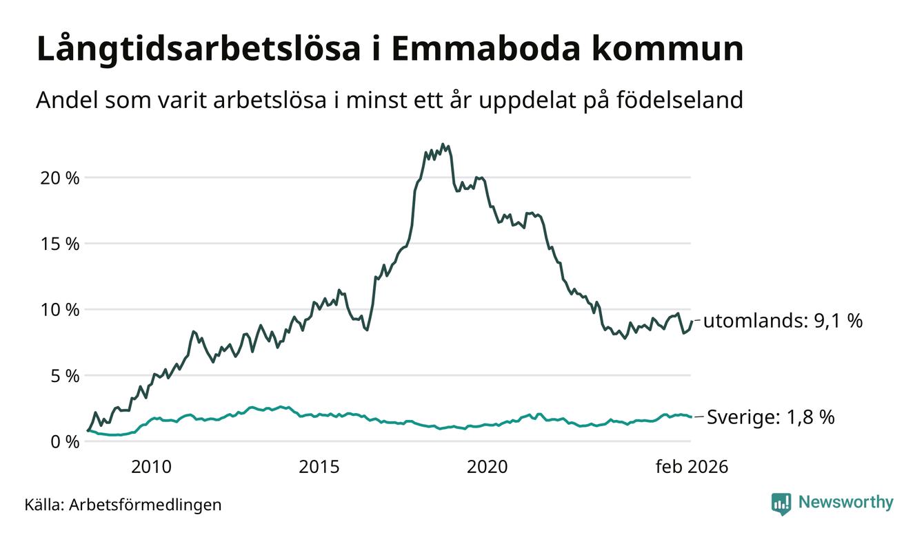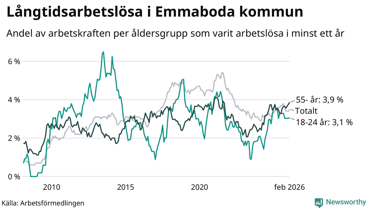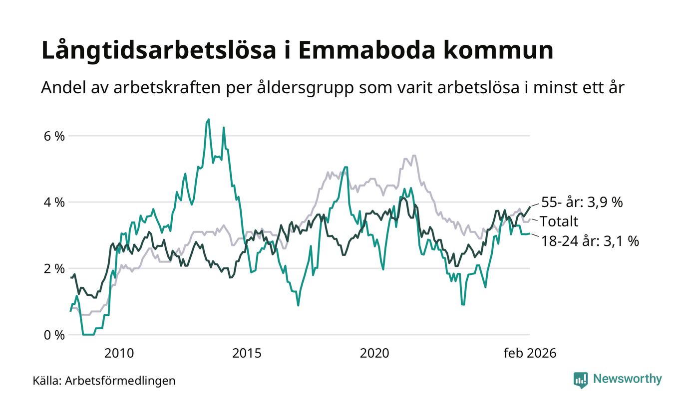 I februari hade 141 Emmabodabor varit arbetslösa i minst ett år, vilket är fem fler än månaden innan. 141 personer motsvarar 3,5 procent av arbetskraften i kommunen – andelen långtidsarbetslösa är ungefär på samma nivå som för ett år sedan.