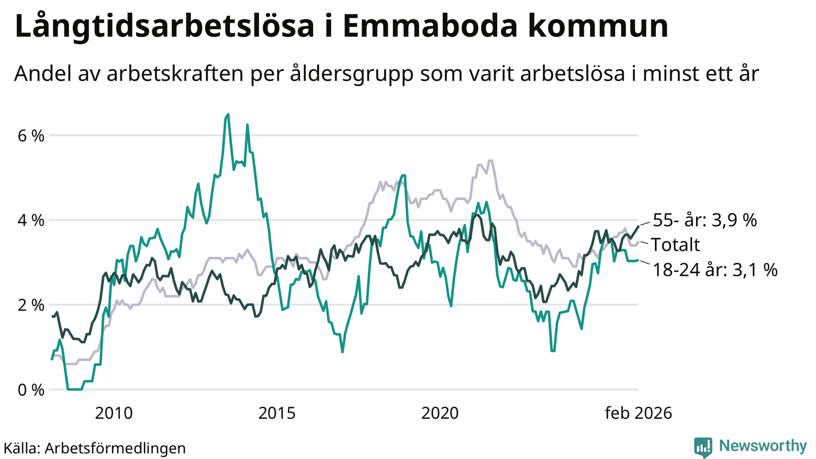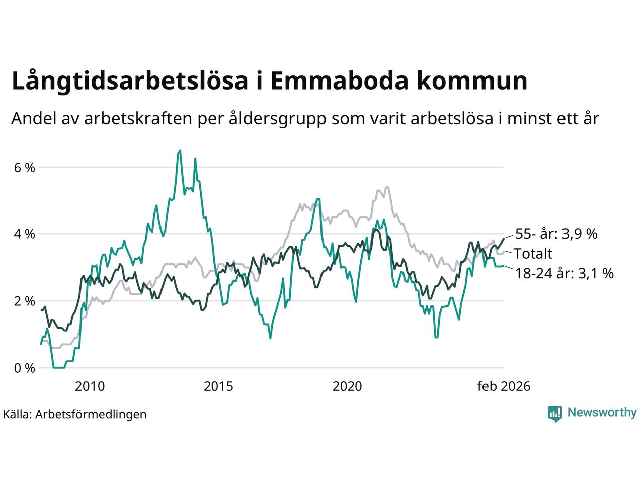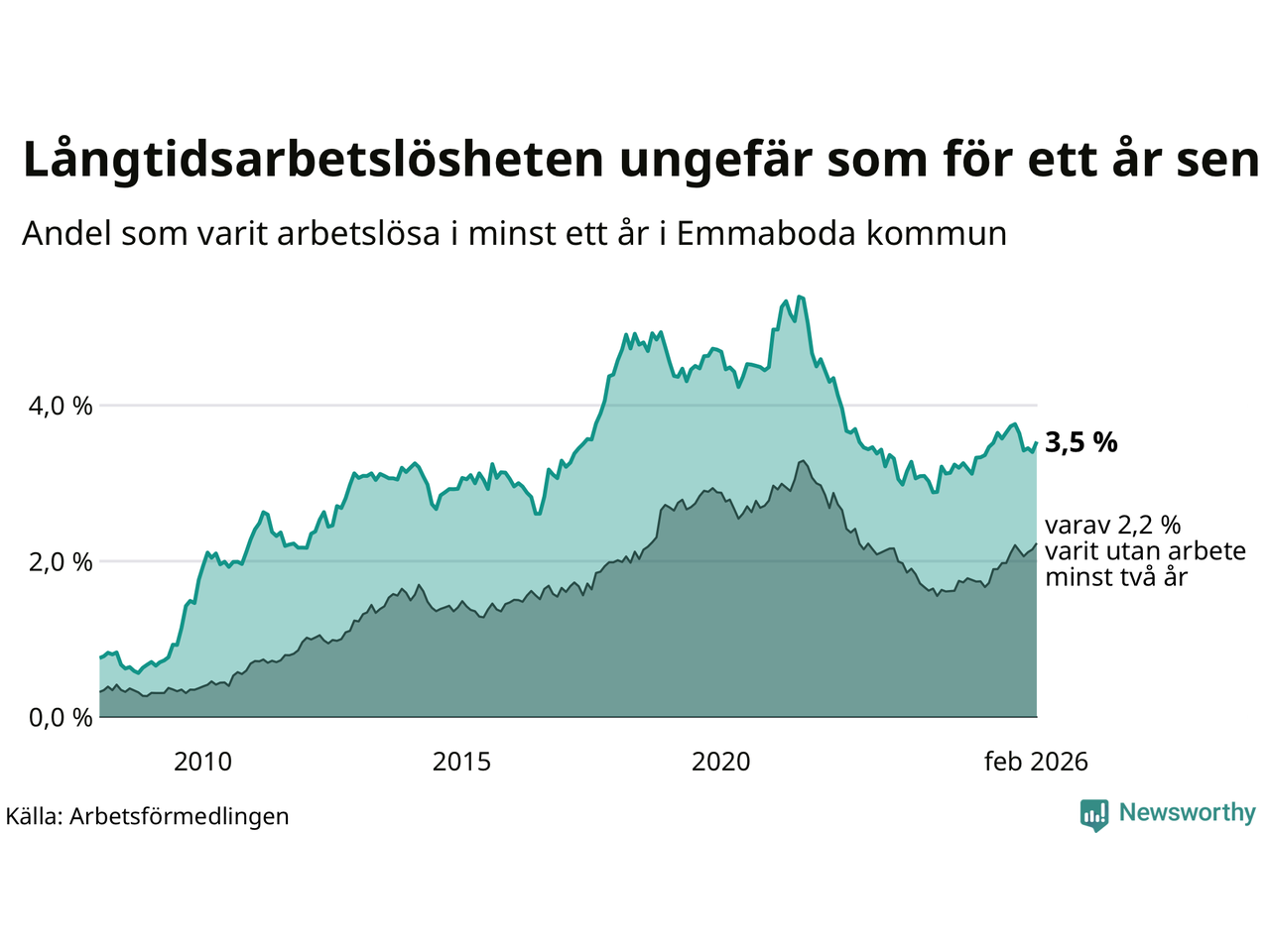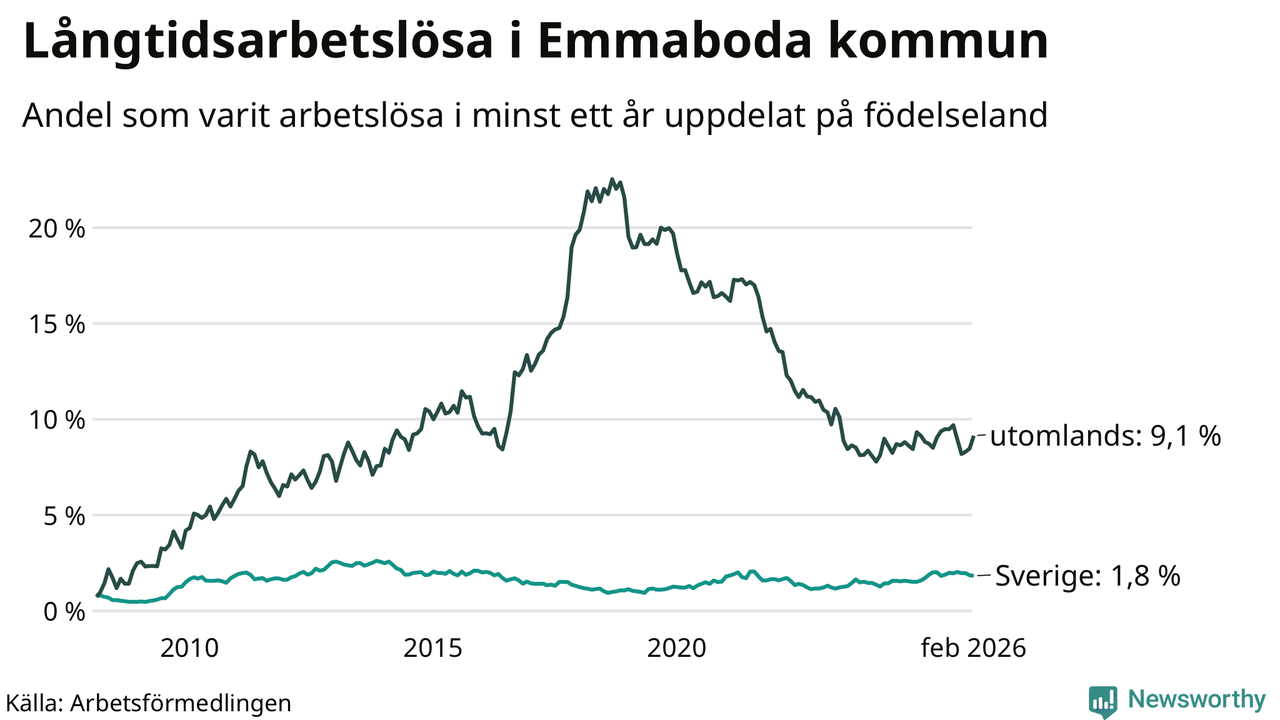 I februari hade 141 Emmabodabor varit arbetslösa i minst ett år, vilket är fem fler än månaden innan. 141 personer motsvarar 3,5 procent av arbetskraften i kommunen – andelen långtidsarbetslösa är ungefär på samma nivå som för ett år sedan.