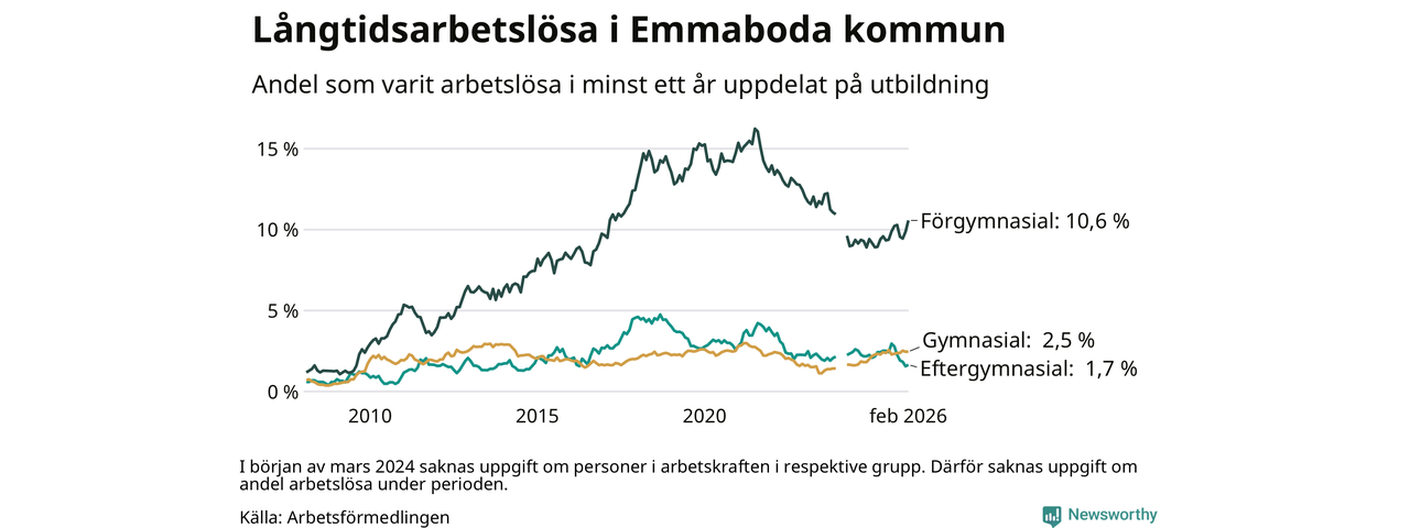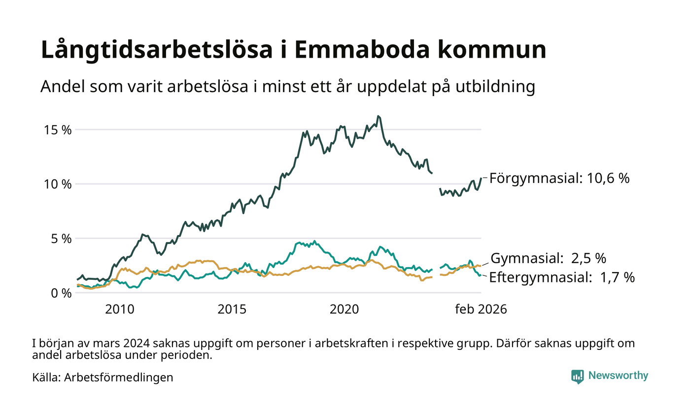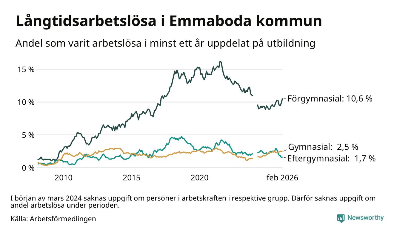 Andelen som varit utan arbete i minst ett år i Emmaboda var ungefär lika stor i februari jämfört med samma månad för ett år sedan. Det visar Arbetsfömedlingens senaste månadsstatistik.