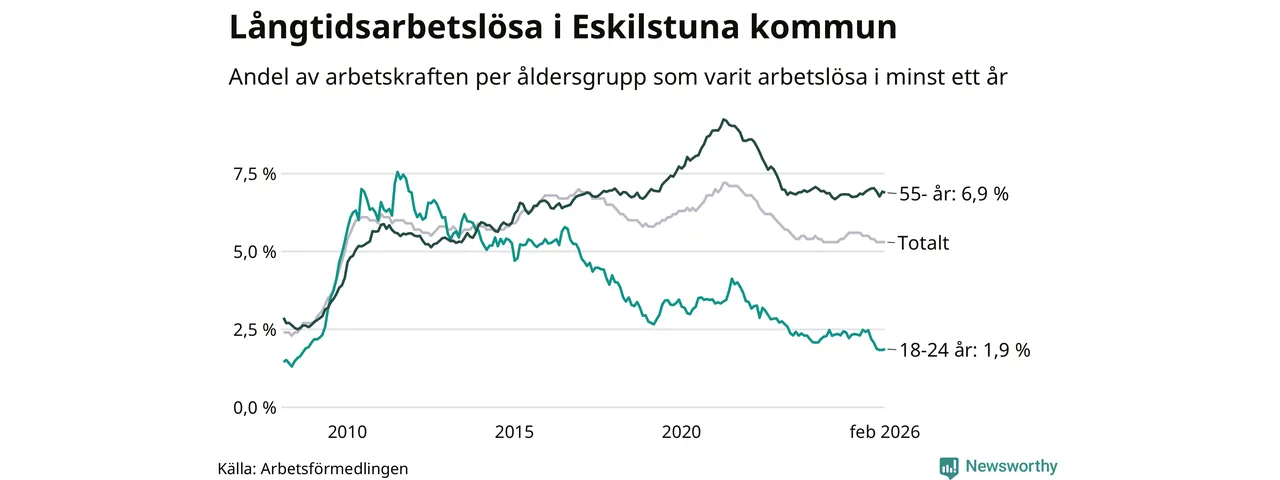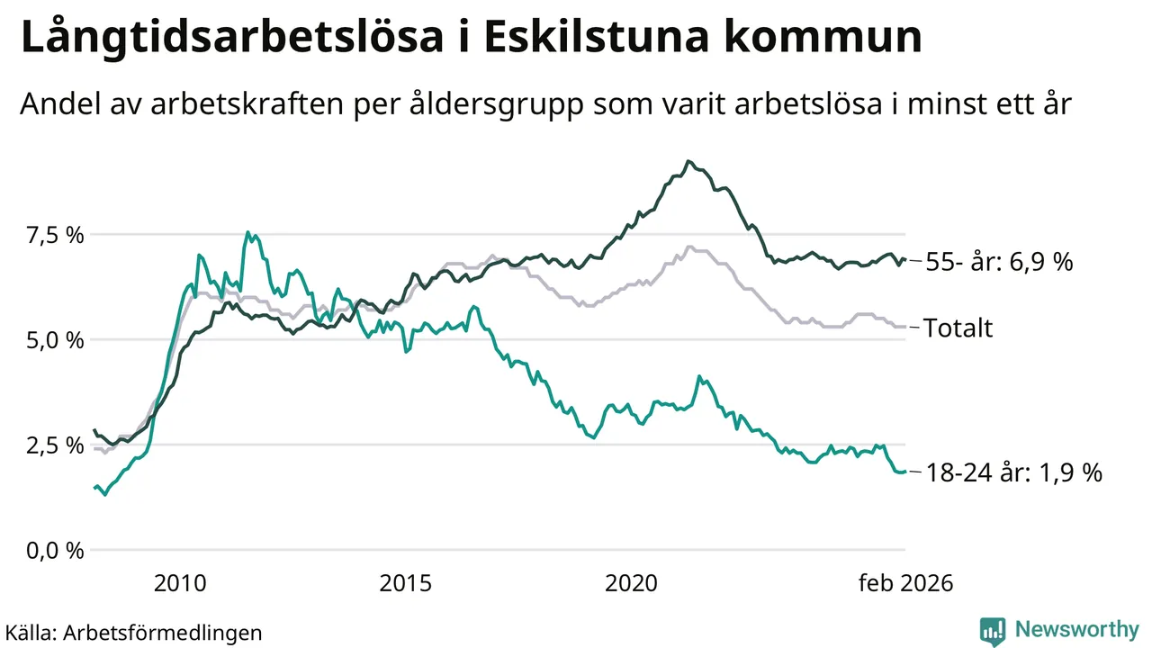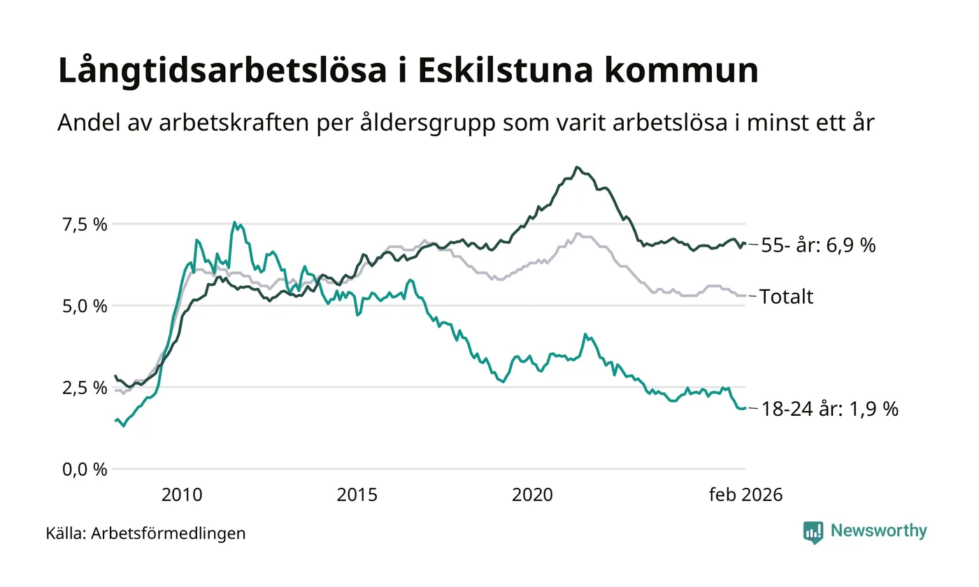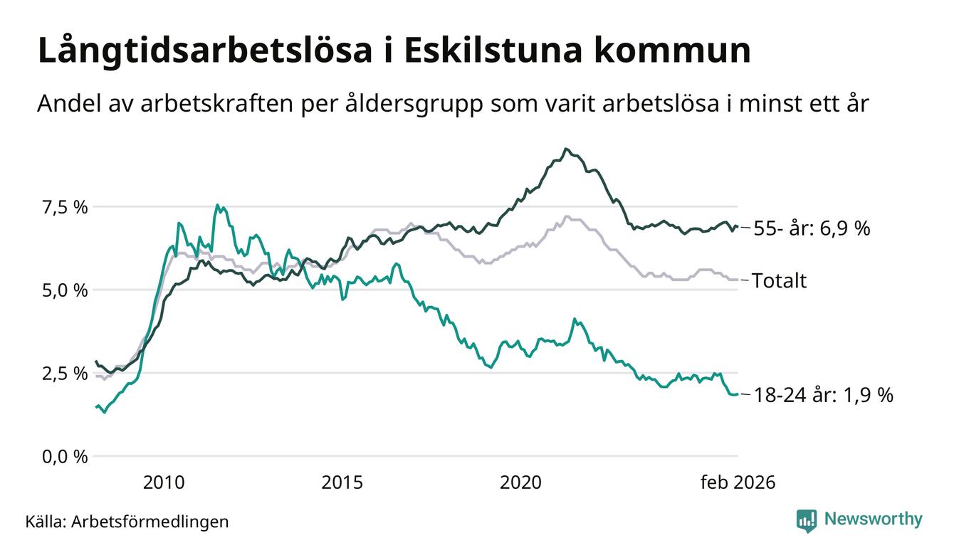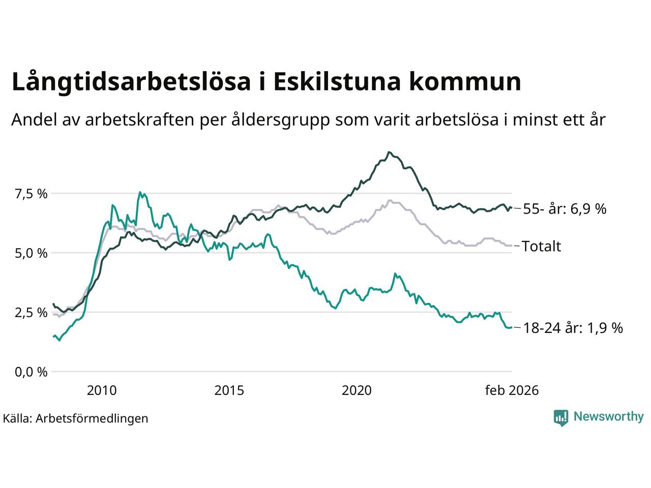 Av de 2 787 personerna som varit arbetslösa i mer än ett år i Eskilstuna kommun är 796 personer mellan 55 och 661 år och 106 är mellan 18 och 24 år. För den äldre gruppen är andelen arbetslösa 6,9 procent medan den i den yngre gruppen är 1,9 procent. Även i riket som helhet är långtidsarbetslösheten högre i gruppen äldre.