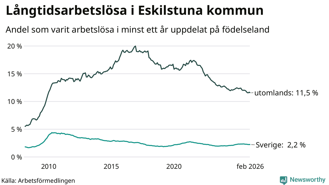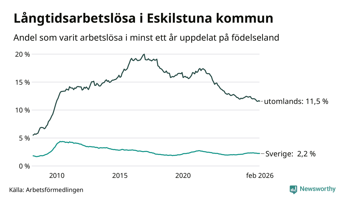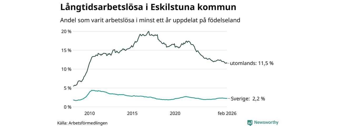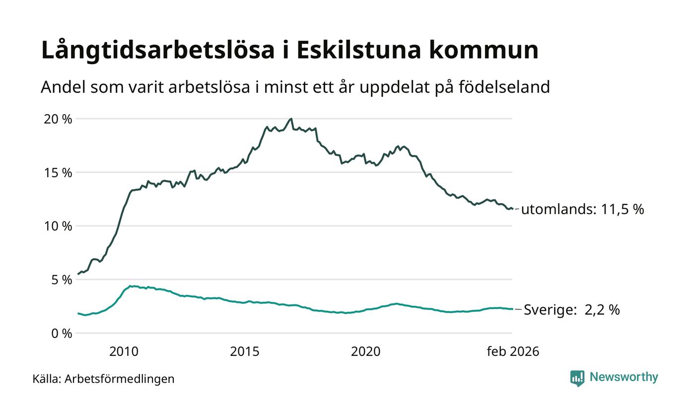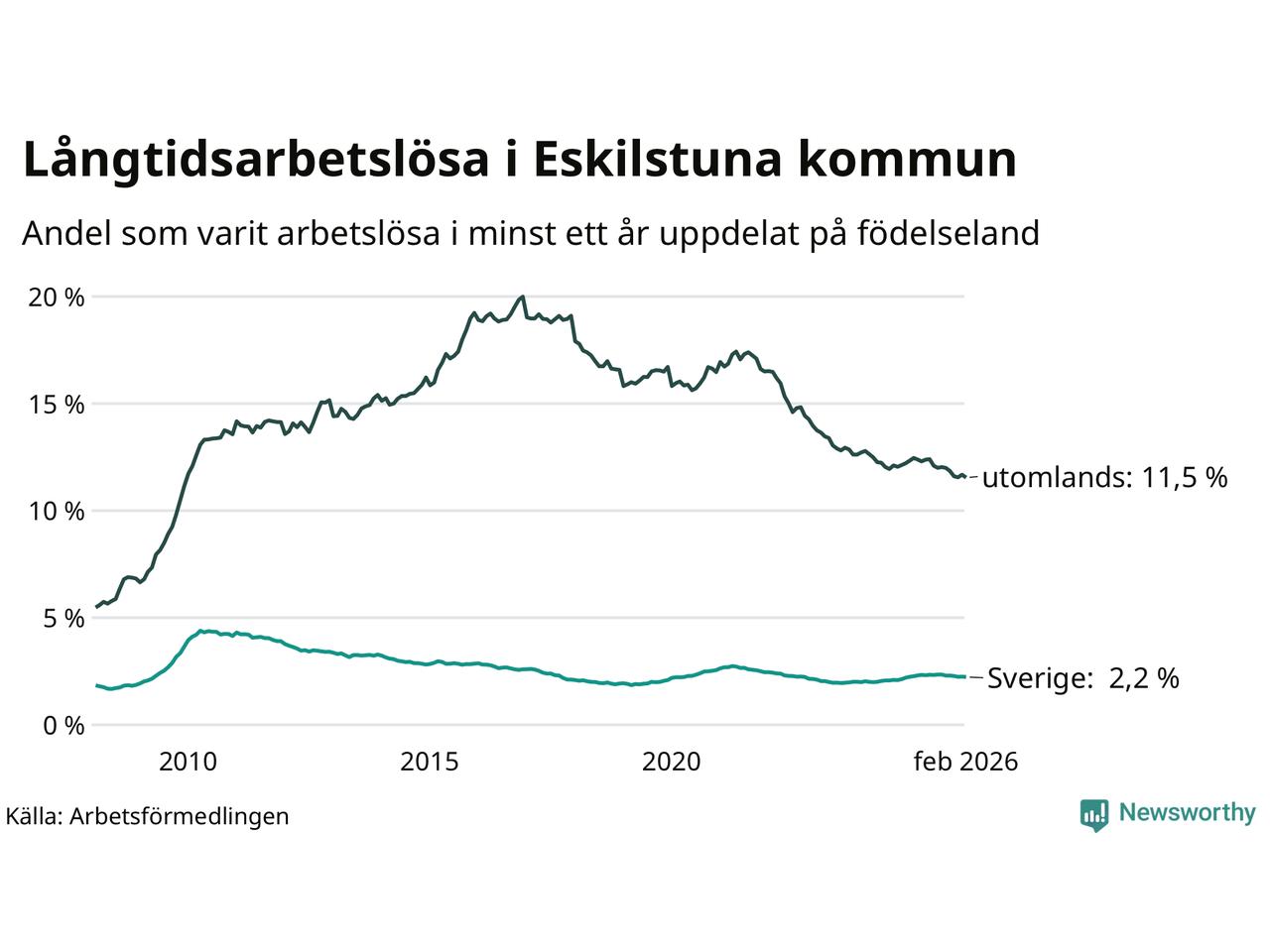 800 av de långtidsarbetslösa i Eskilstuna är födda i Sverige, medan 1 987 är födda utomlands. Det innebär att långtidsarbetslösheten bland Sverigefödda är 2,2 procent, medan den är fem gånger så hög – 11,5 procent – bland födda utomlands. Även i riket som helhet är arbetslösheten högre bland utrikesfödda.
