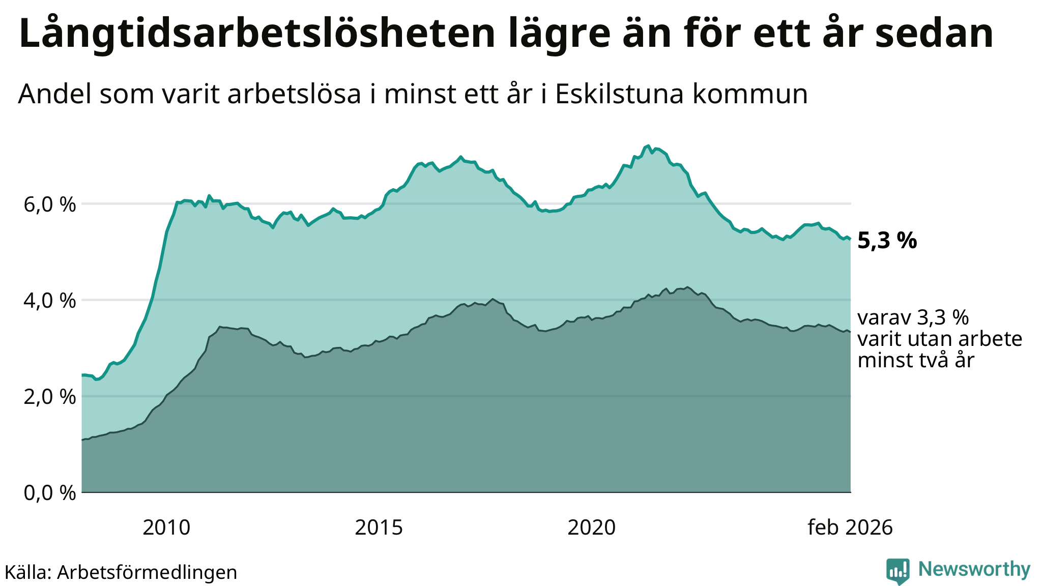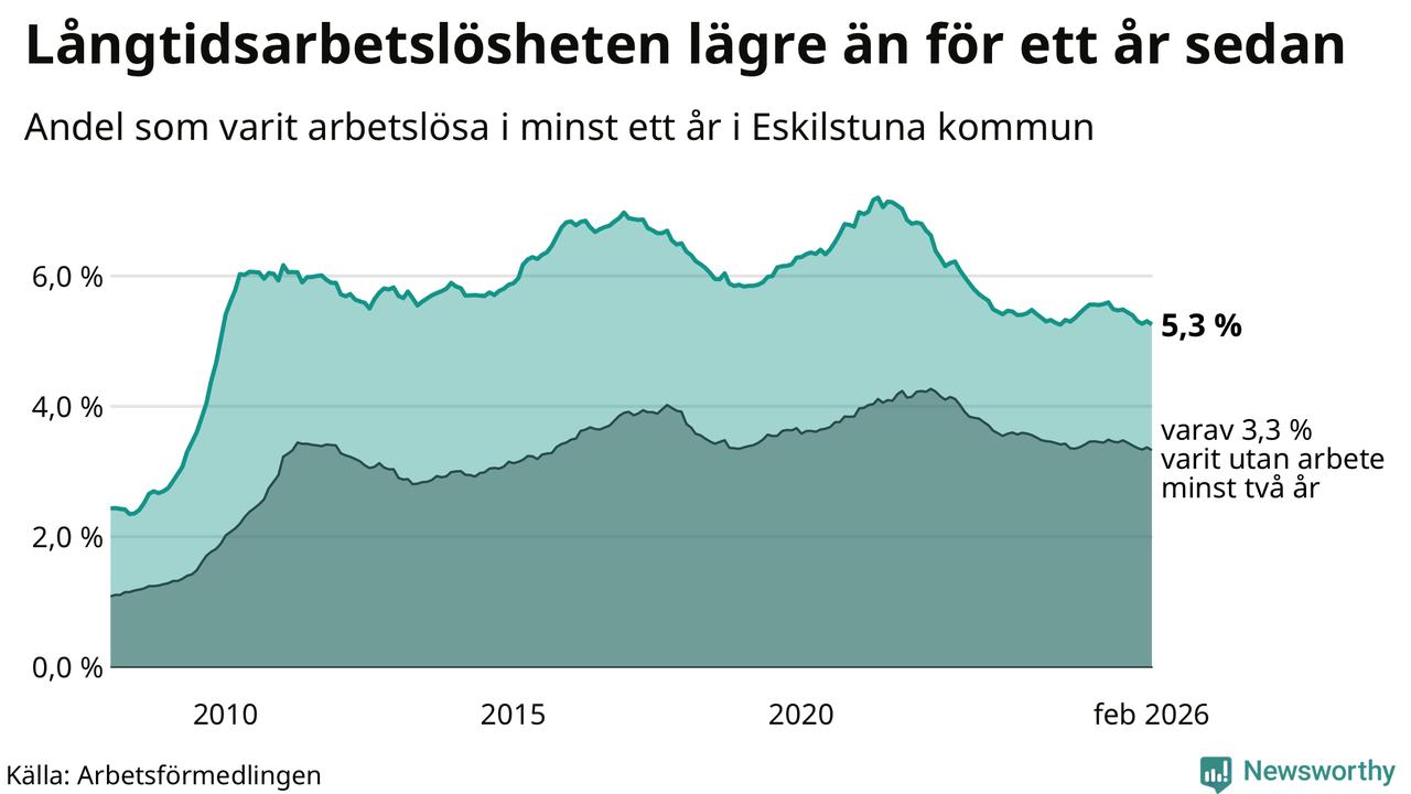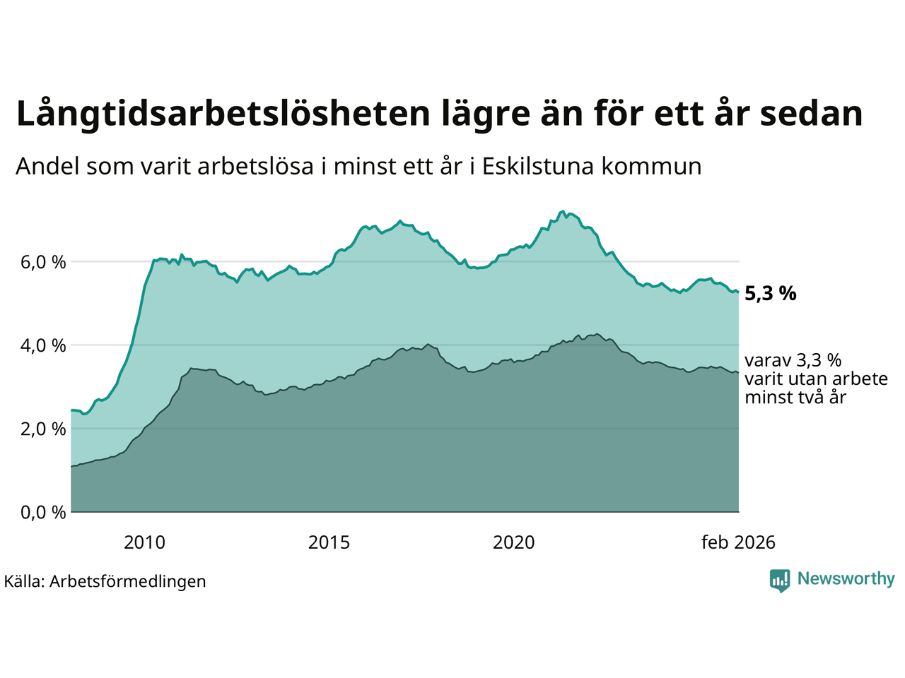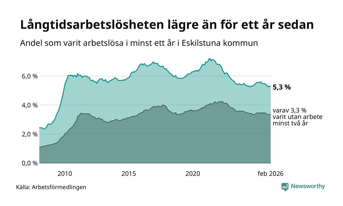 I februari hade 2 787 Eskilstunabor varit arbetslösa i minst ett år, vilket är 28 färre än månaden innan. 2 787 personer motsvarar 5,3 procent av arbetskraften i kommunen – andelen långtidsarbetslösa är 0,3 procentenheter lägre än samma månad för ett år sedan. Eskilstuna tillhör de kommuner som har högst andel långtidsarbetslösa i hela landet just nu.