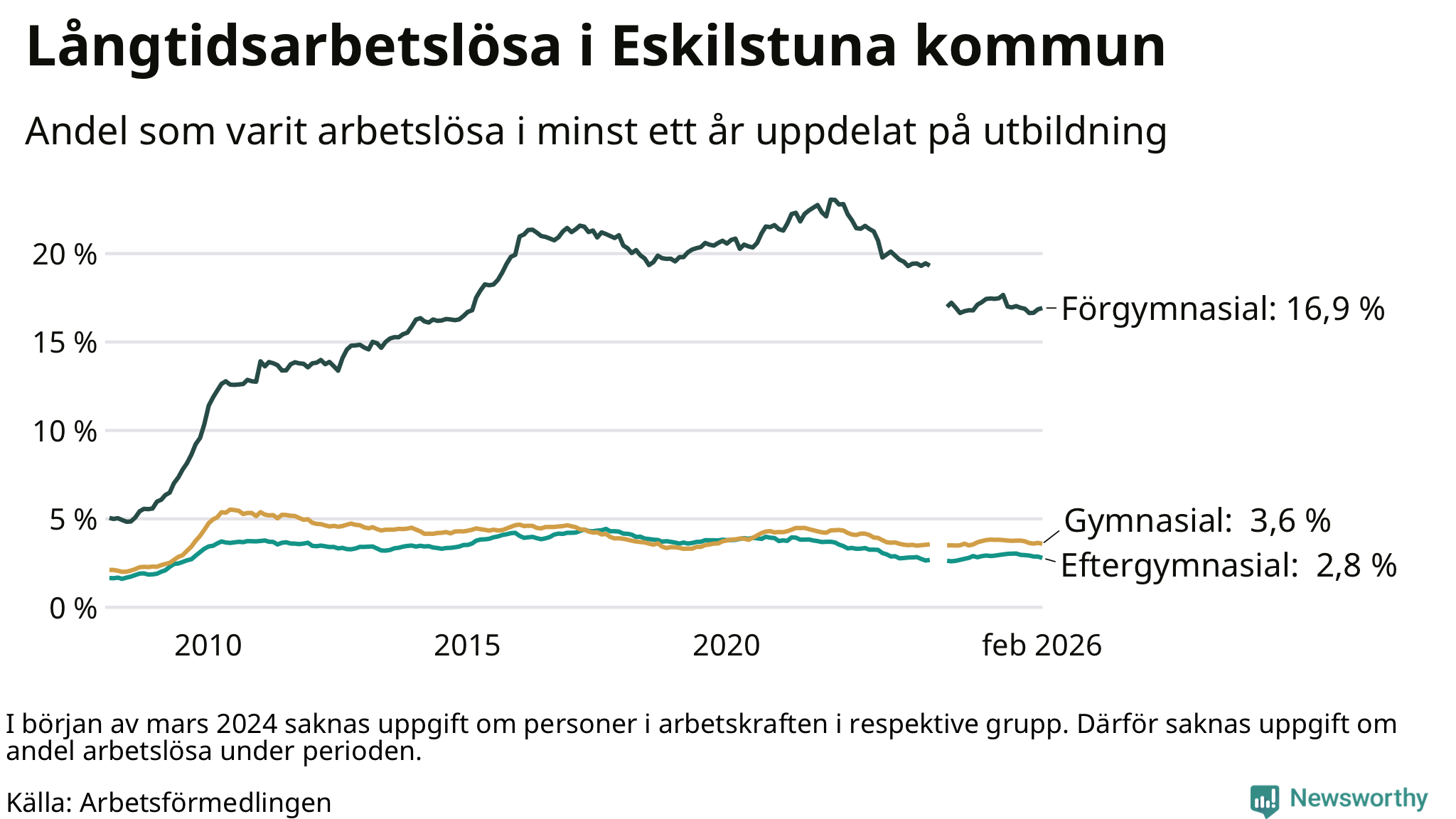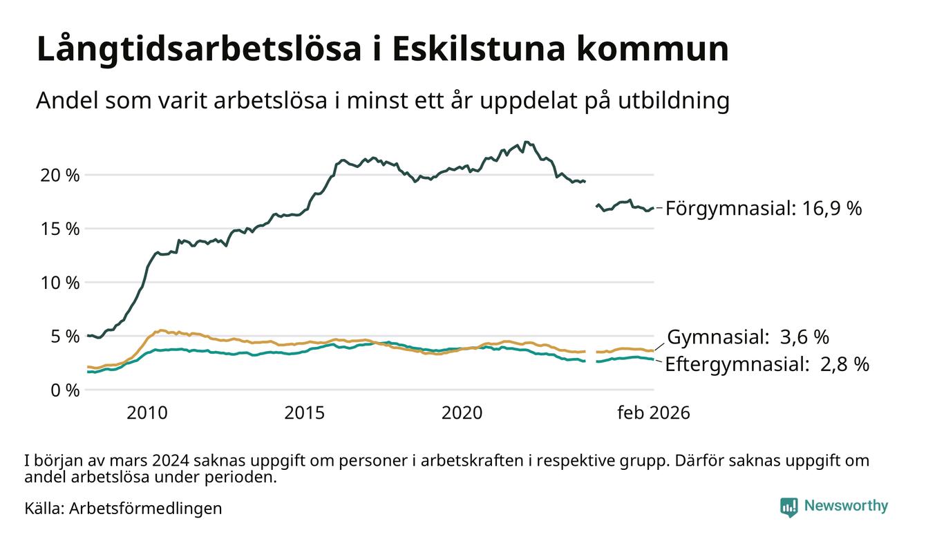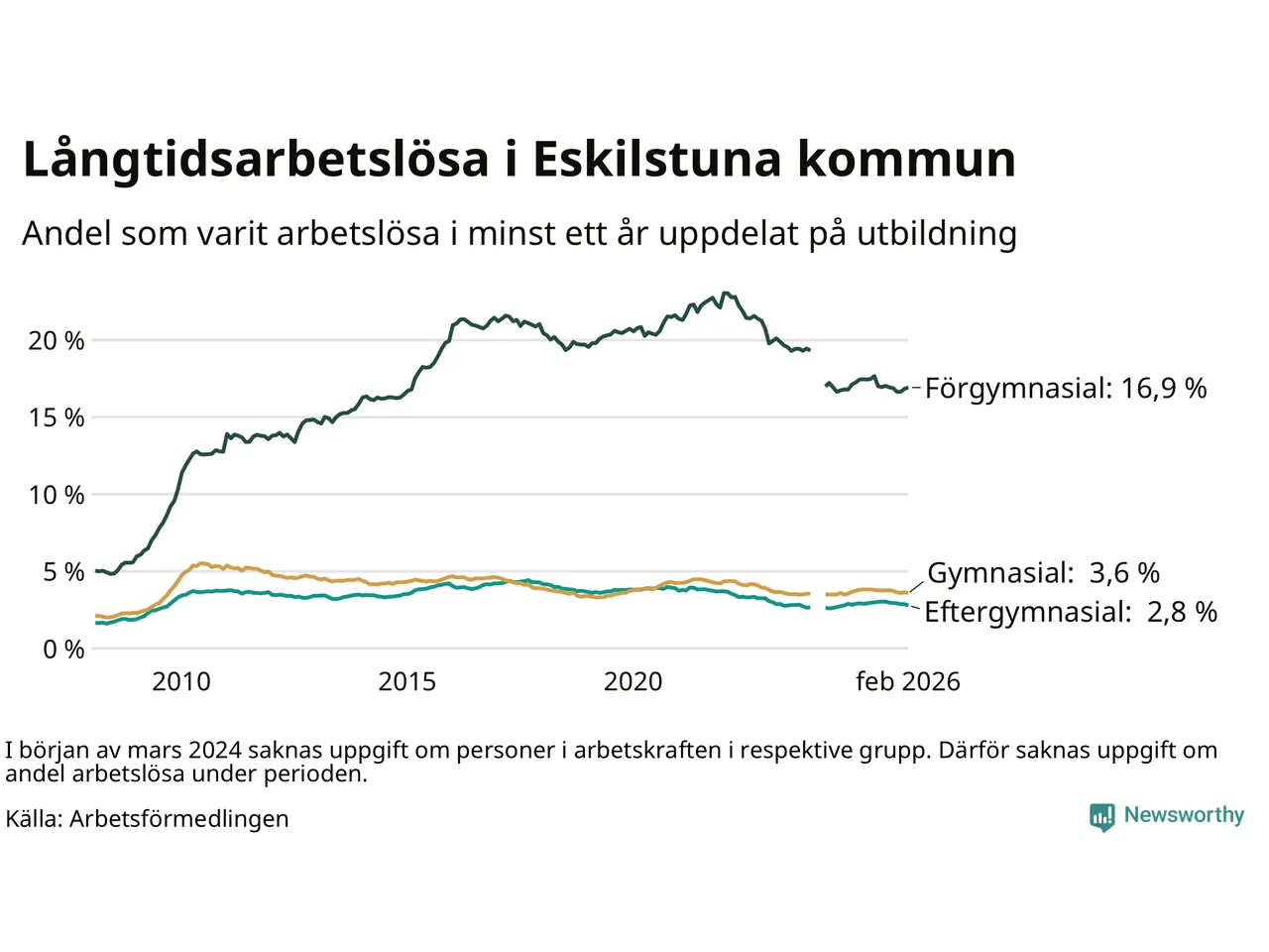 I februari hade 2 787 Eskilstunabor varit arbetslösa i minst ett år, vilket är 28 färre än månaden innan. 2 787 personer motsvarar 5,3 procent av arbetskraften i kommunen – andelen långtidsarbetslösa är 0,3 procentenheter lägre än samma månad för ett år sedan. Eskilstuna tillhör de kommuner som har högst andel långtidsarbetslösa i hela landet just nu.