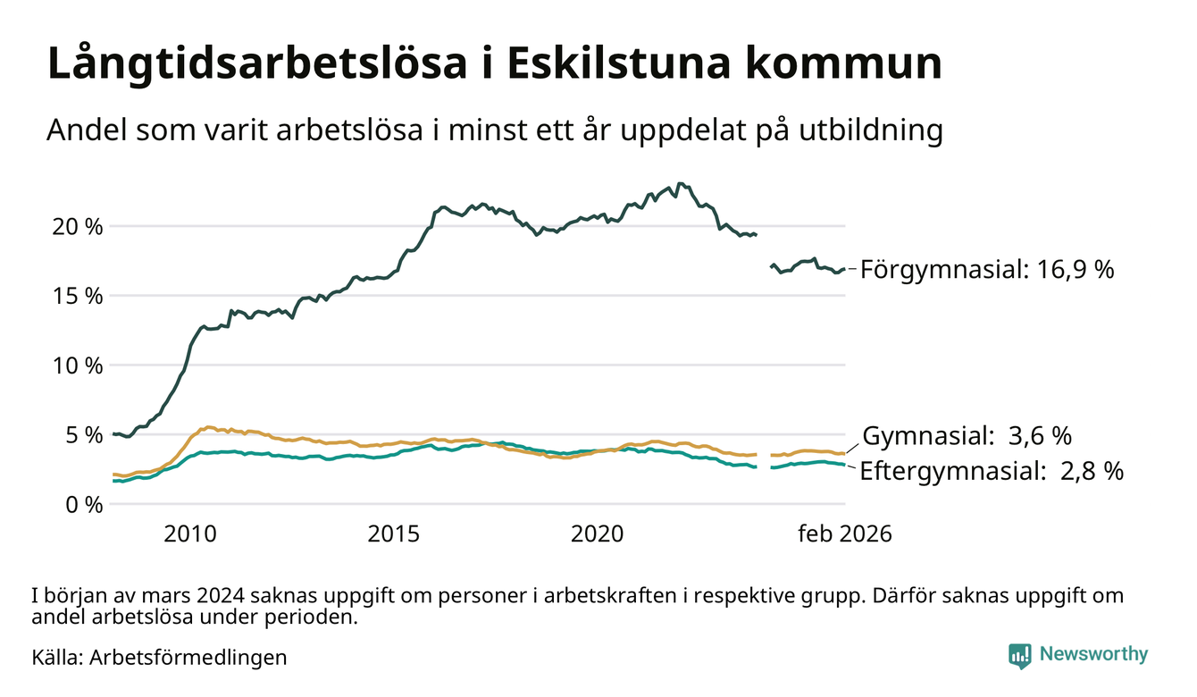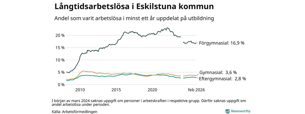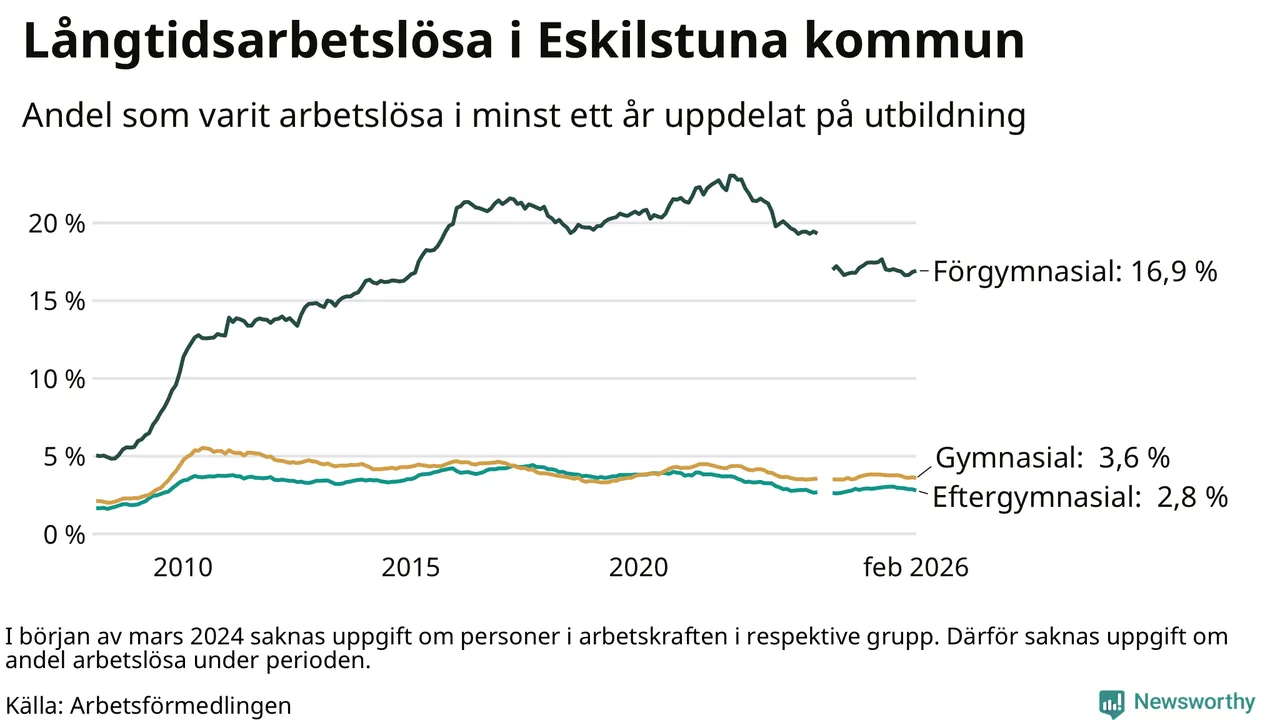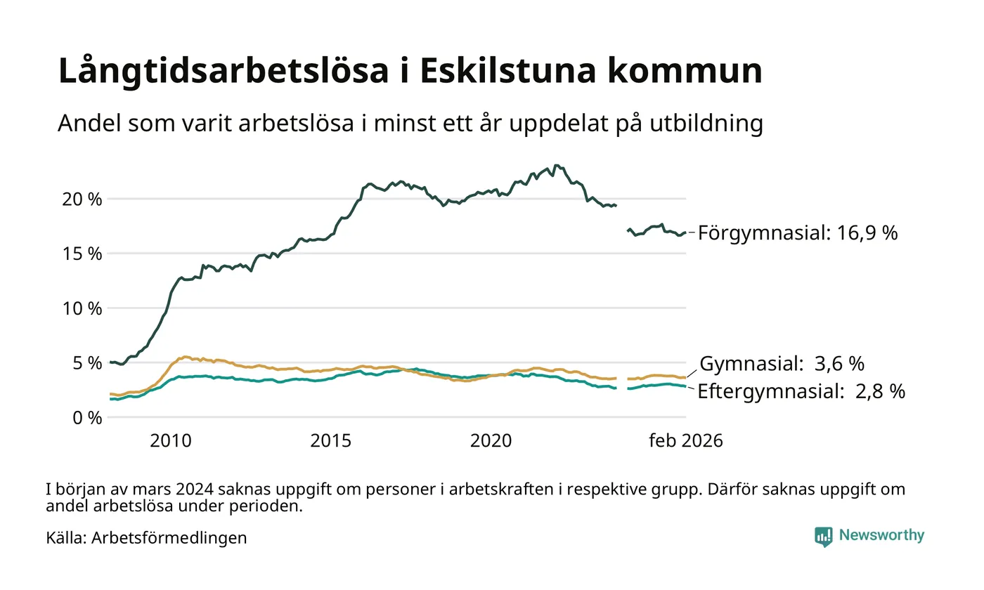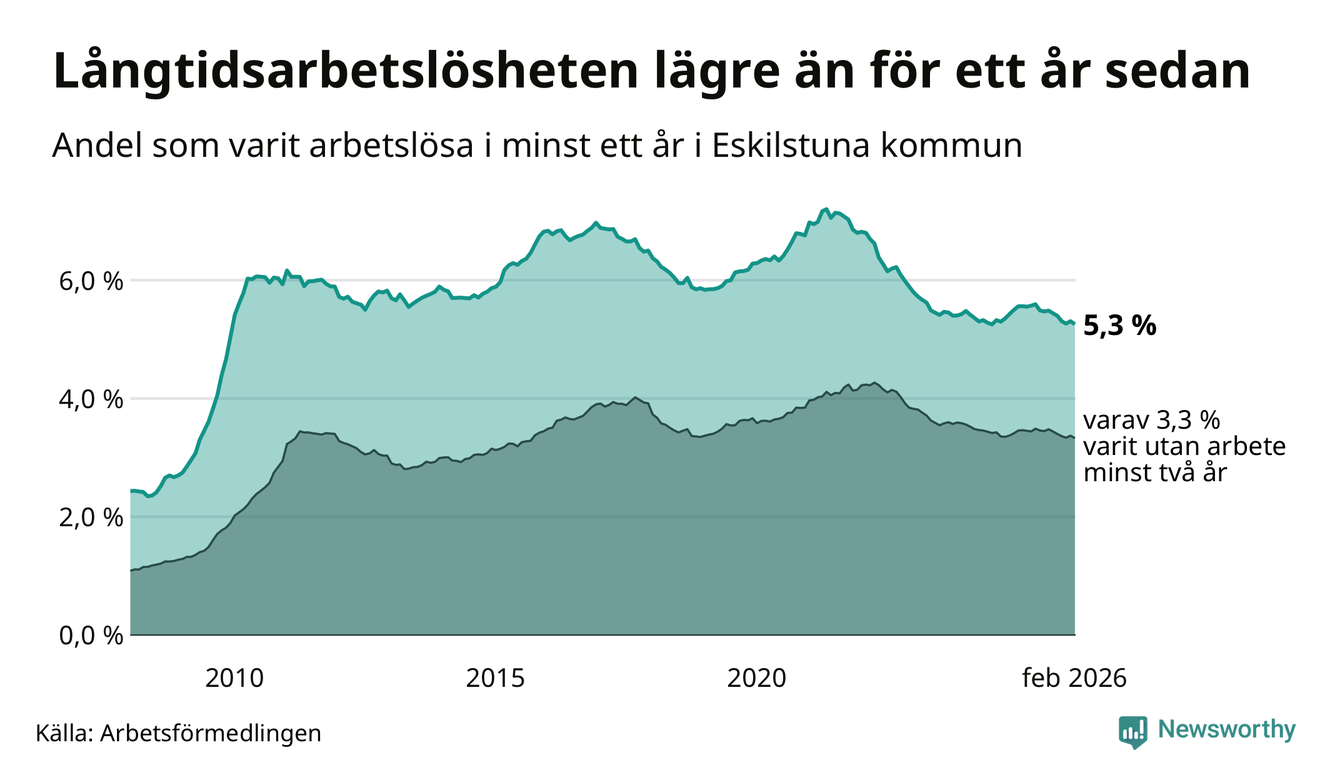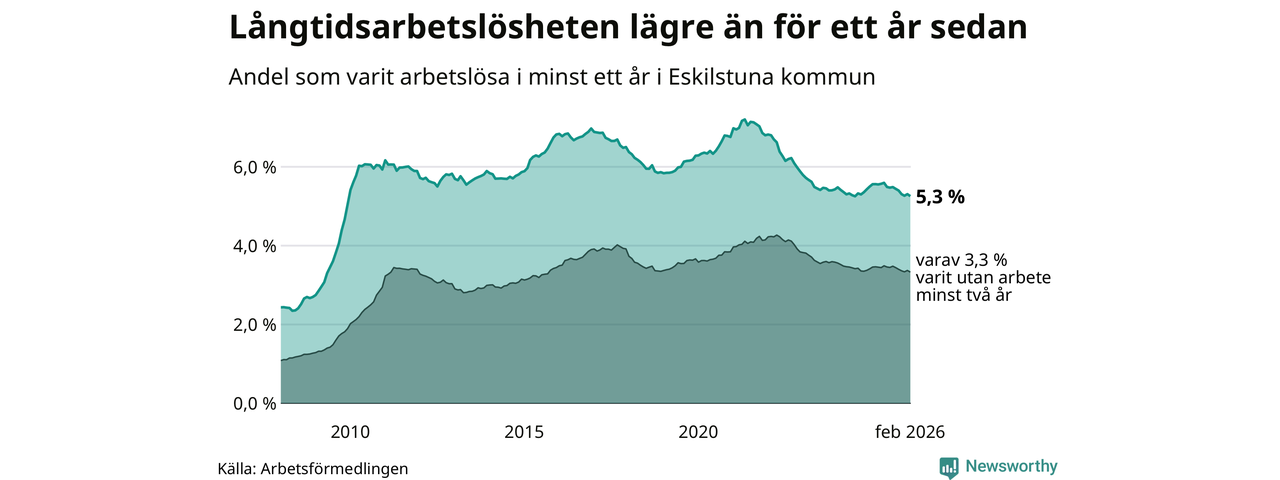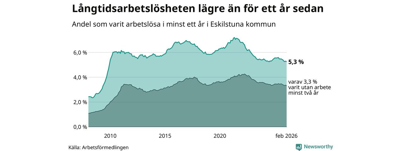 Andelen som varit utan arbete i minst ett år i Eskilstuna var lägre i februari jämfört med samma månad för ett år sedan. Det visar Arbetsfömedlingens senaste månadsstatistik.
