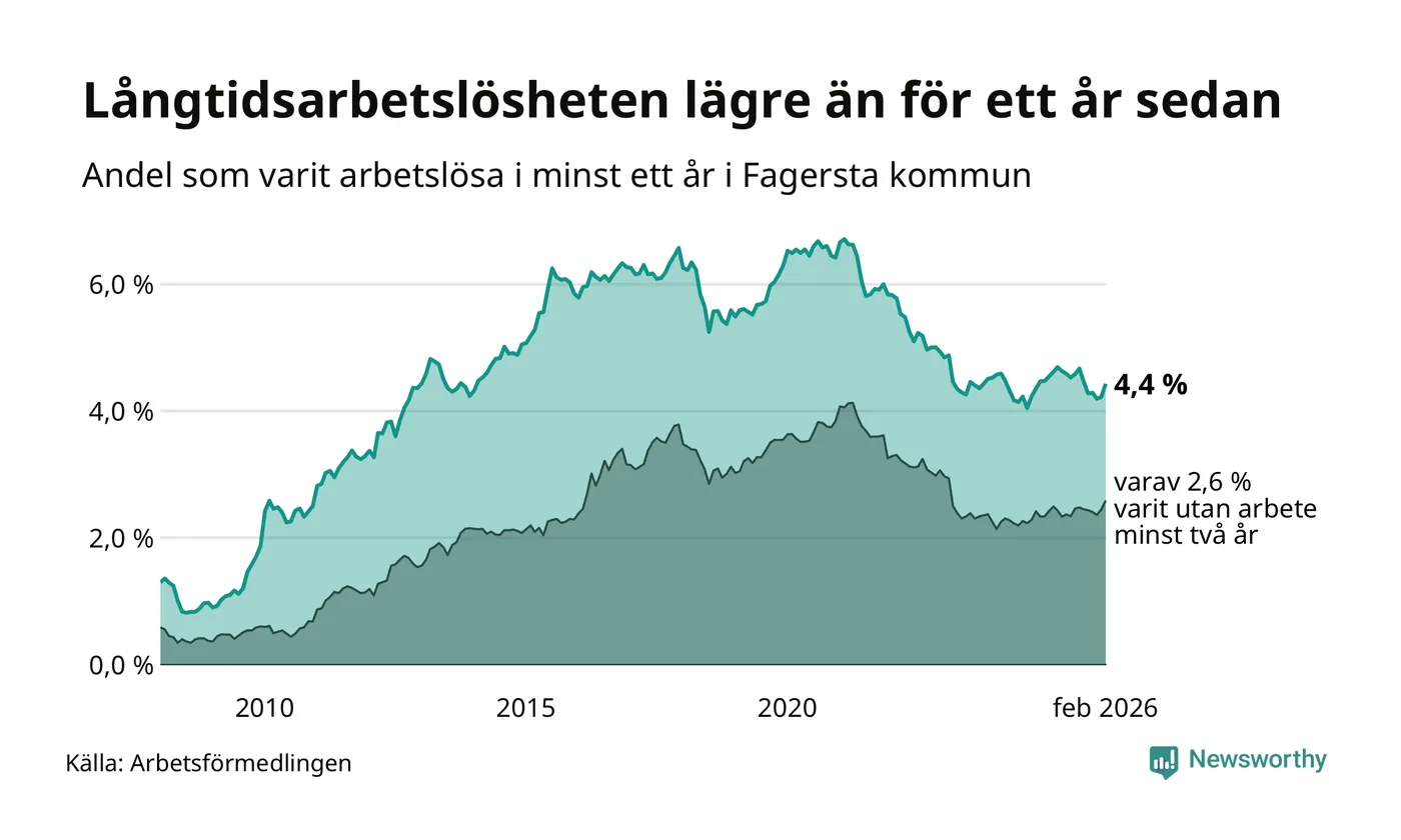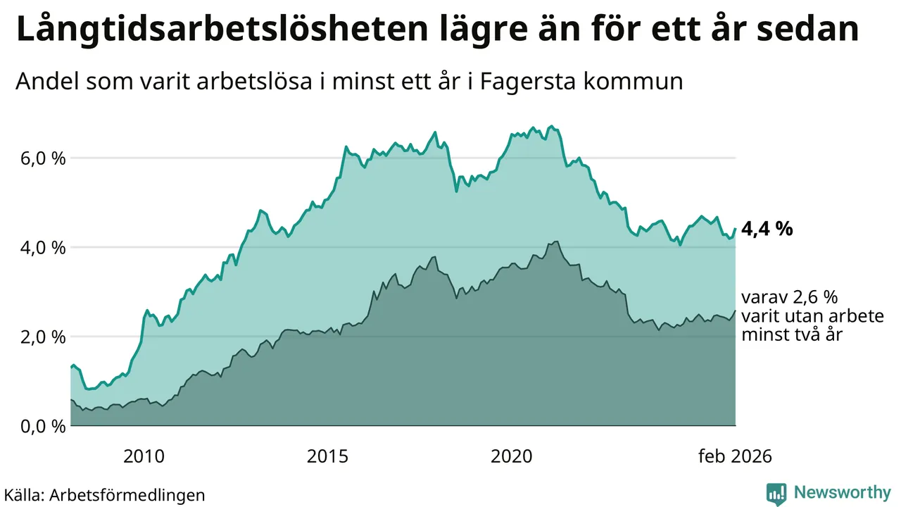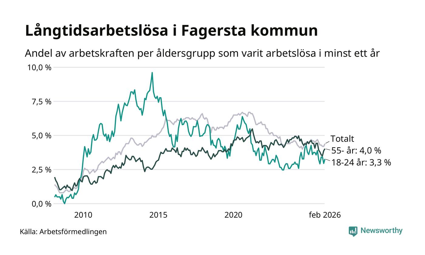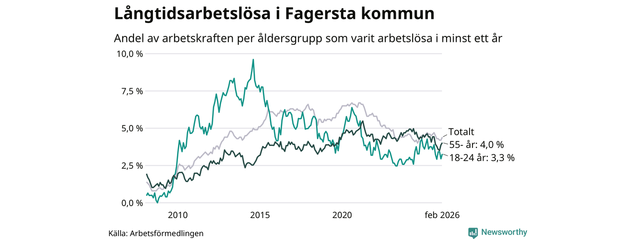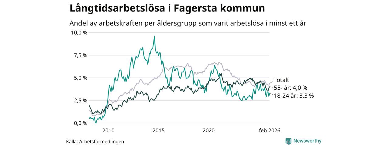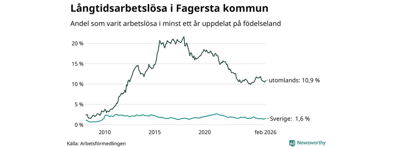 I februari hade 262 Fagerstabor varit arbetslösa i minst ett år, vilket är tolv fler än månaden innan. 262 personer motsvarar 4,4 procent av arbetskraften i kommunen – andelen långtidsarbetslösa är 0,2 procentenheter lägre än samma månad för ett år sedan. Fagersta tillhör de kommuner som har högst andel långtidsarbetslösa i hela landet just nu.