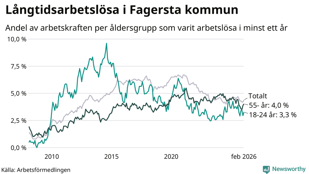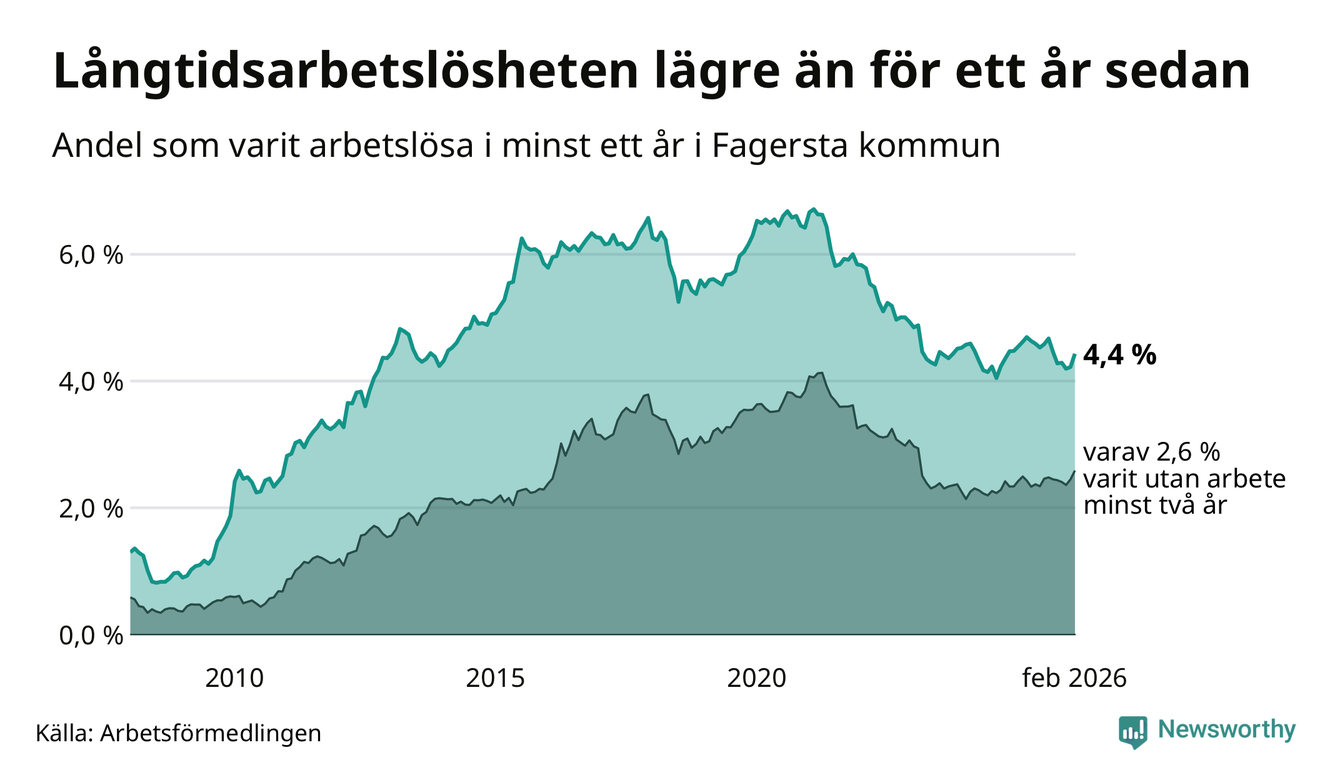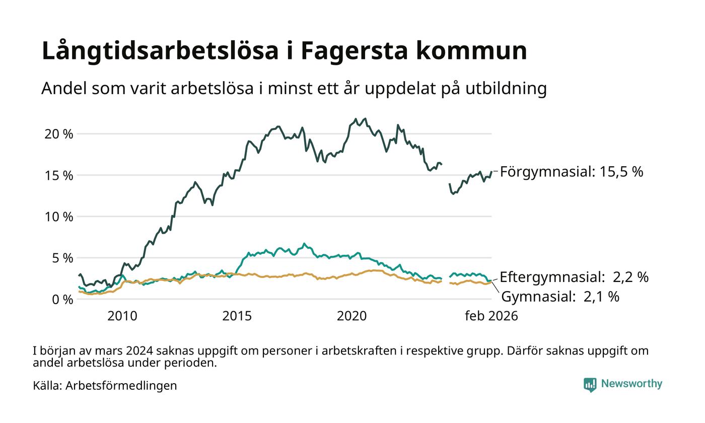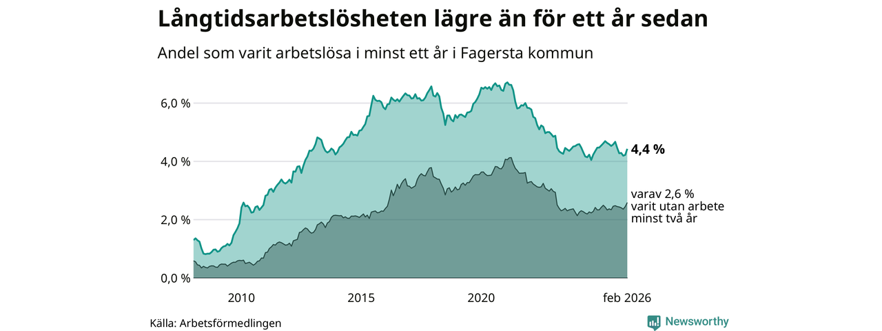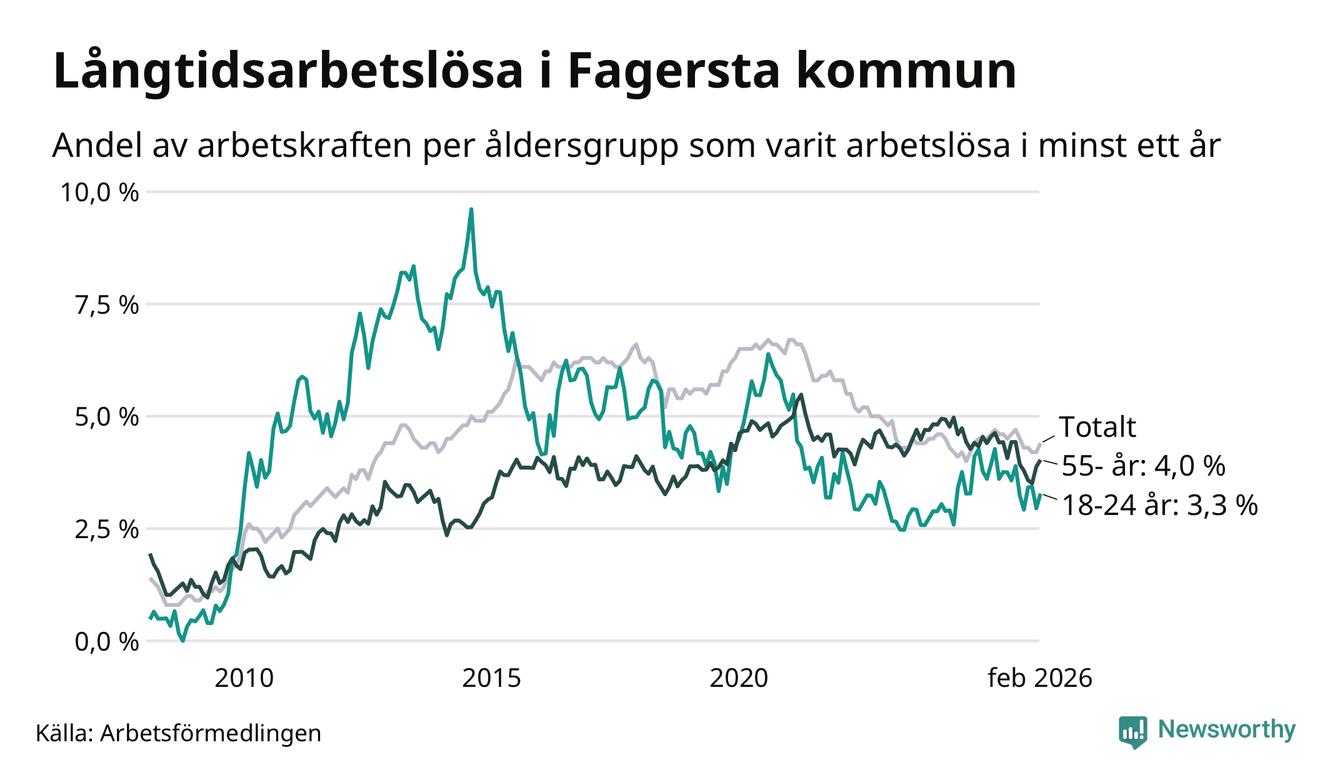 I februari hade 262 Fagerstabor varit arbetslösa i minst ett år, vilket är tolv fler än månaden innan. 262 personer motsvarar 4,4 procent av arbetskraften i kommunen – andelen långtidsarbetslösa är 0,2 procentenheter lägre än samma månad för ett år sedan. Fagersta tillhör de kommuner som har högst andel långtidsarbetslösa i hela landet just nu.