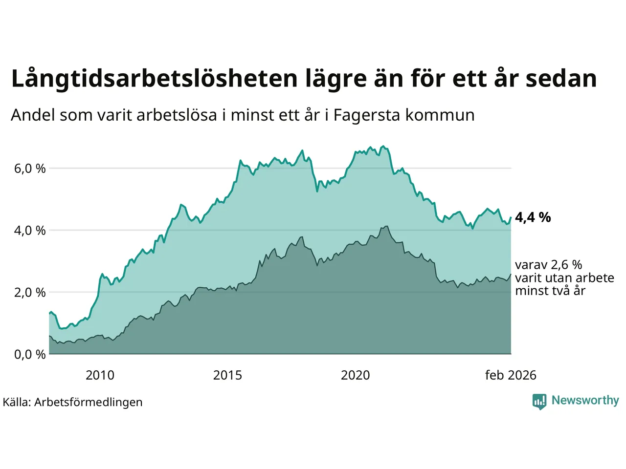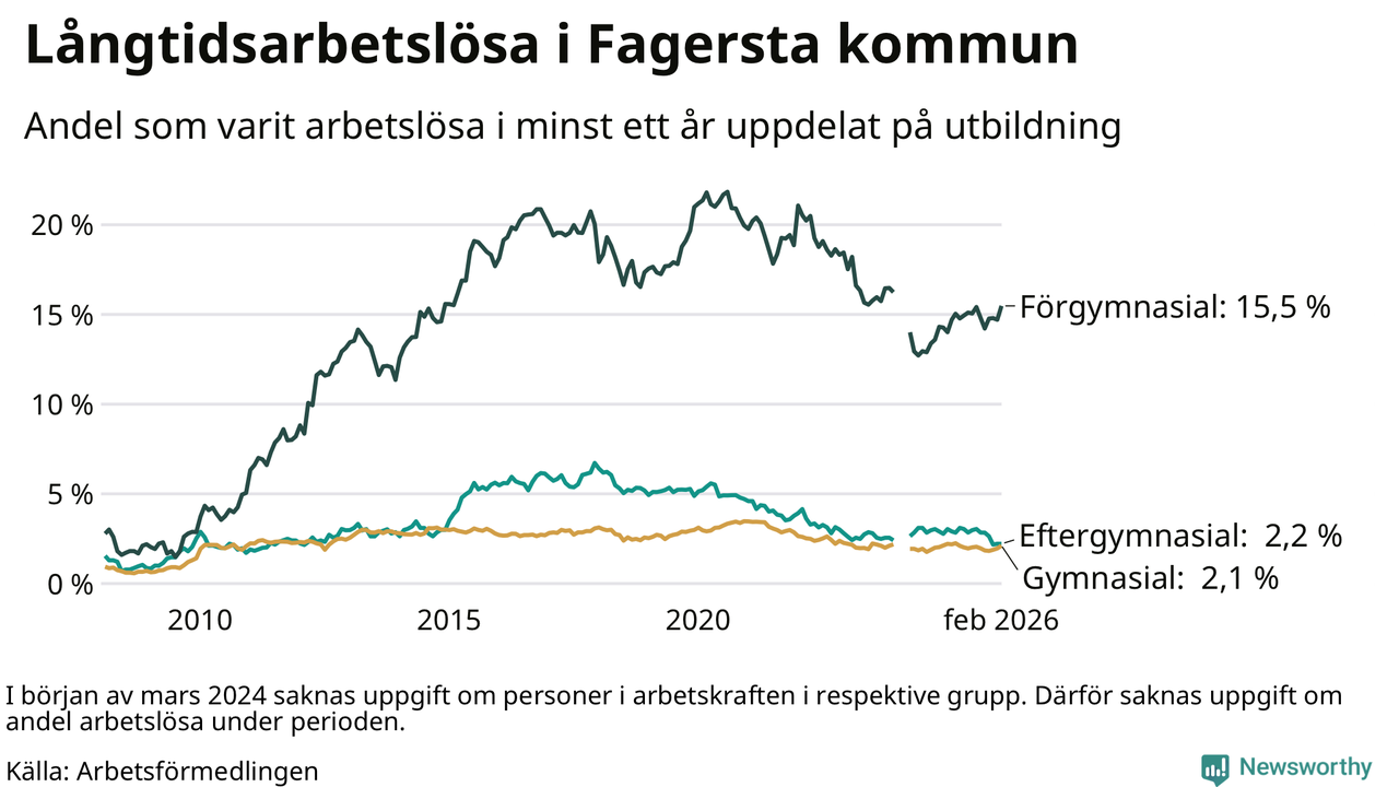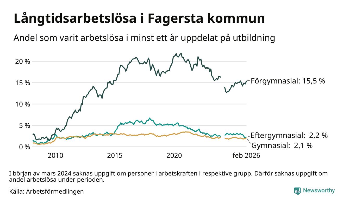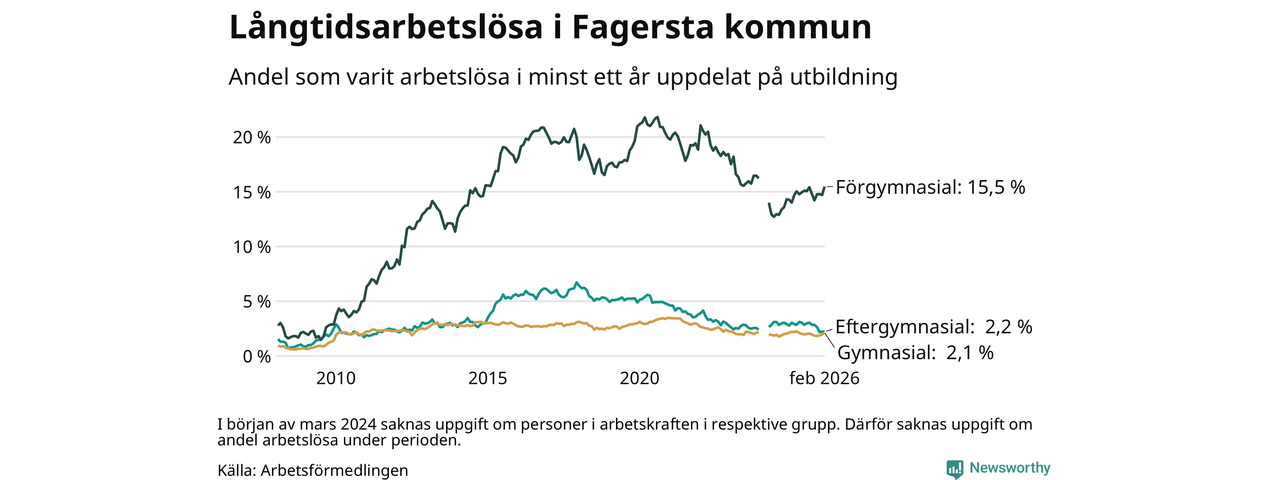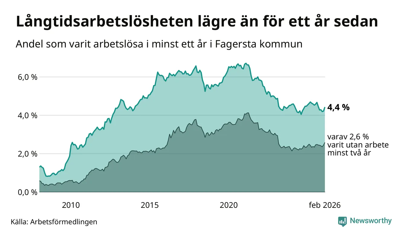 I februari hade 262 Fagerstabor varit arbetslösa i minst ett år, vilket är tolv fler än månaden innan. 262 personer motsvarar 4,4 procent av arbetskraften i kommunen – andelen långtidsarbetslösa är 0,2 procentenheter lägre än samma månad för ett år sedan. Fagersta tillhör de kommuner som har högst andel långtidsarbetslösa i hela landet just nu.