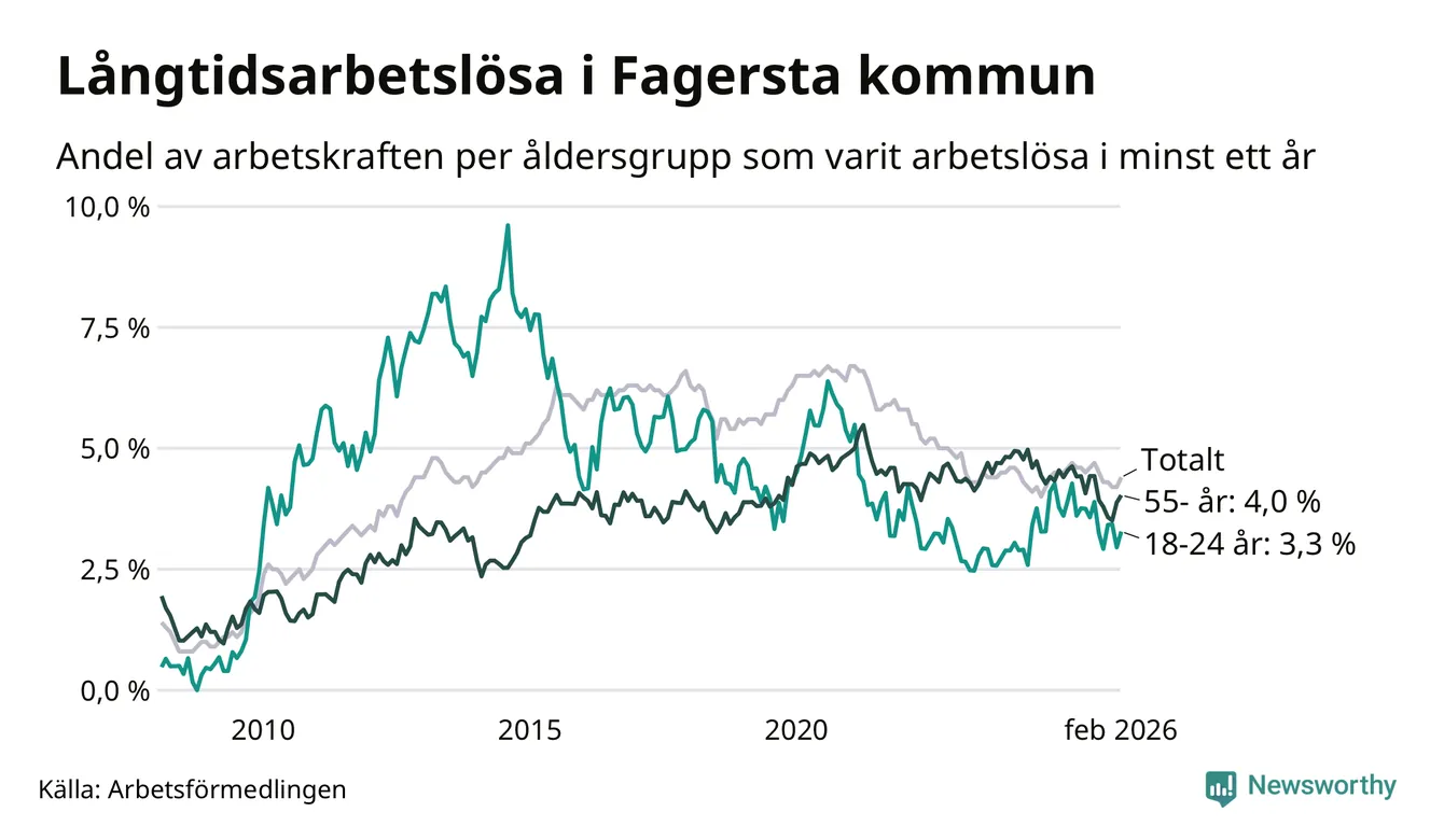 Av de 262 personerna som varit arbetslösa i mer än ett år i Fagersta kommun är 55 personer mellan 55 och 661 år och 20 är mellan 18 och 24 år. Som andel av arbetskraften innebär det att långtidsarbetslöheten är lägre i de båda grupperna än i arbetskraften totalt. I riket som helhet är andelen långtidsarbetslösa högre i den äldre gruppen.