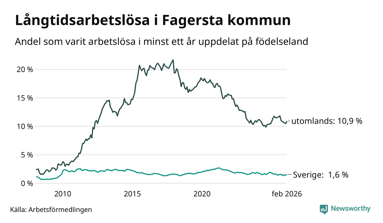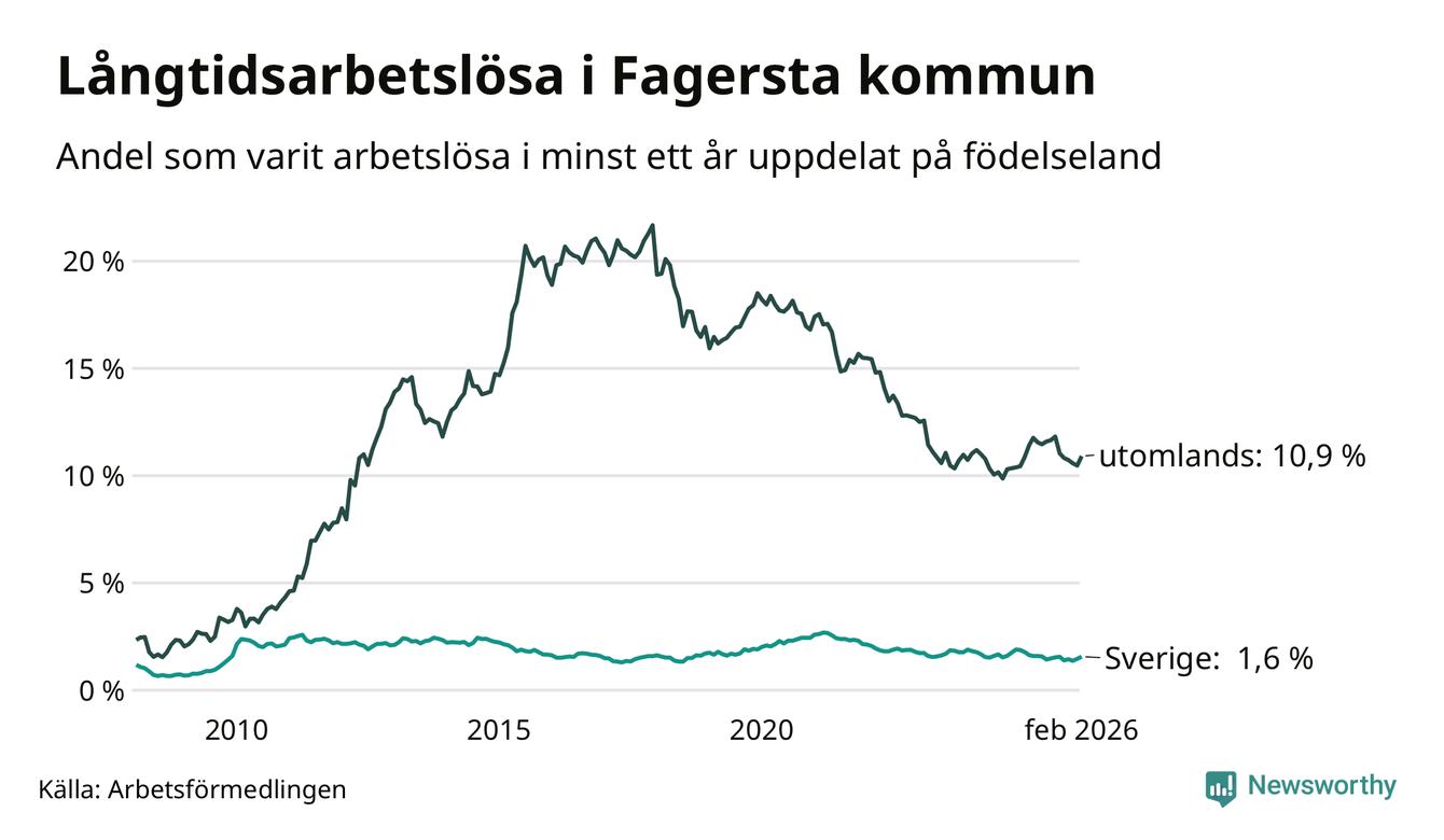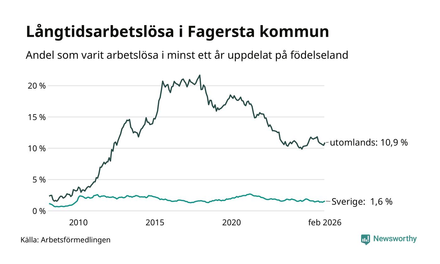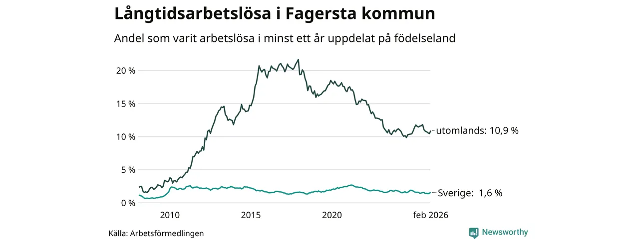 64 av de långtidsarbetslösa i Fagersta är födda i Sverige, medan 198 är födda utomlands. Det innebär att långtidsarbetslösheten bland Sverigefödda är 1,6 procent, medan den är sju gånger så hög – 10,9 procent – bland födda utomlands. Även i riket som helhet är arbetslösheten högre bland utrikesfödda.
