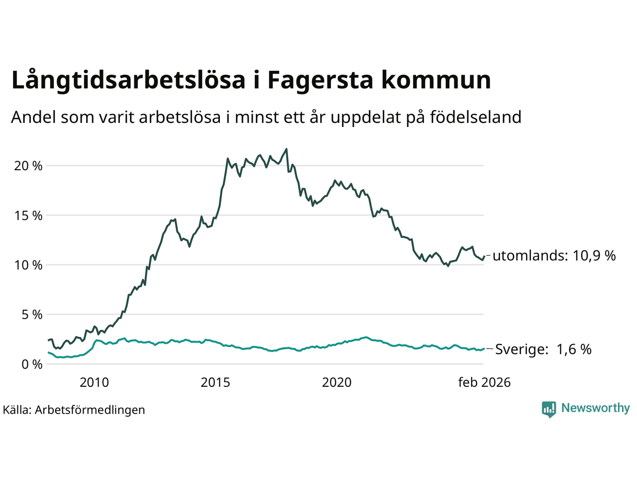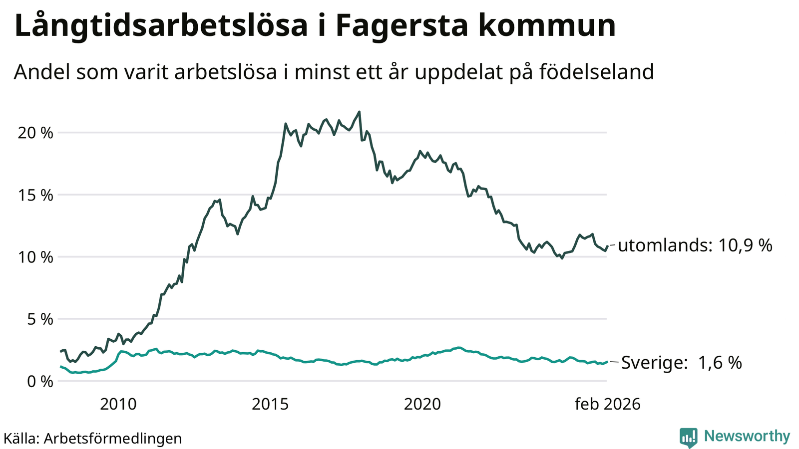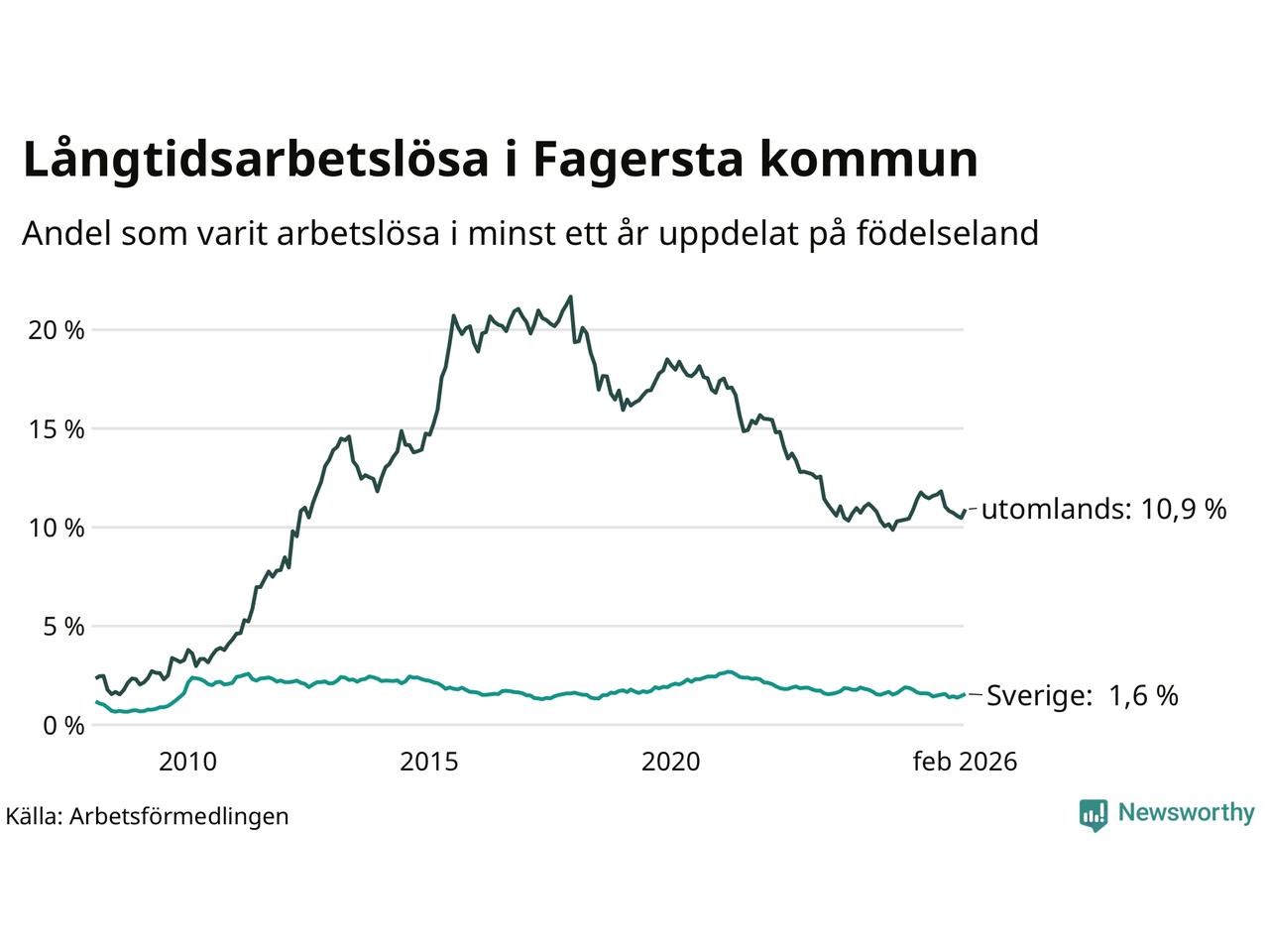64 av de långtidsarbetslösa i Fagersta är födda i Sverige, medan 198 är födda utomlands. Det innebär att långtidsarbetslösheten bland Sverigefödda är 1,6 procent, medan den är sju gånger så hög – 10,9 procent – bland födda utomlands. Även i riket som helhet är arbetslösheten högre bland utrikesfödda.