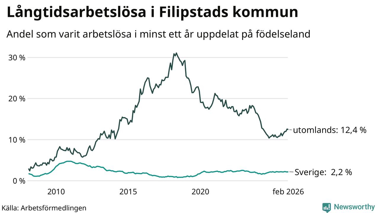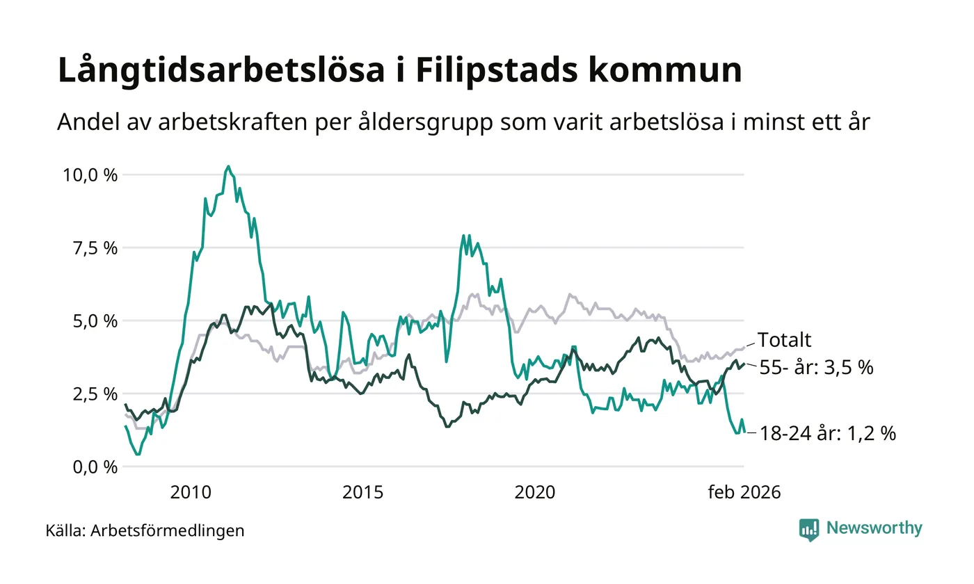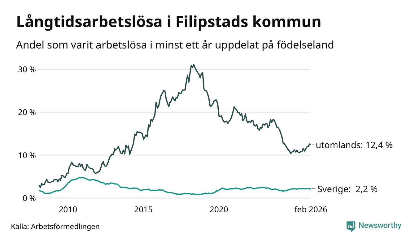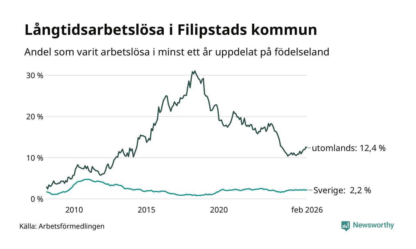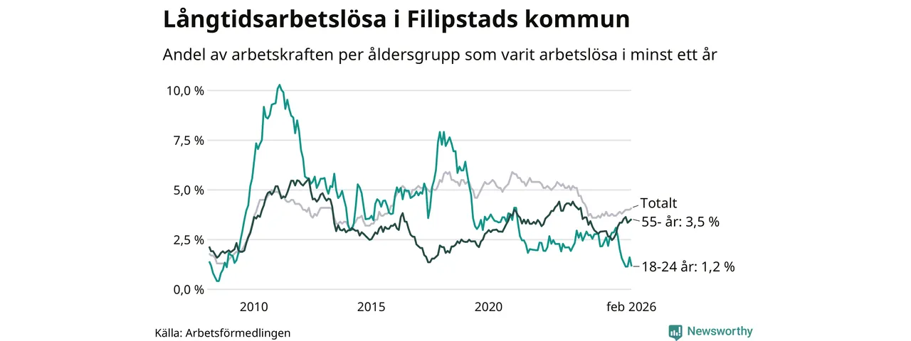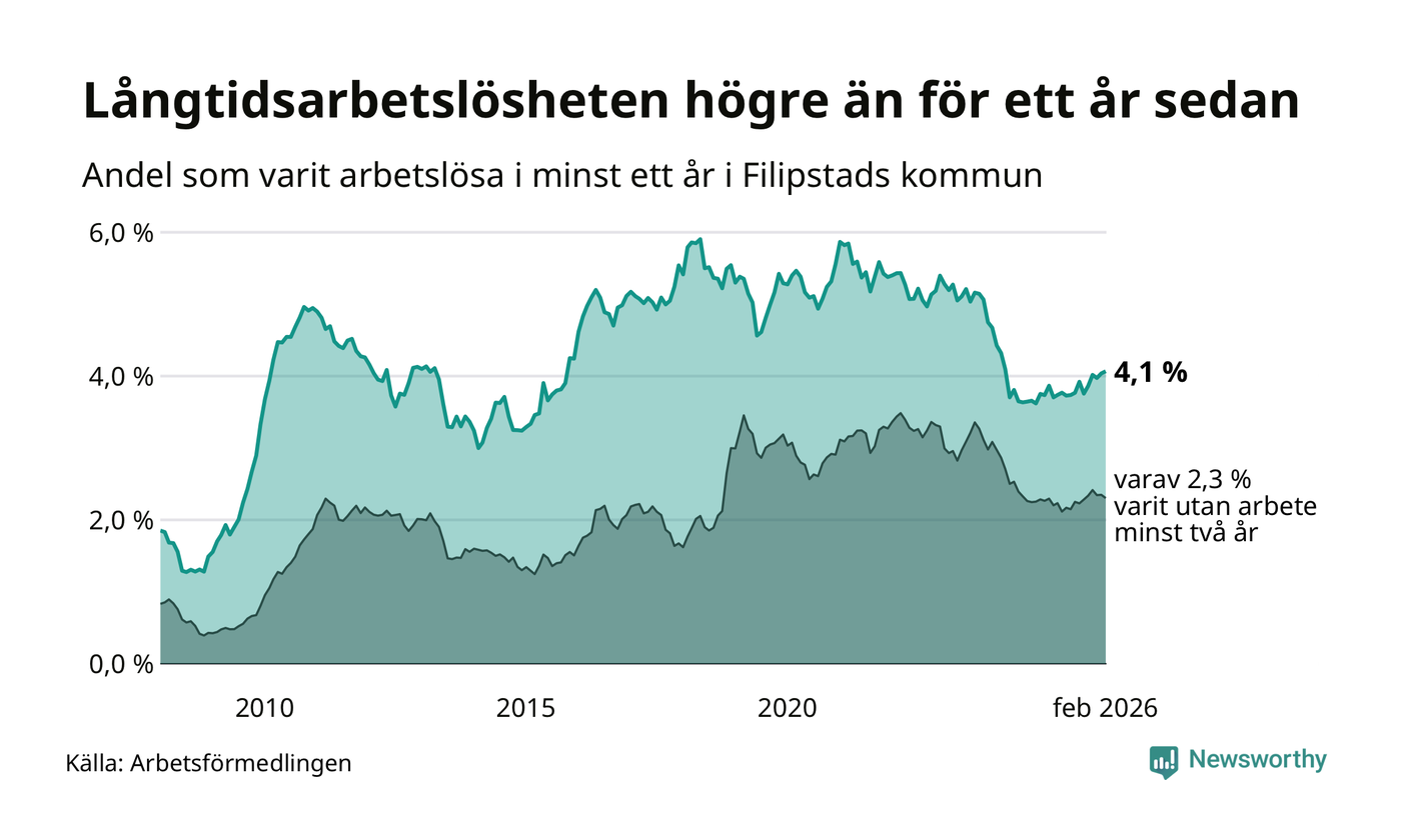 I februari hade 166 Filipstadsbor varit arbetslösa i minst ett år, vilket är en fler än månaden innan. 166 personer motsvarar 4,1 procent av arbetskraften i kommunen – andelen långtidsarbetslösa är 0,4 procentenheter högre än samma månad för ett år sedan.