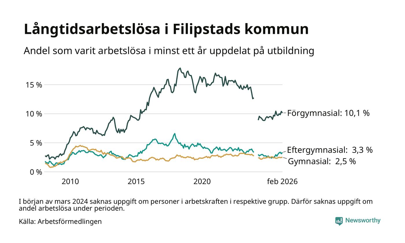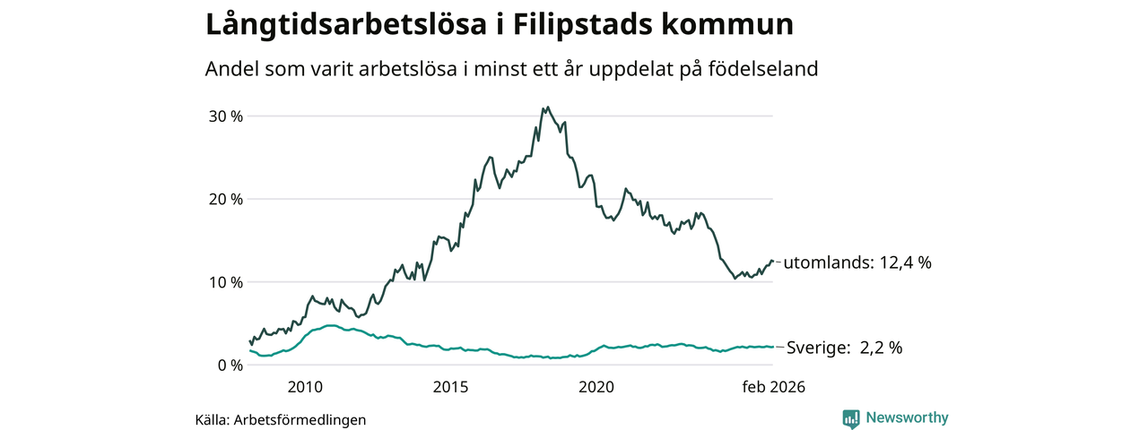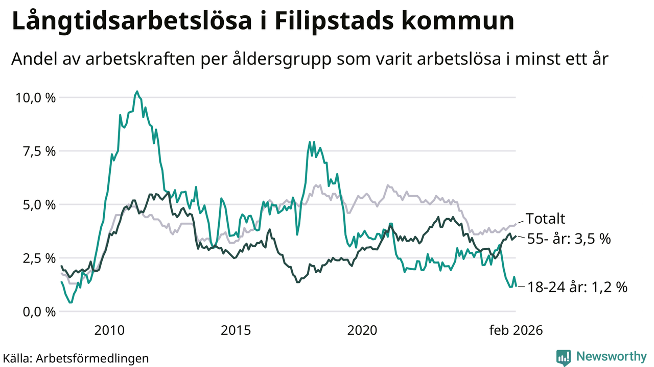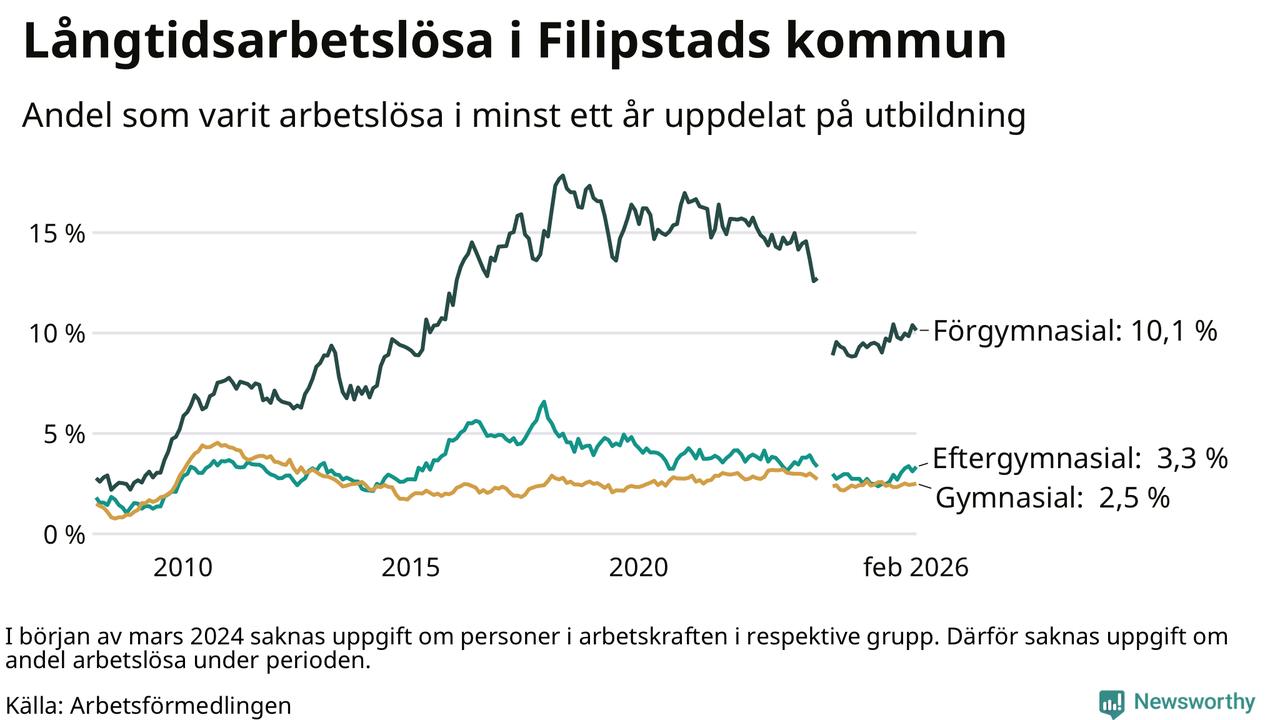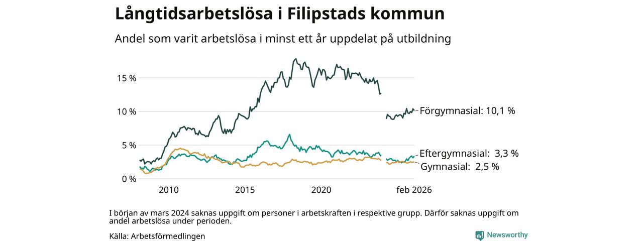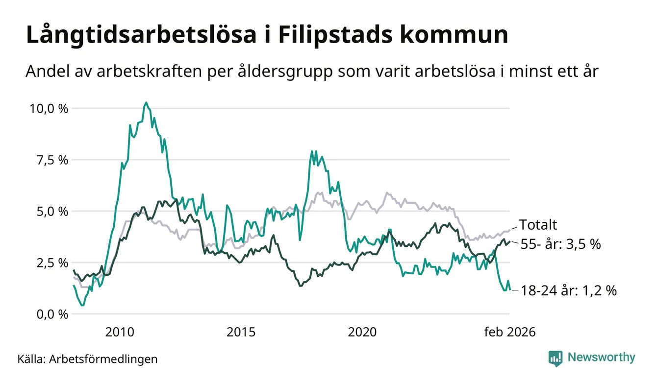 I februari hade 166 Filipstadsbor varit arbetslösa i minst ett år, vilket är en fler än månaden innan. 166 personer motsvarar 4,1 procent av arbetskraften i kommunen – andelen långtidsarbetslösa är 0,4 procentenheter högre än samma månad för ett år sedan.