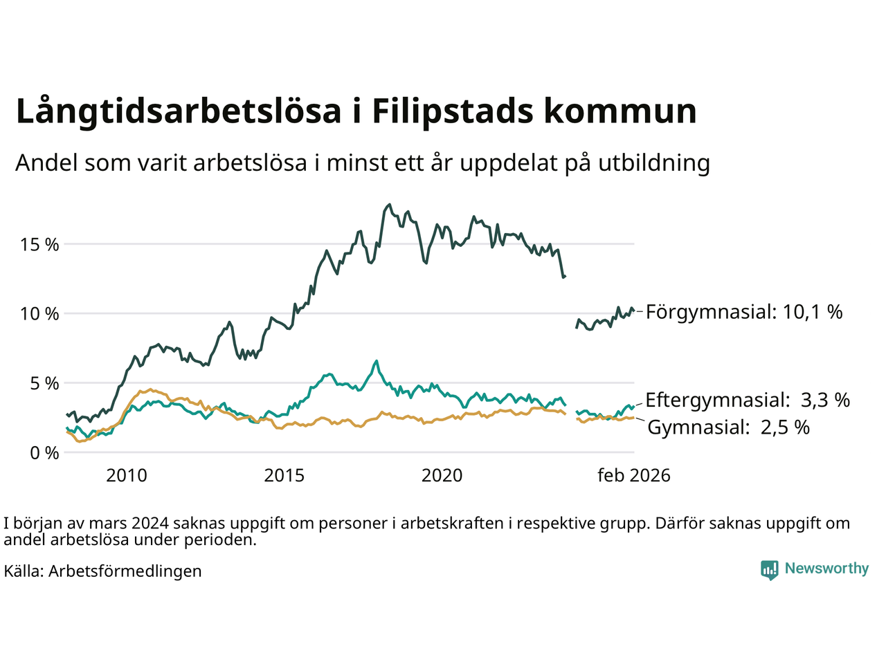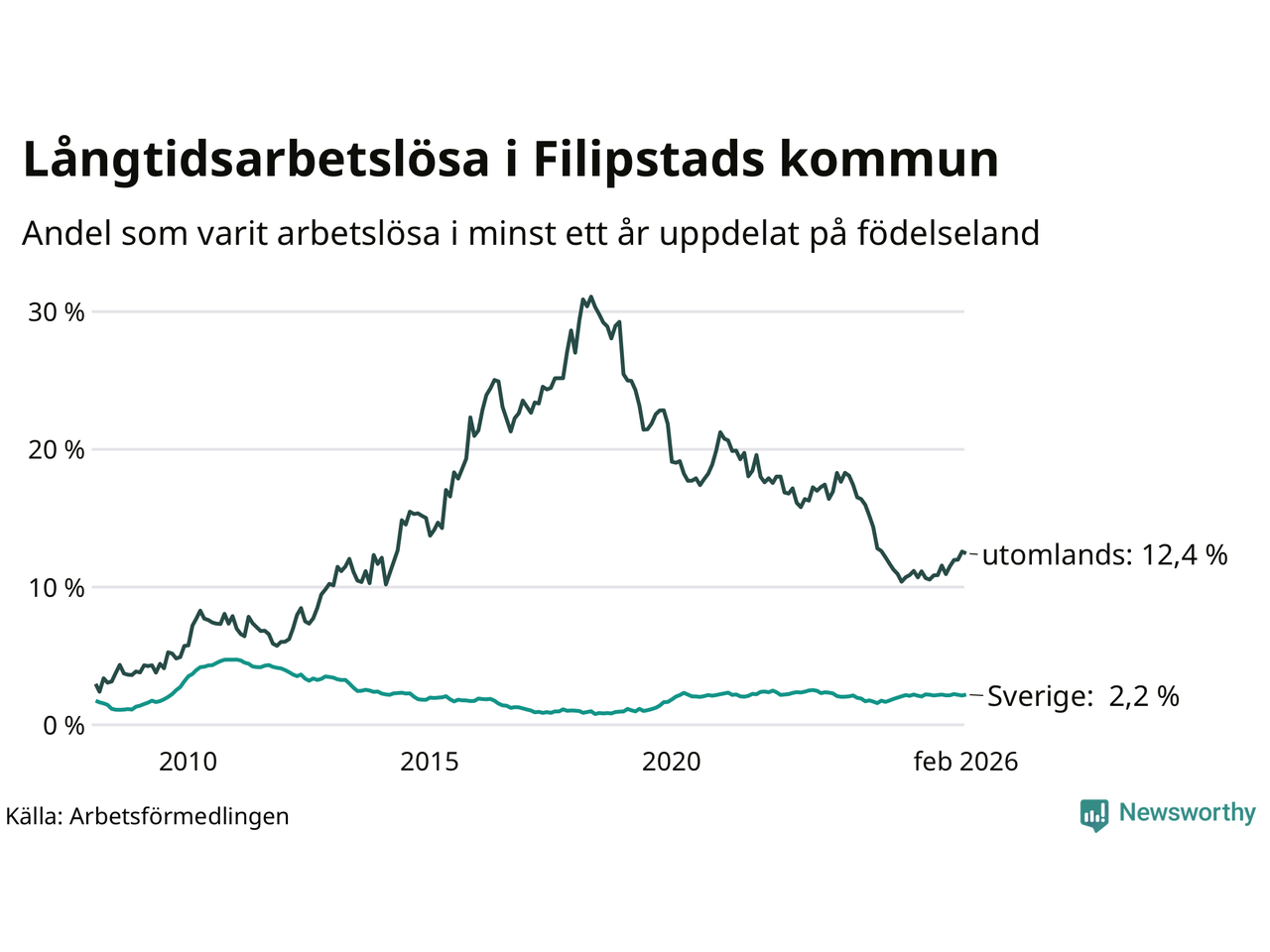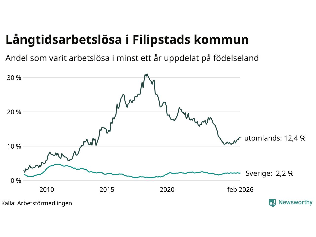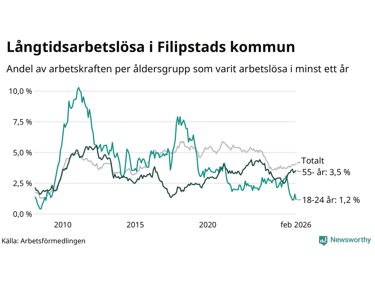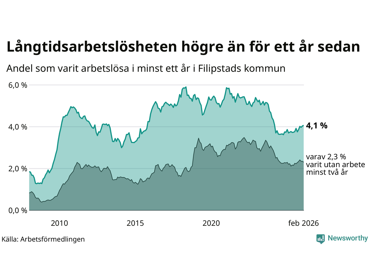 I februari hade 166 Filipstadsbor varit arbetslösa i minst ett år, vilket är en fler än månaden innan. 166 personer motsvarar 4,1 procent av arbetskraften i kommunen – andelen långtidsarbetslösa är 0,4 procentenheter högre än samma månad för ett år sedan.