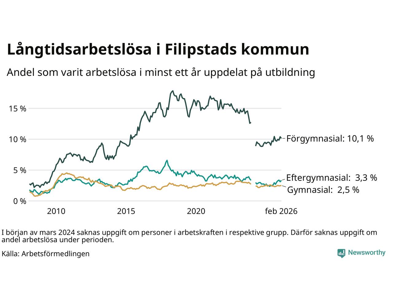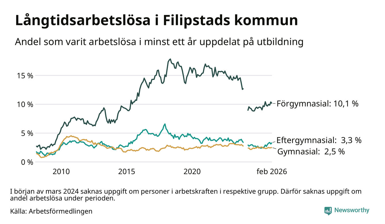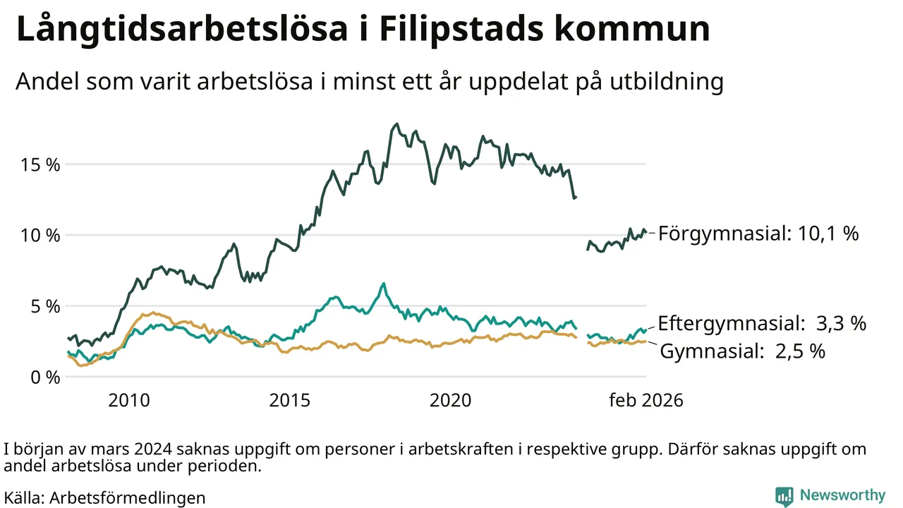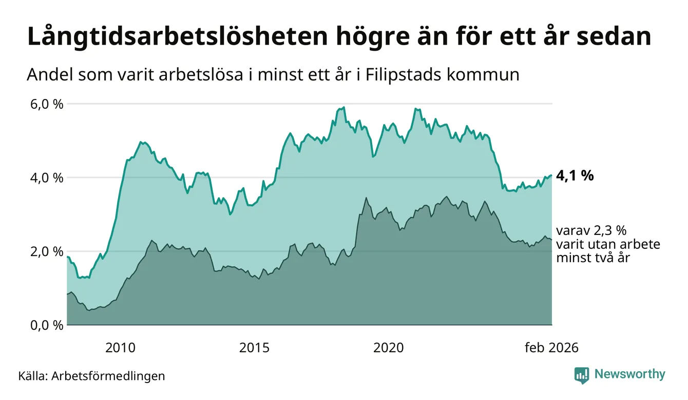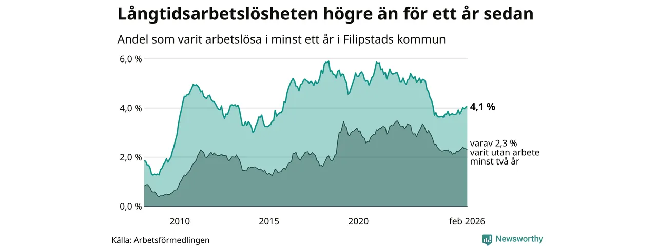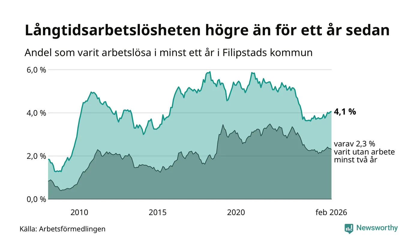 Andelen som varit utan arbete i minst ett år i Filipstad var högre i februari jämfört med samma månad för ett år sedan. Det visar Arbetsfömedlingens senaste månadsstatistik.