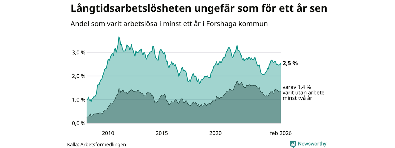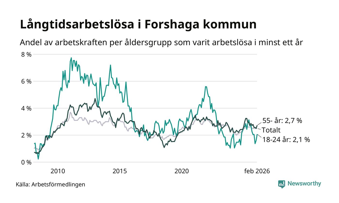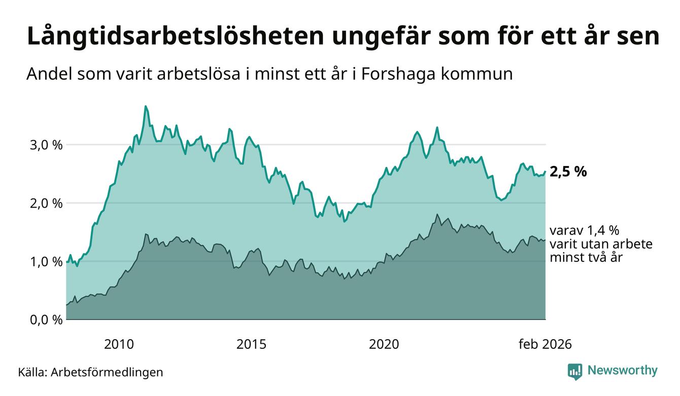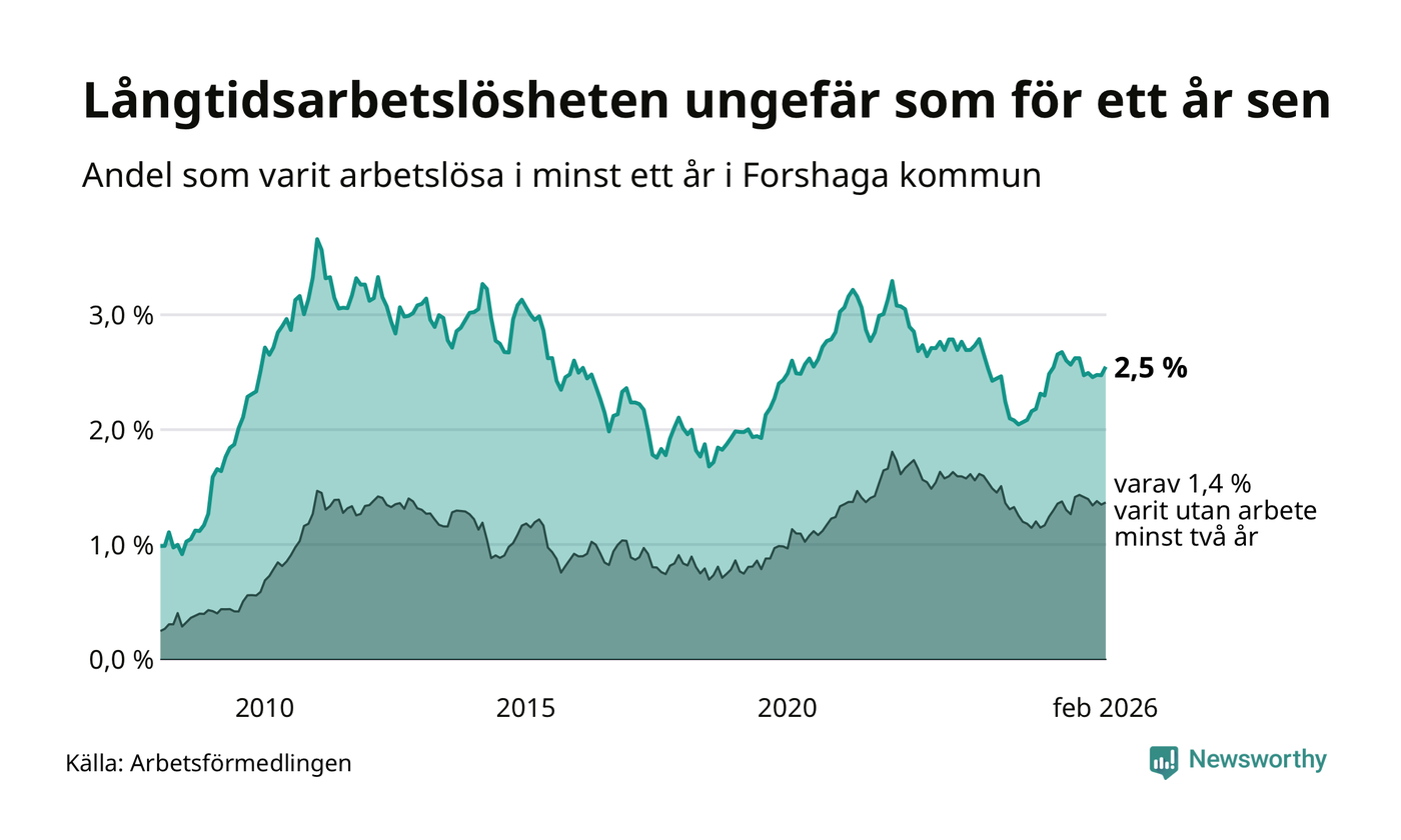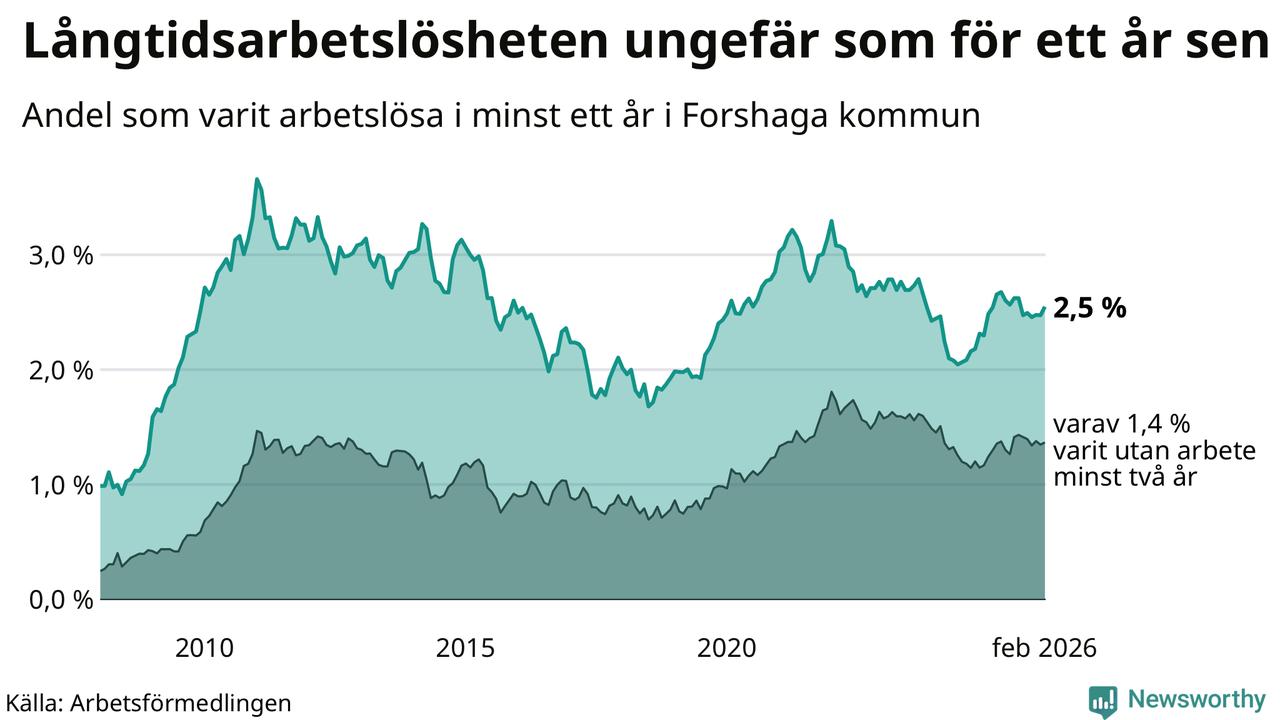 I februari hade 138 Forshagabor varit arbetslösa i minst ett år, vilket är fyra fler än månaden innan. 138 personer motsvarar 2,5 procent av arbetskraften i kommunen – andelen långtidsarbetslösa är ungefär på samma nivå som för ett år sedan.