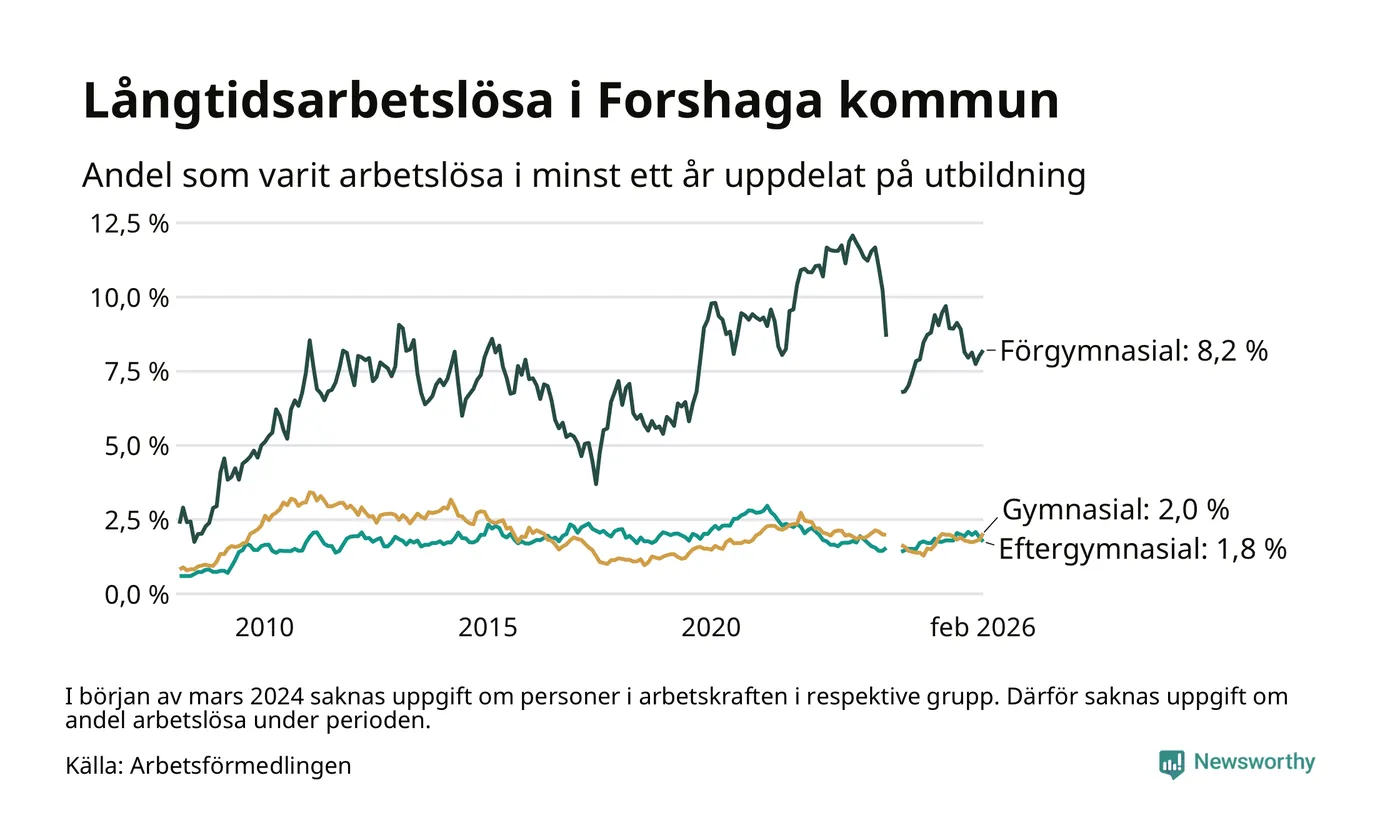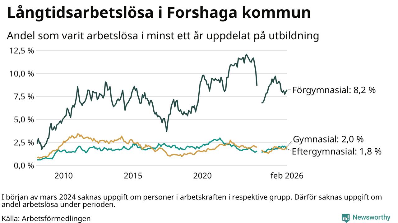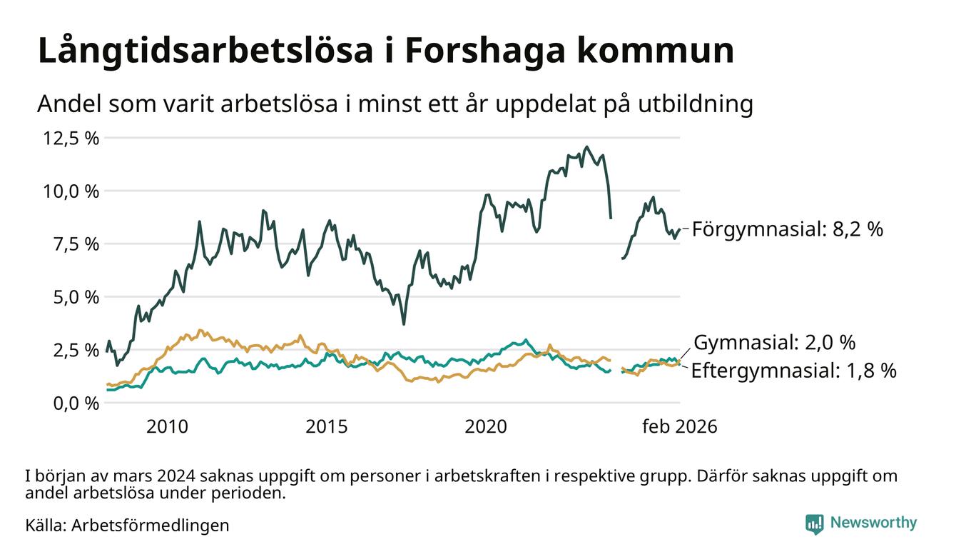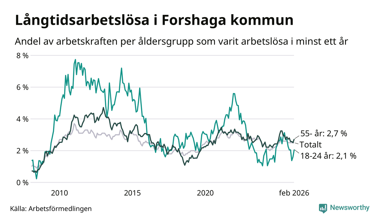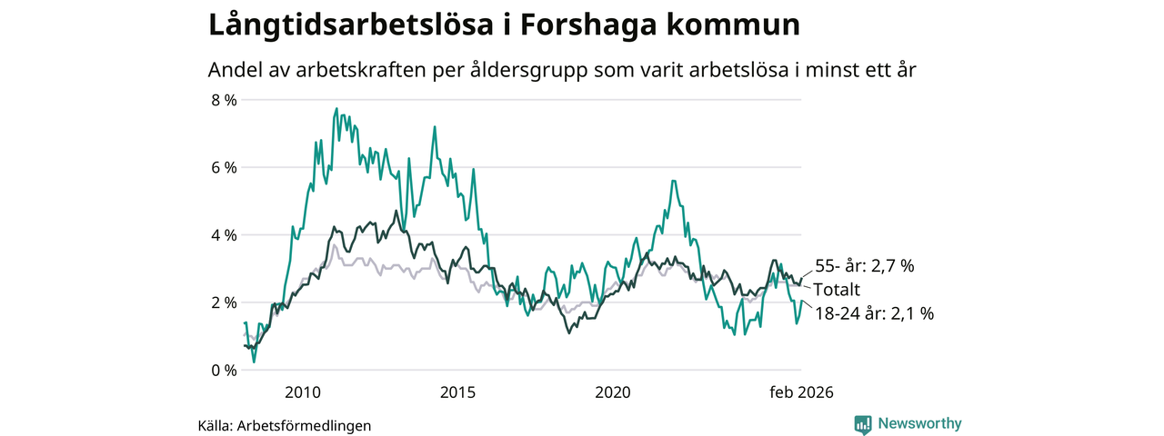 I februari hade 138 Forshagabor varit arbetslösa i minst ett år, vilket är fyra fler än månaden innan. 138 personer motsvarar 2,5 procent av arbetskraften i kommunen – andelen långtidsarbetslösa är ungefär på samma nivå som för ett år sedan.