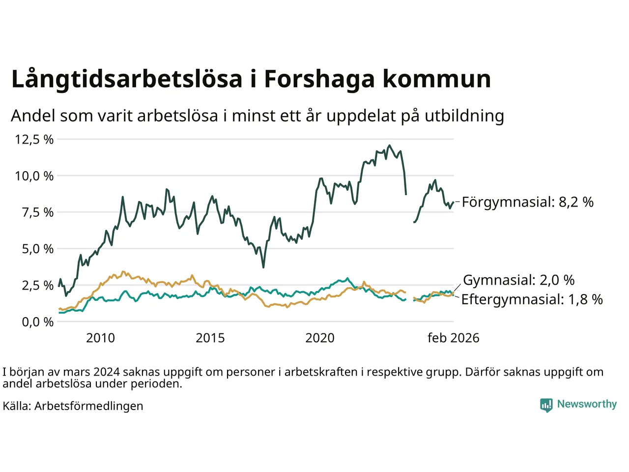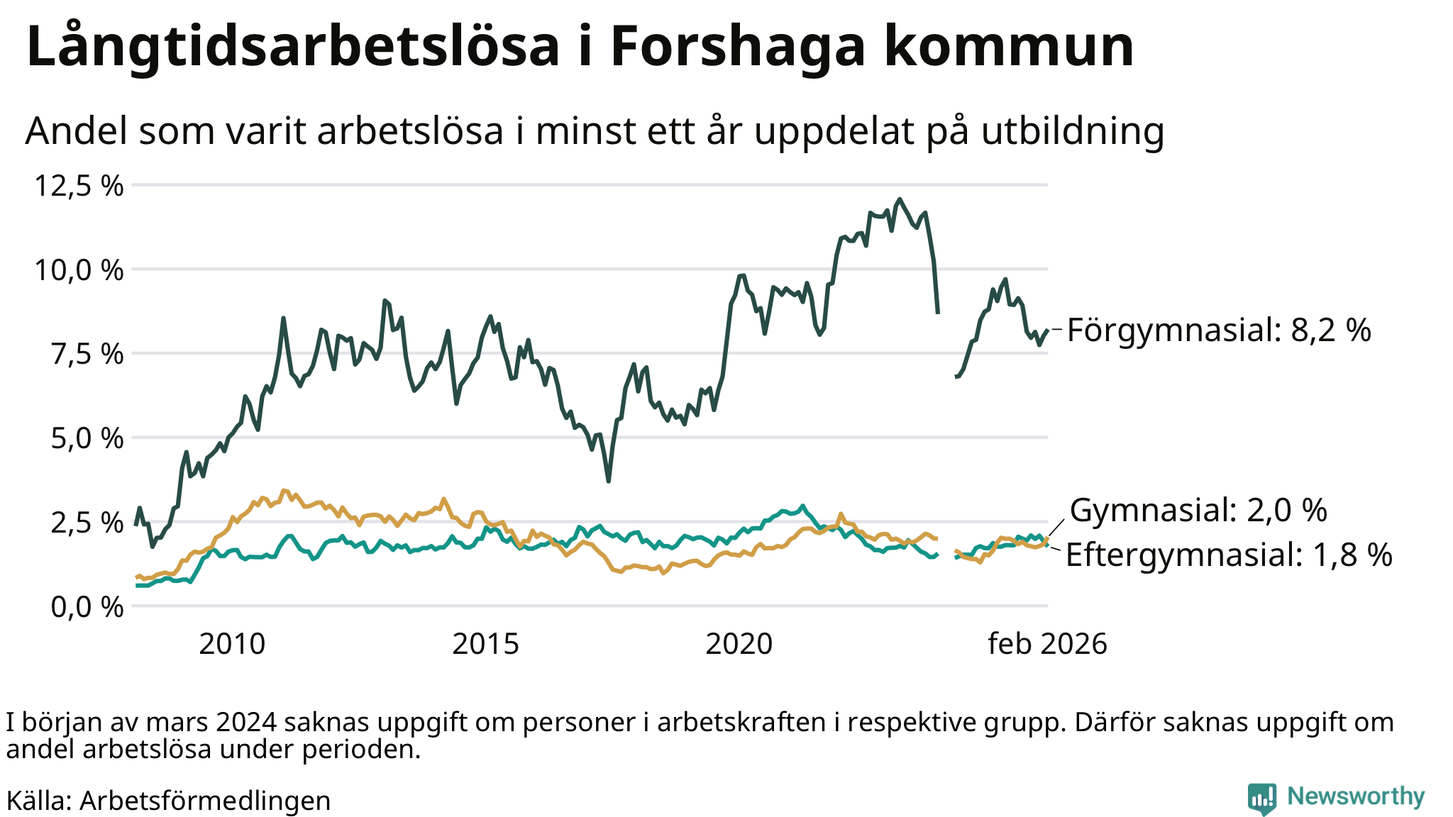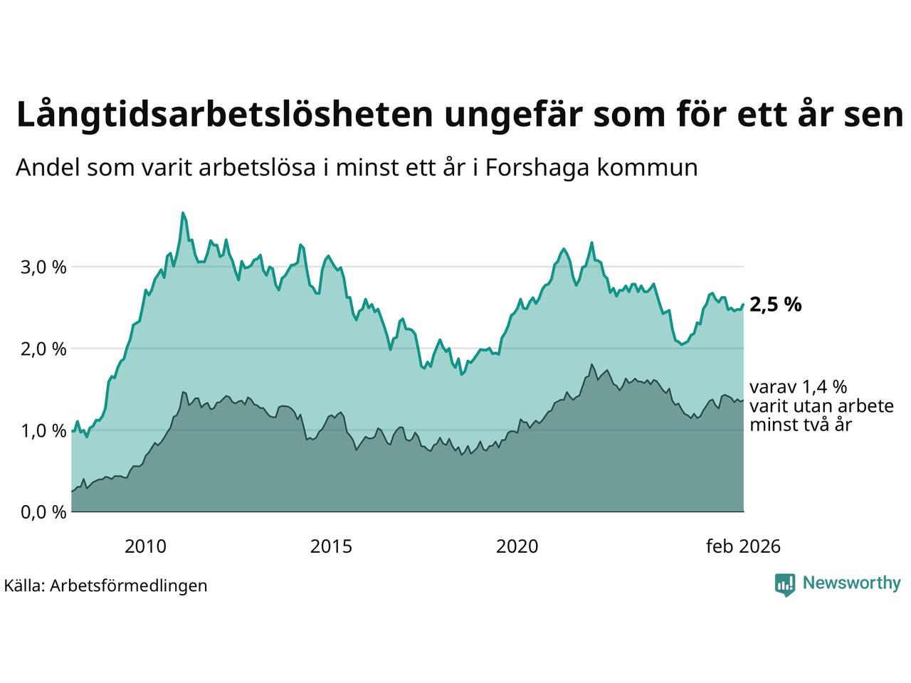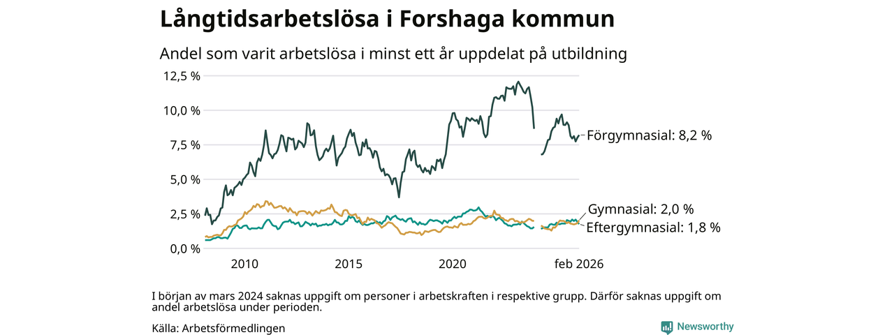 I februari hade 138 Forshagabor varit arbetslösa i minst ett år, vilket är fyra fler än månaden innan. 138 personer motsvarar 2,5 procent av arbetskraften i kommunen – andelen långtidsarbetslösa är ungefär på samma nivå som för ett år sedan.
