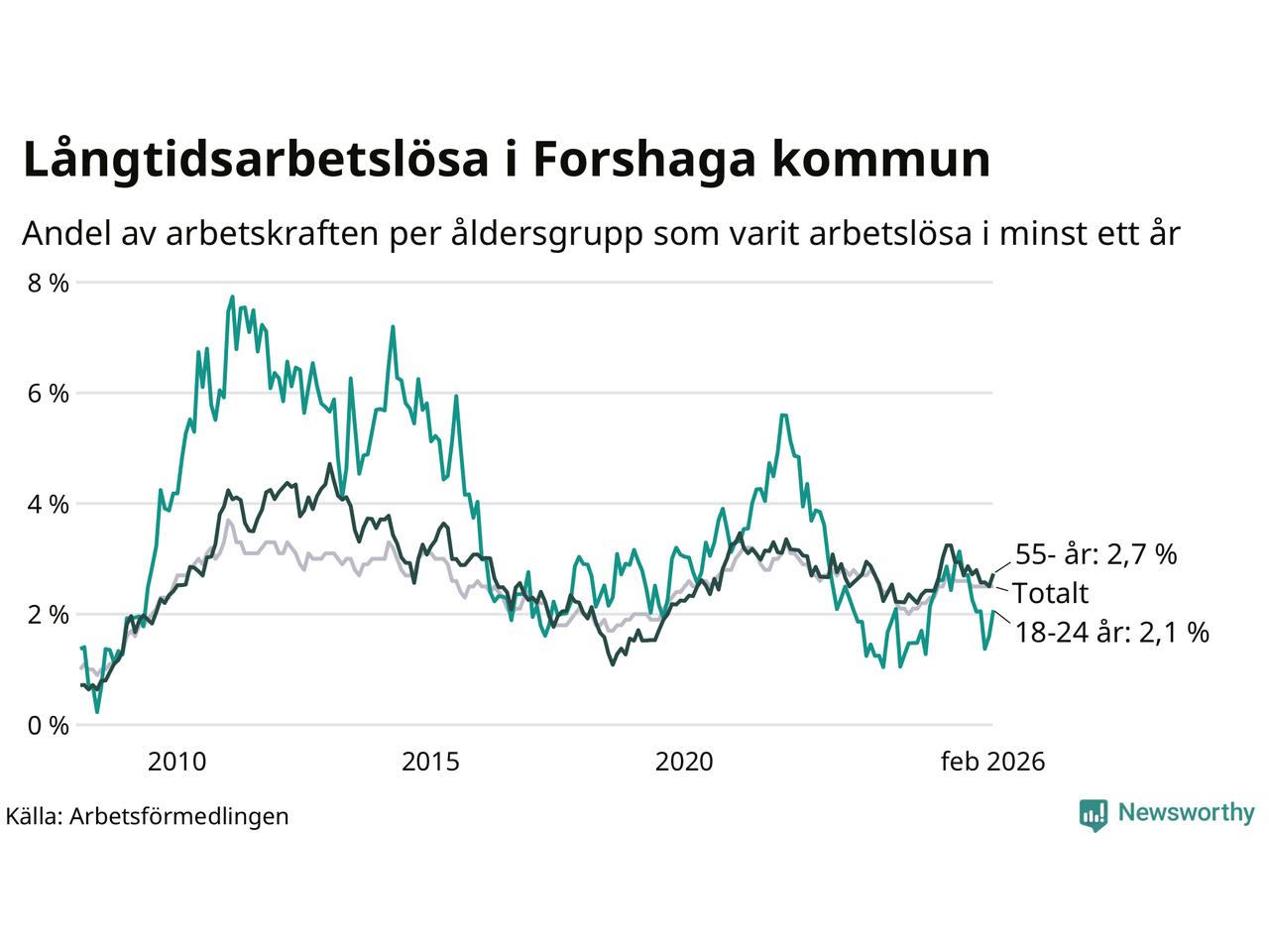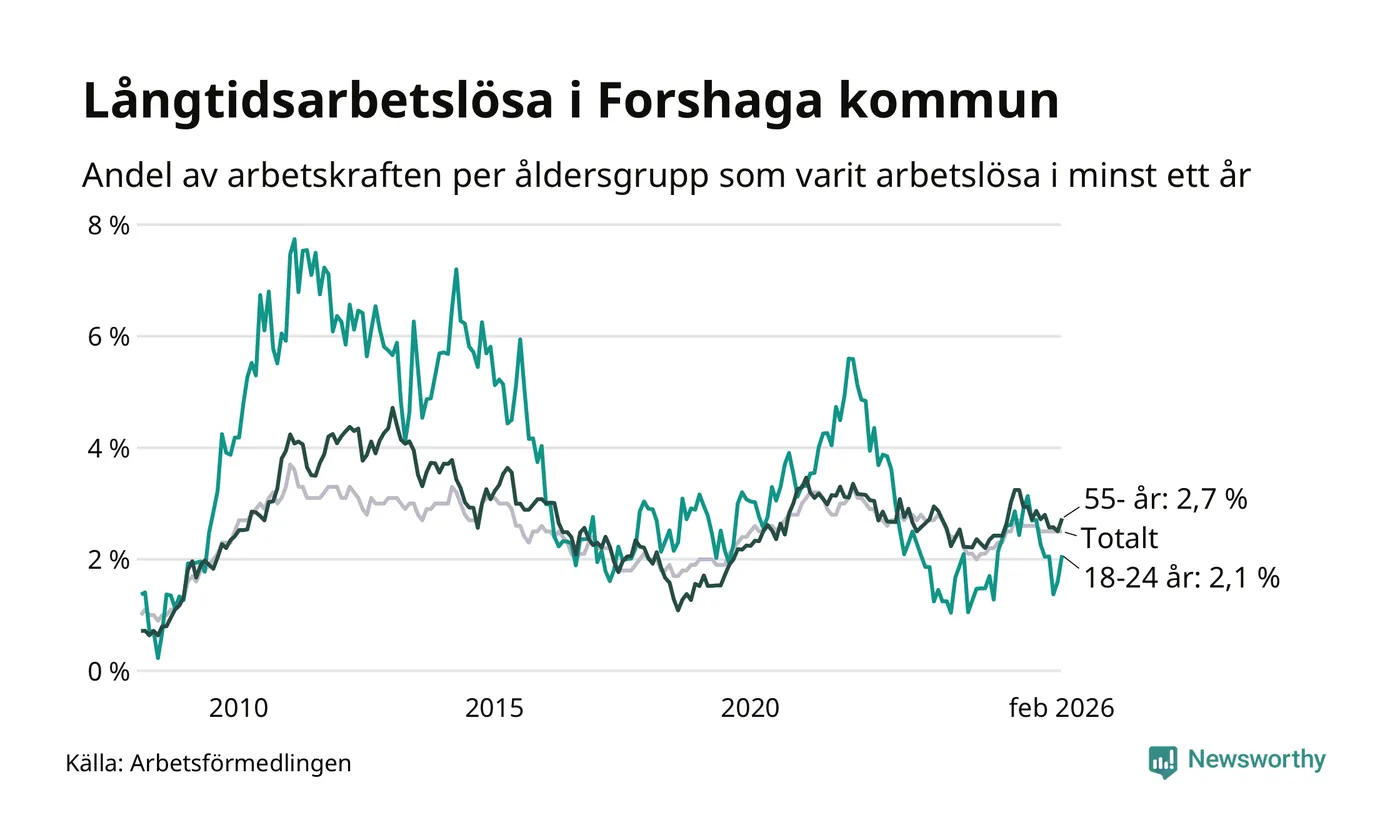 Av de 138 personerna som varit arbetslösa i mer än ett år i Forshaga kommun är 36 personer mellan 55 och 661 år och nio är mellan 18 och 24 år. För den äldre gruppen är andelen arbetslösa 2,7 procent medan den i den yngre gruppen är 2,1 procent. Även i riket som helhet är långtidsarbetslösheten högre i gruppen äldre.