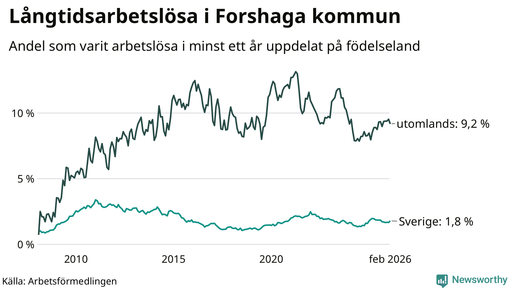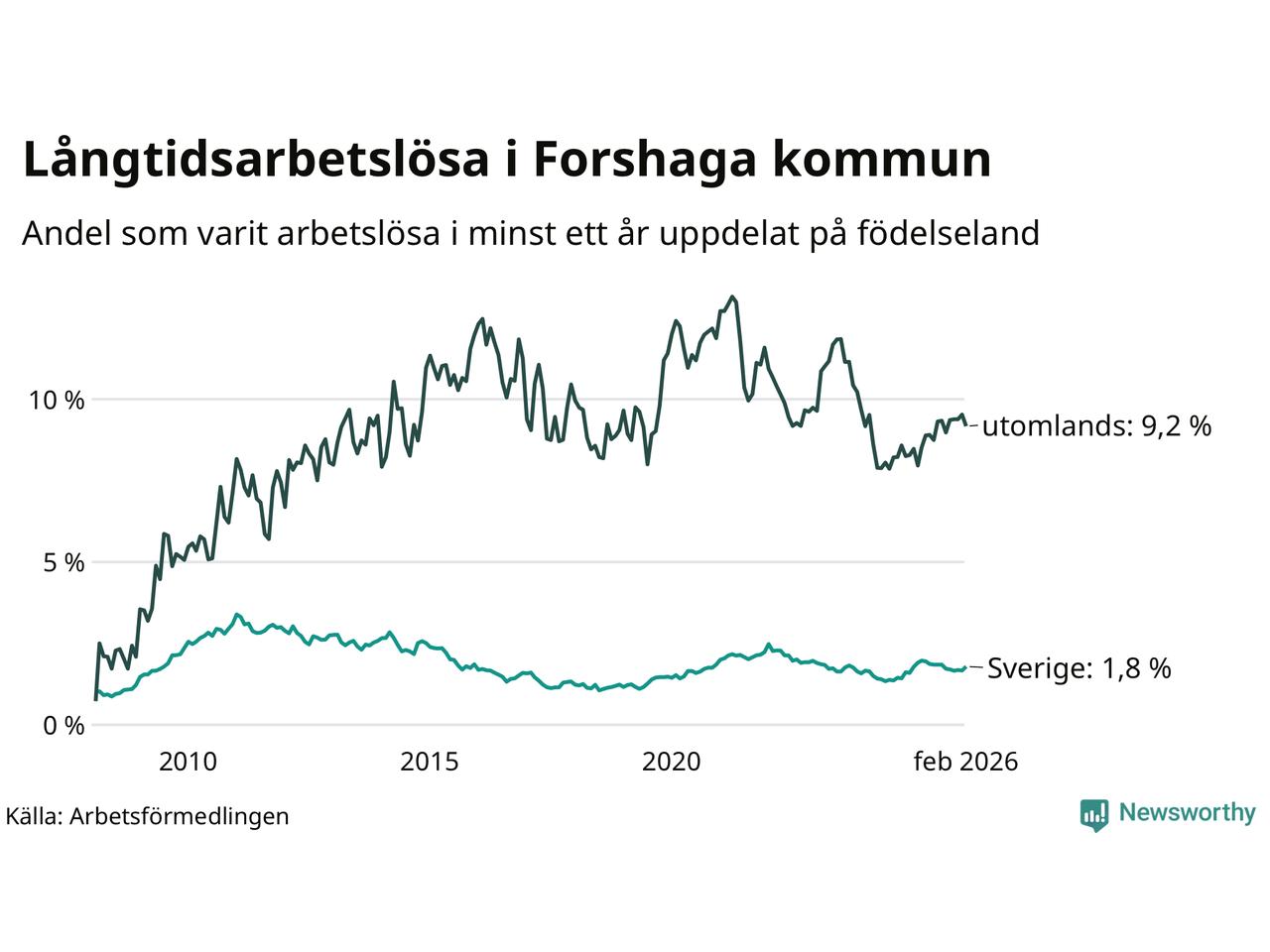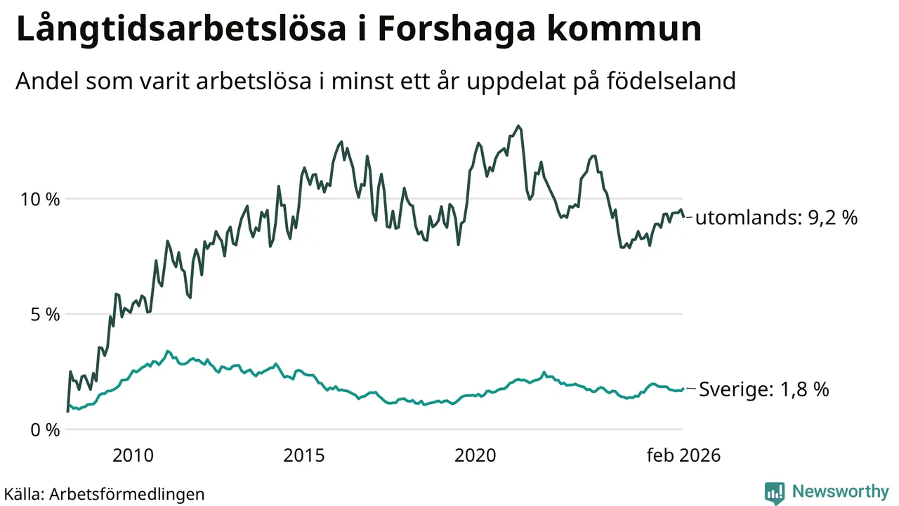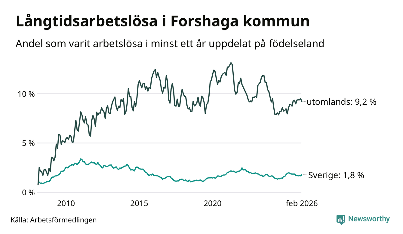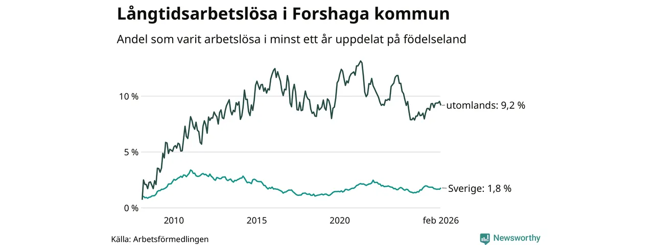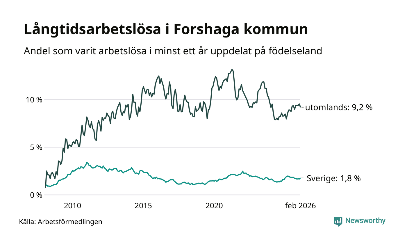 87 av de långtidsarbetslösa i Forshaga är födda i Sverige, medan 51 är födda utomlands. Det innebär att långtidsarbetslösheten bland Sverigefödda är 1,8 procent, medan den är fem gånger så hög – 9,2 procent – bland födda utomlands. Även i riket som helhet är arbetslösheten högre bland utrikesfödda.
