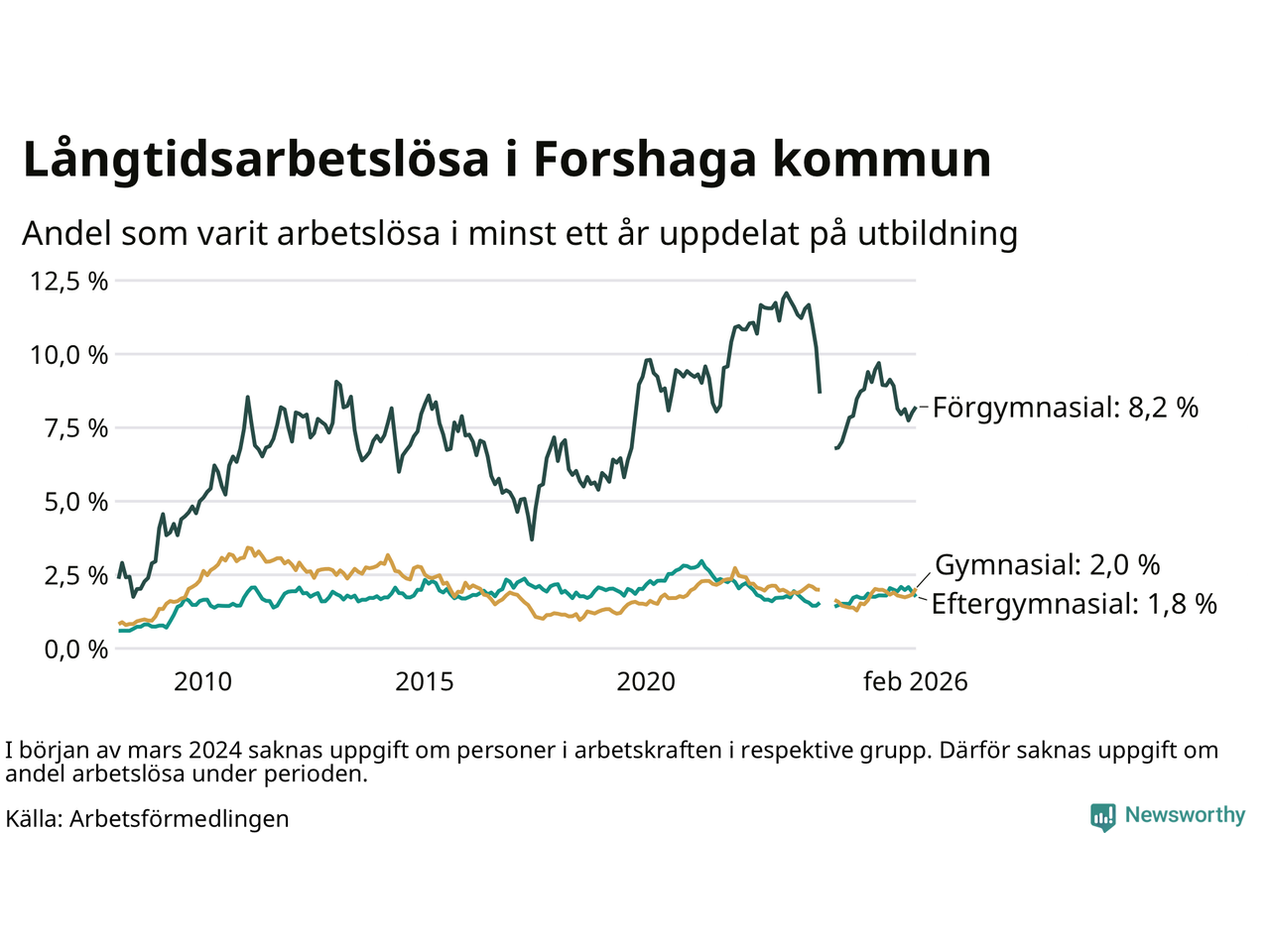 Andelen som varit utan arbete i minst ett år i Forshaga var ungefär lika stor i februari jämfört med samma månad för ett år sedan. Det visar Arbetsfömedlingens senaste månadsstatistik.
