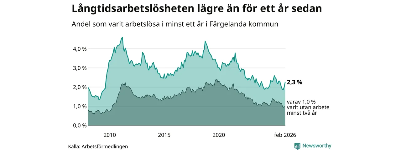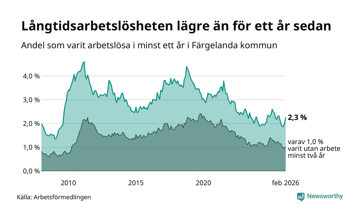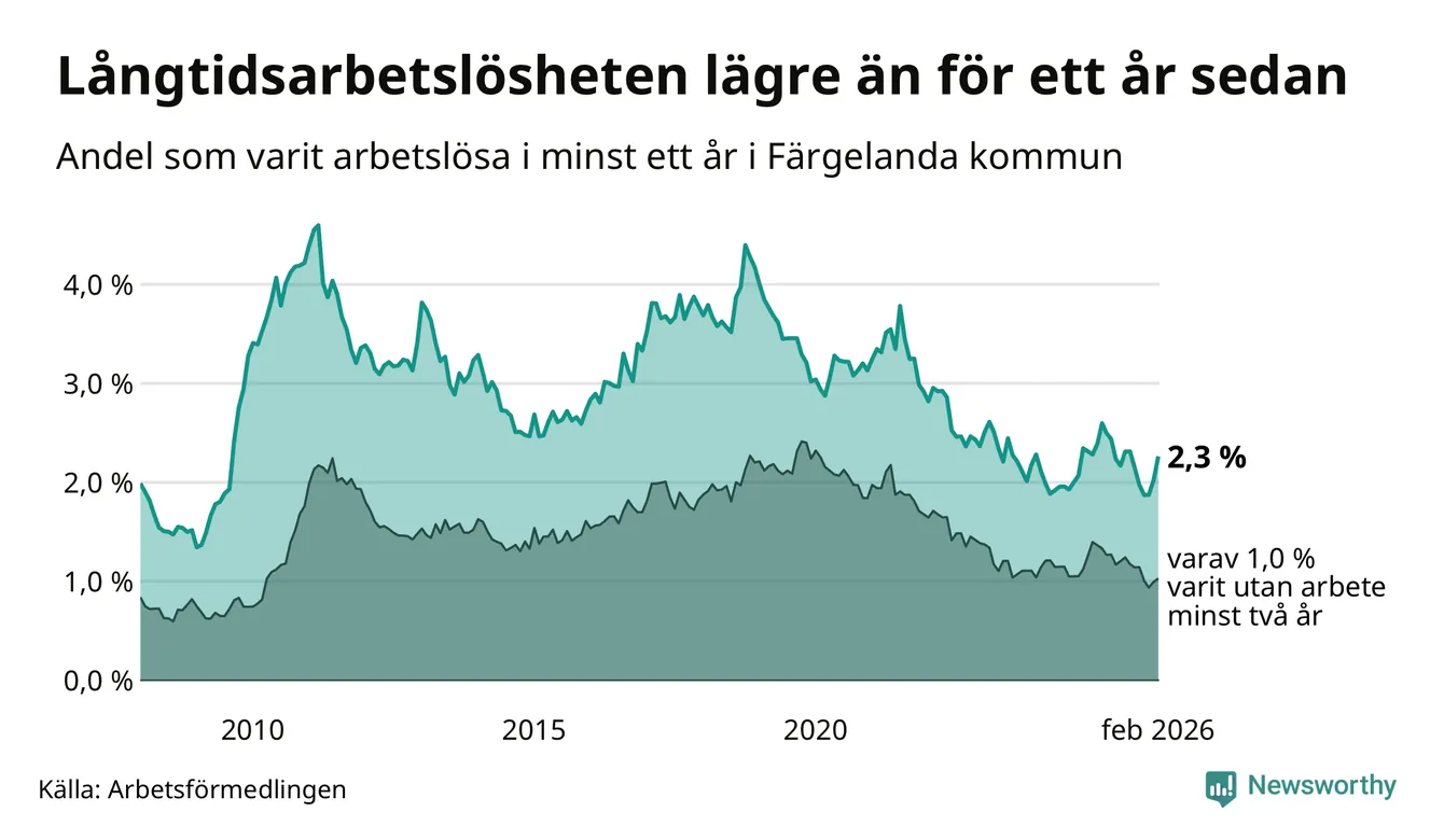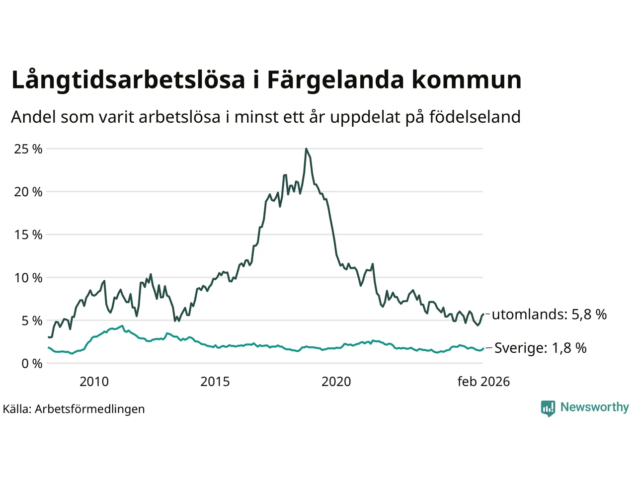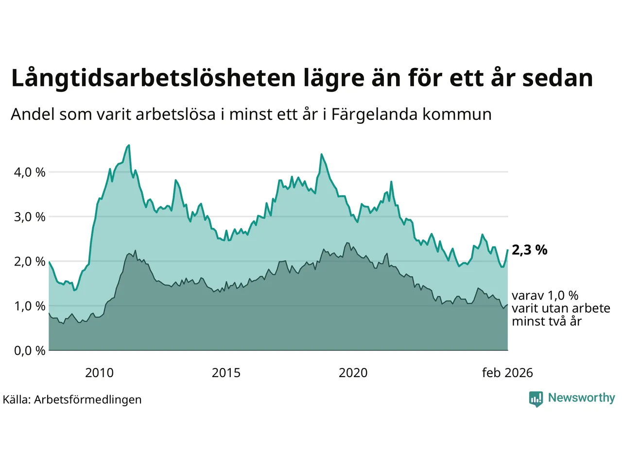 I februari hade 66 Färgelandabor varit arbetslösa i minst ett år, vilket är sju fler än månaden innan. 66 personer motsvarar 2,3 procent av arbetskraften i kommunen – andelen långtidsarbetslösa är 0,3 procentenheter lägre än samma månad för ett år sedan.