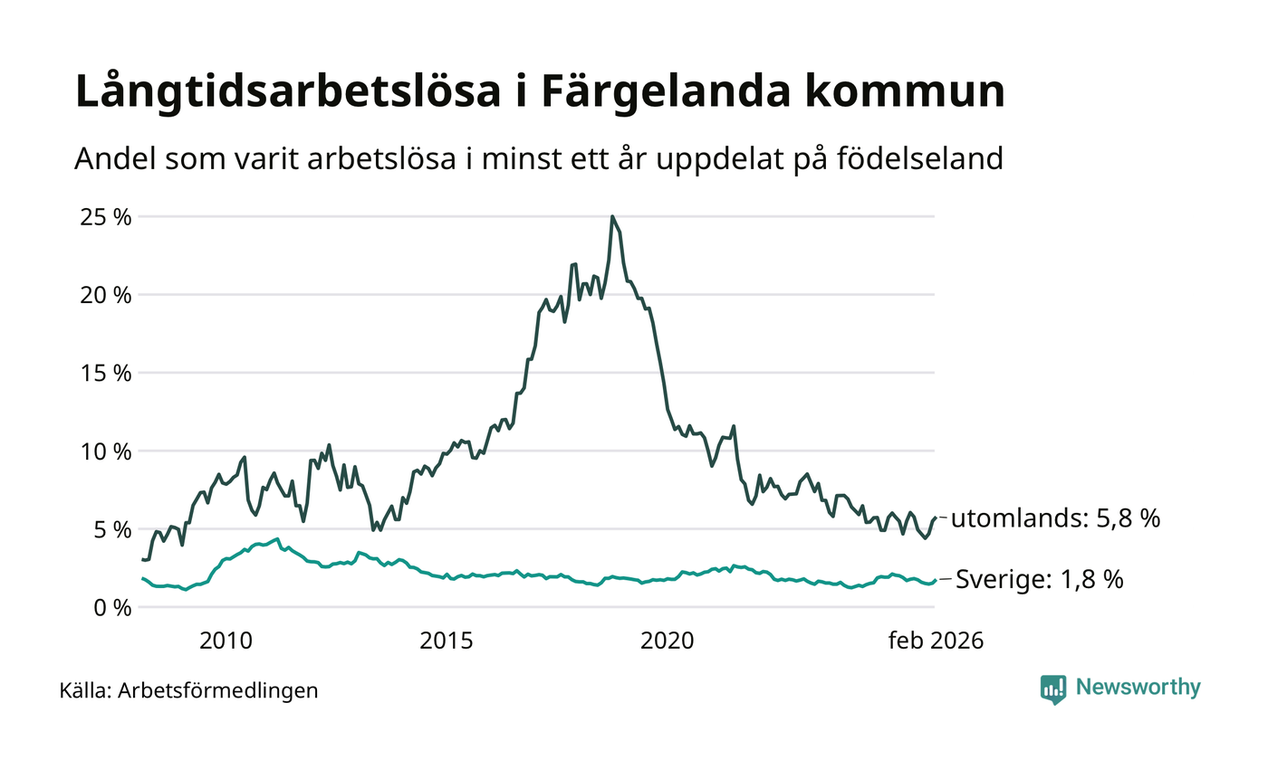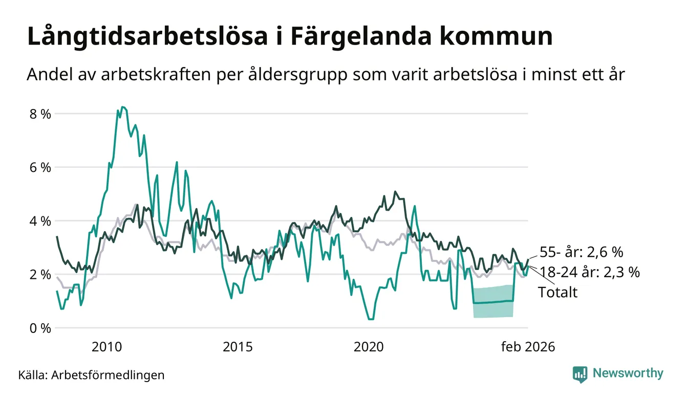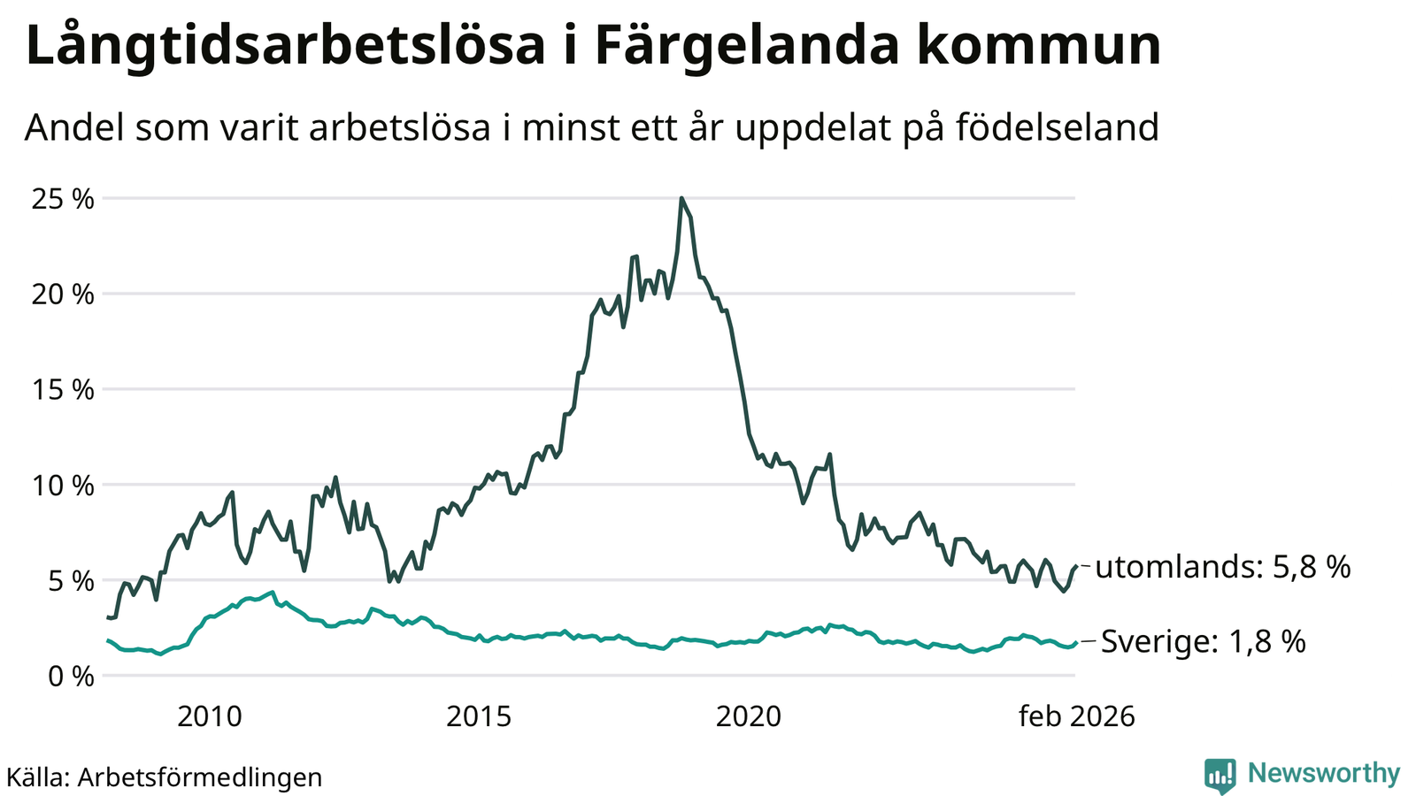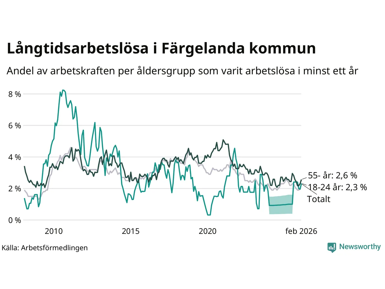 I februari hade 66 Färgelandabor varit arbetslösa i minst ett år, vilket är sju fler än månaden innan. 66 personer motsvarar 2,3 procent av arbetskraften i kommunen – andelen långtidsarbetslösa är 0,3 procentenheter lägre än samma månad för ett år sedan.