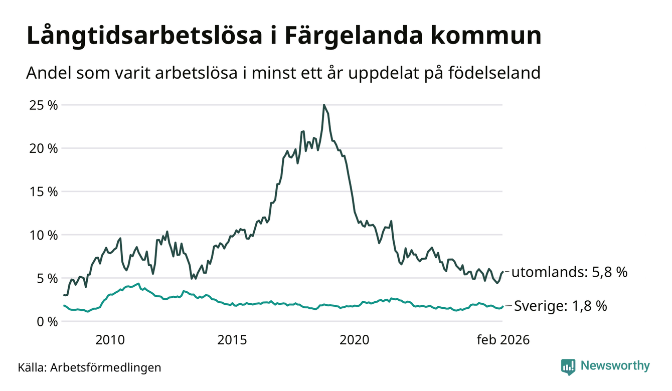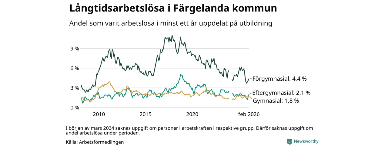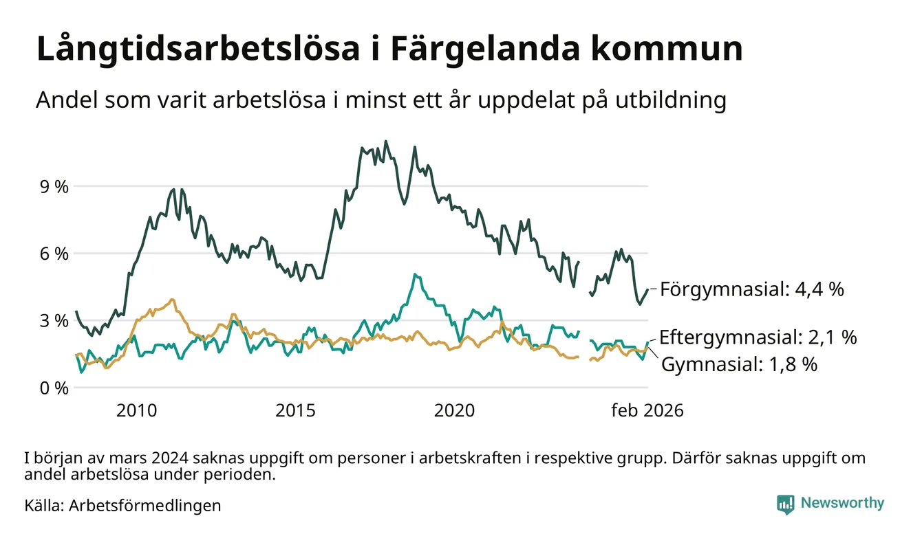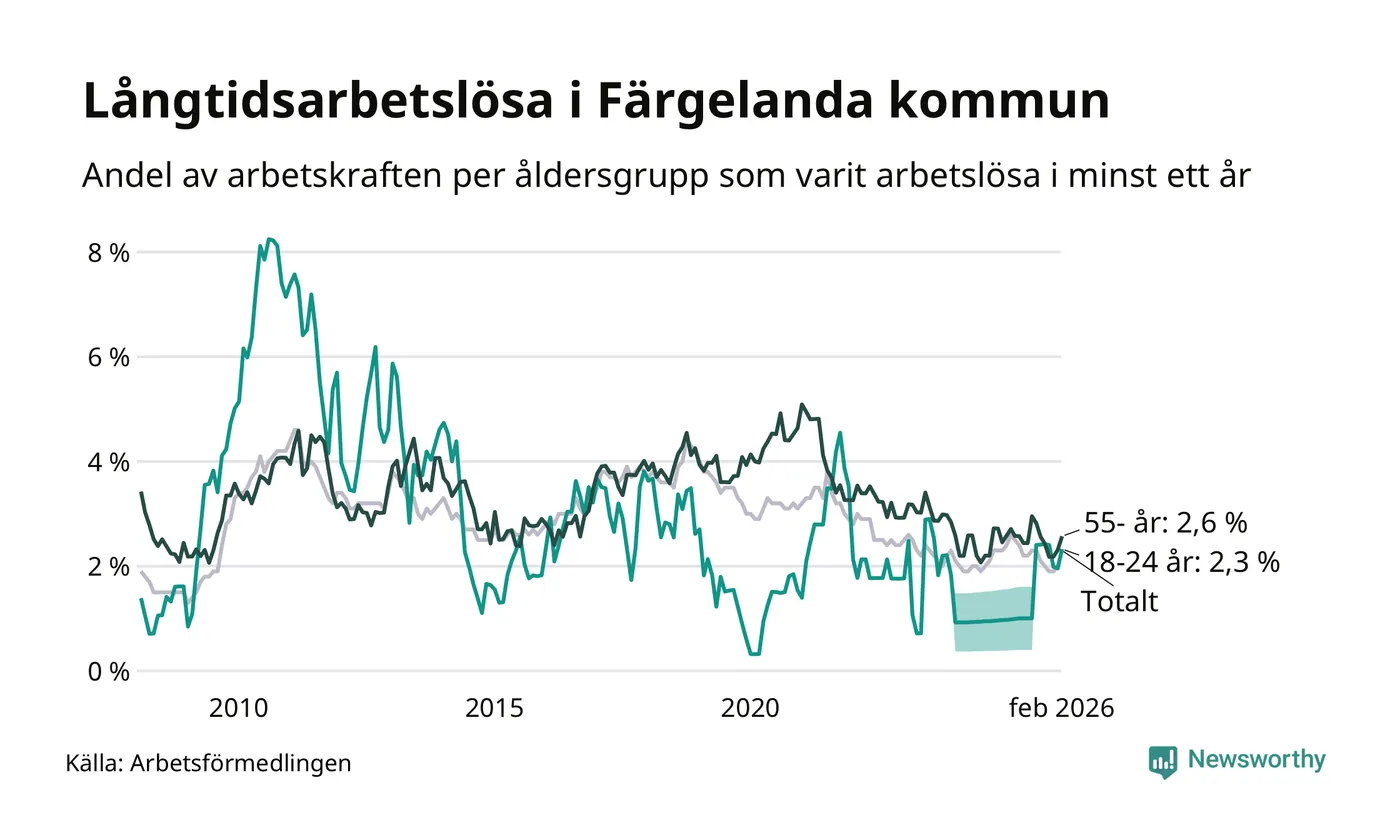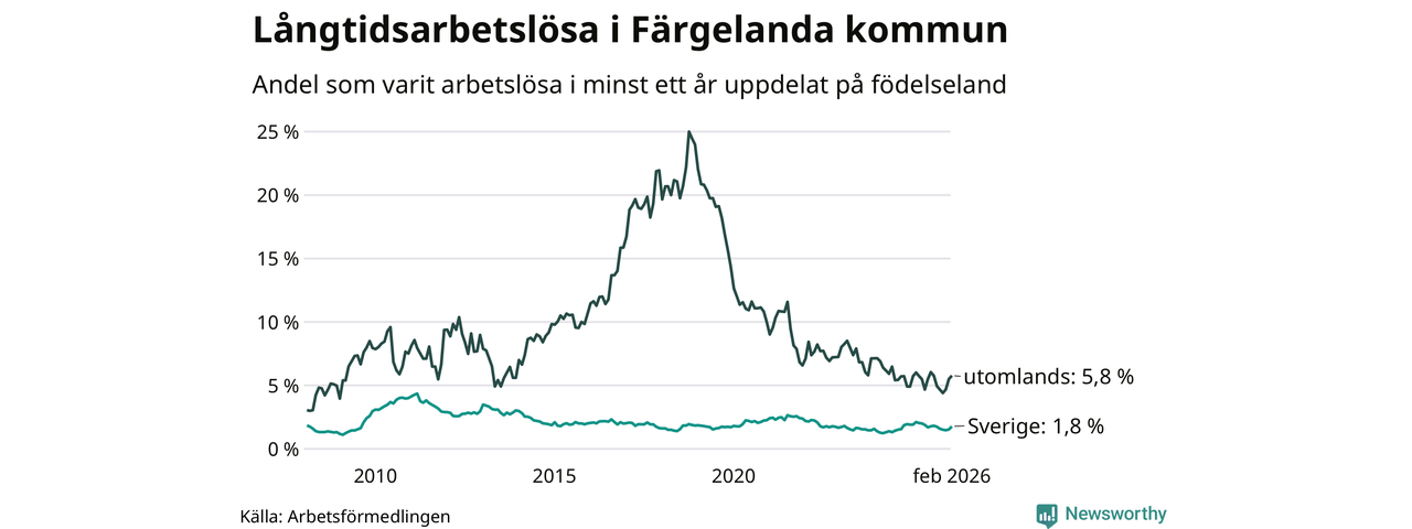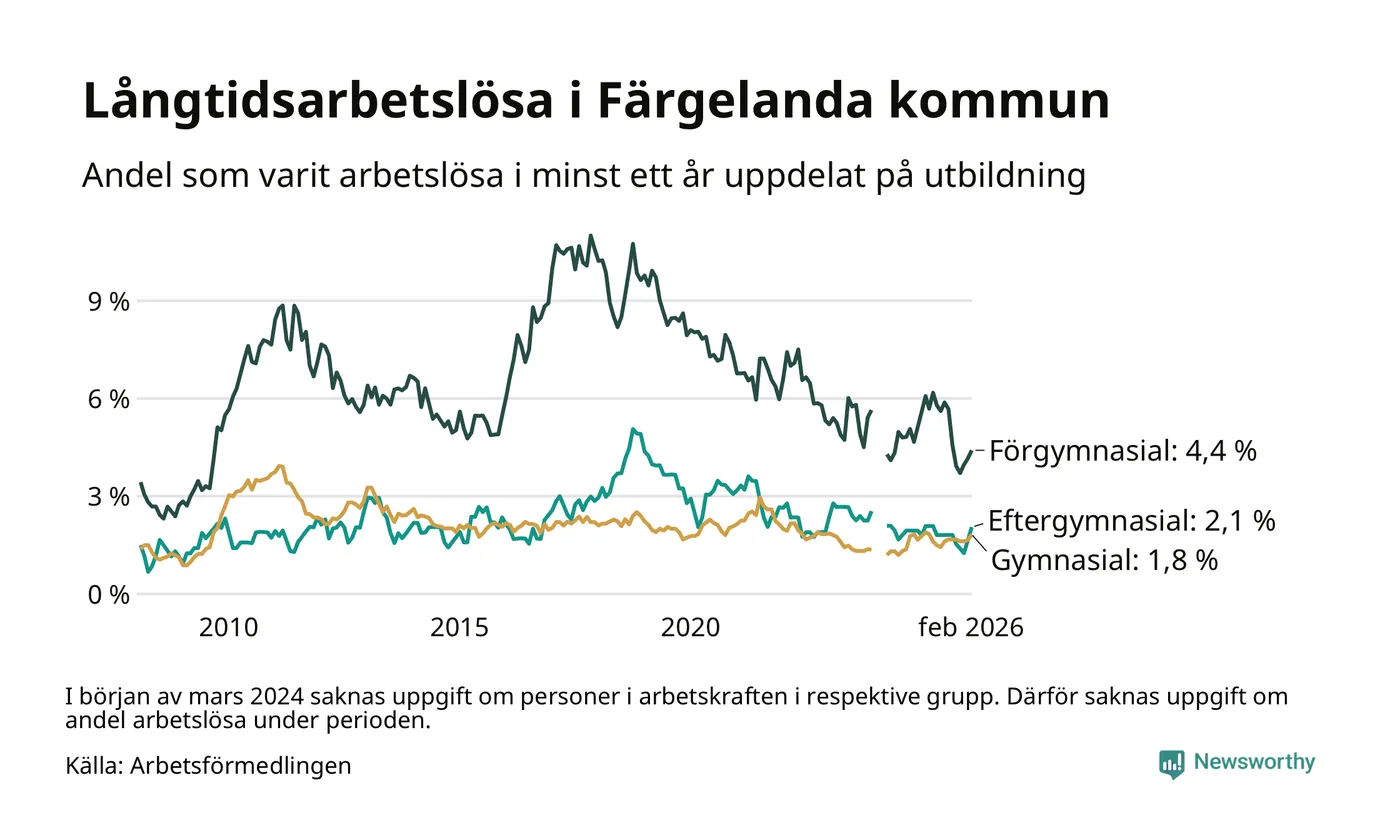 I februari hade 66 Färgelandabor varit arbetslösa i minst ett år, vilket är sju fler än månaden innan. 66 personer motsvarar 2,3 procent av arbetskraften i kommunen – andelen långtidsarbetslösa är 0,3 procentenheter lägre än samma månad för ett år sedan.