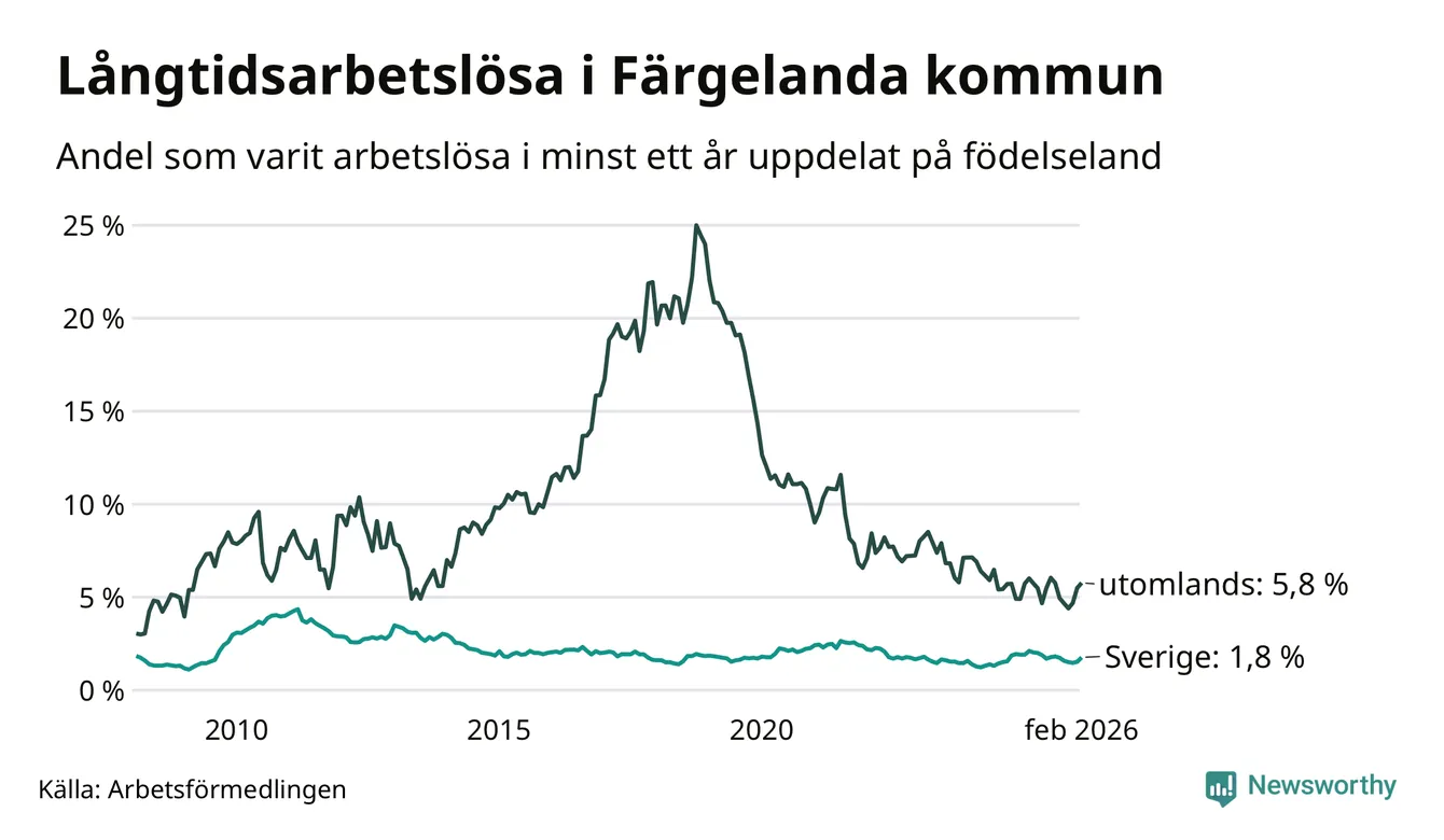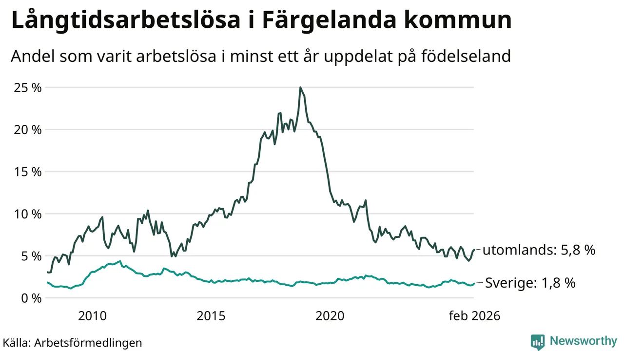 45 av de långtidsarbetslösa i Färgelanda är födda i Sverige, medan 21 är födda utomlands. Det innebär att långtidsarbetslösheten bland Sverigefödda är 1,8 procent, medan den är tre gånger så hög – 5,8 procent – bland födda utomlands. Även i riket som helhet är arbetslösheten högre bland utrikesfödda.