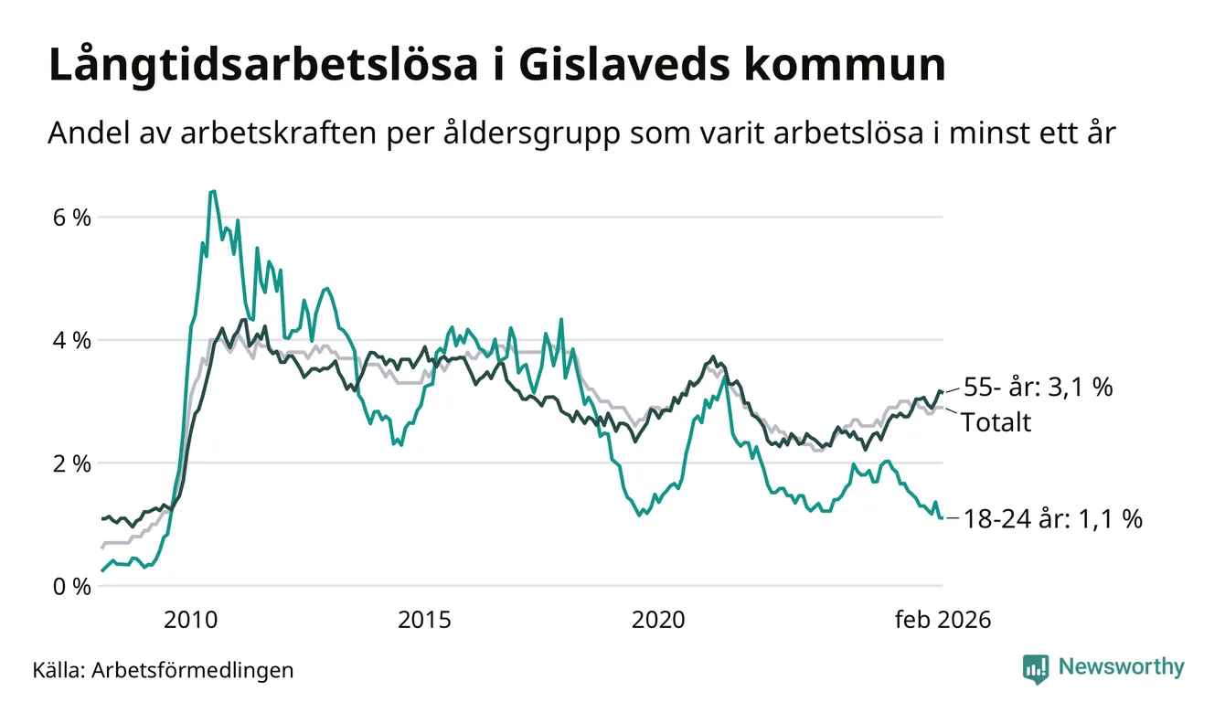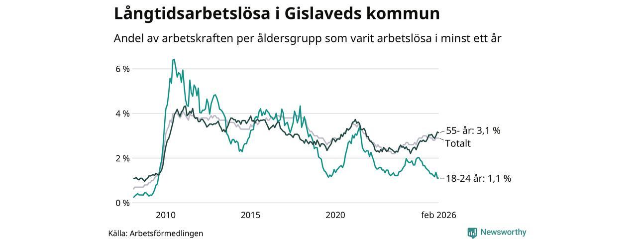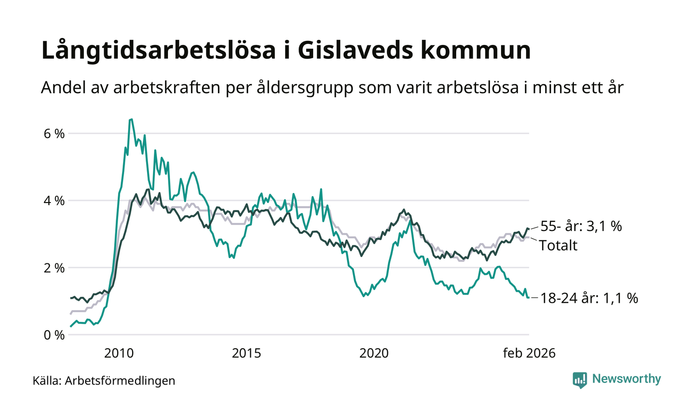 Av de 431 personerna som varit arbetslösa i mer än ett år i Gislaveds kommun är 111 personer mellan 55 och 661 år och 17 är mellan 18 och 24 år. För den äldre gruppen är andelen arbetslösa 3,1 procent medan den i den yngre gruppen är 1,1 procent. Även i riket som helhet är långtidsarbetslösheten högre i gruppen äldre.