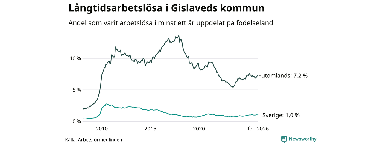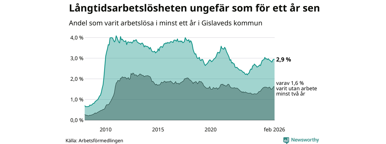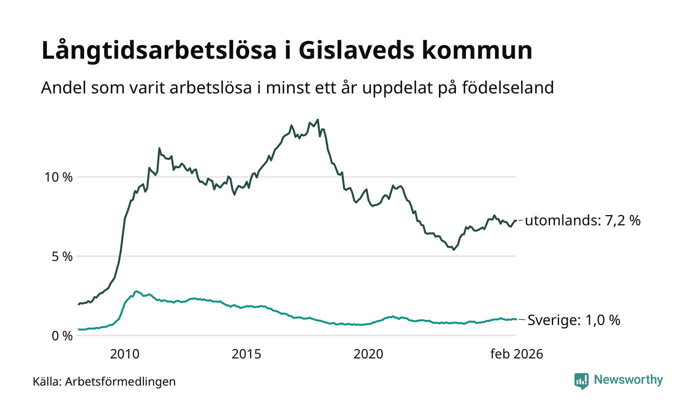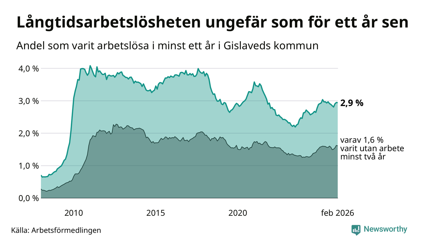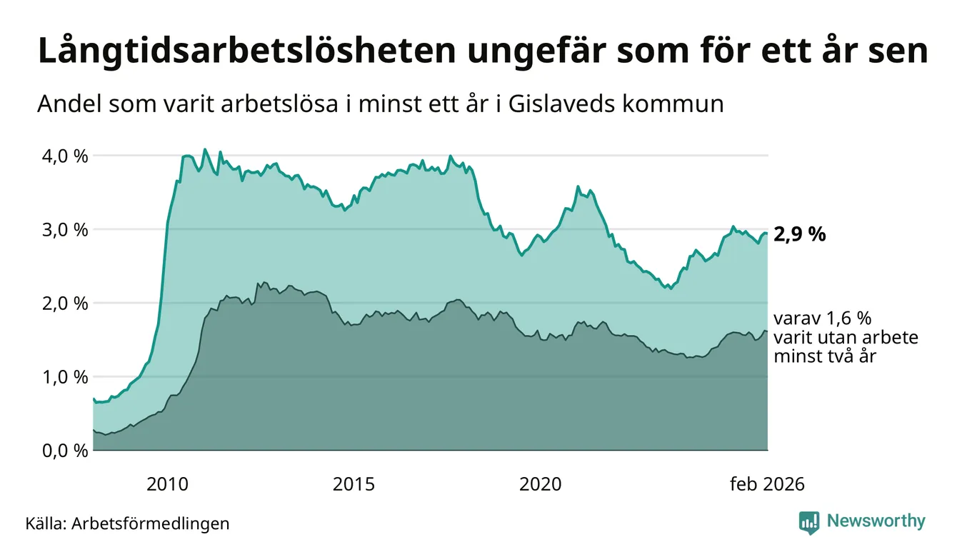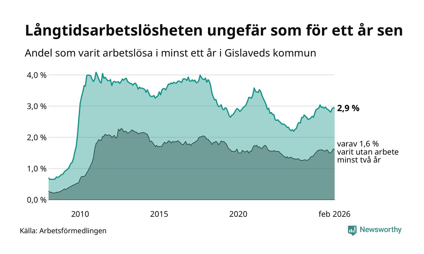 I februari hade 431 Gislavedsbor varit arbetslösa i minst ett år, vilket är en färre än månaden innan. 431 personer motsvarar 2,9 procent av arbetskraften i kommunen – andelen långtidsarbetslösa är ungefär på samma nivå som för ett år sedan.