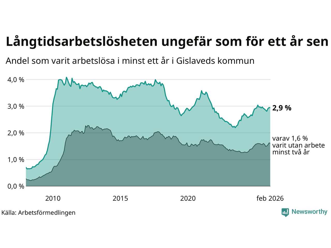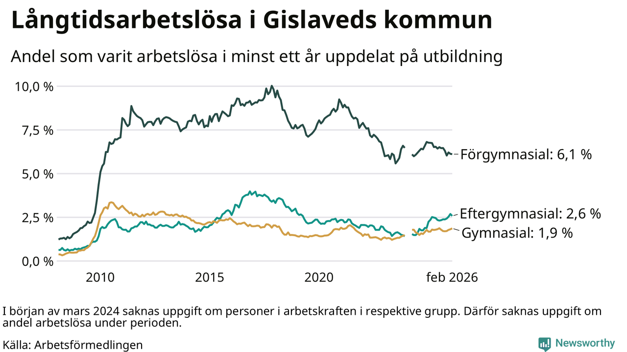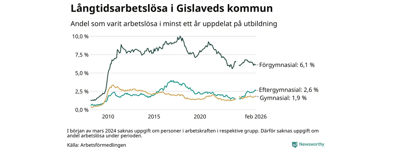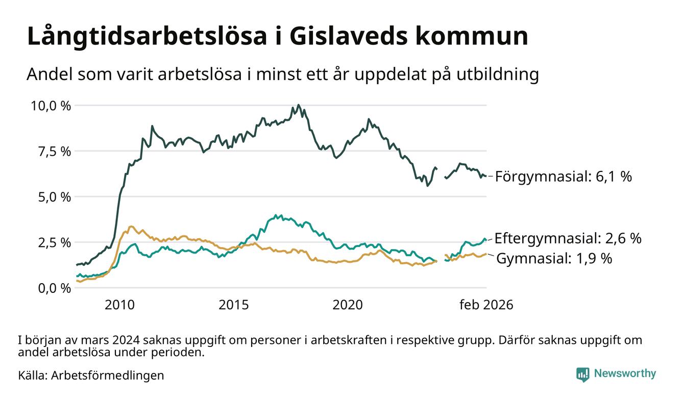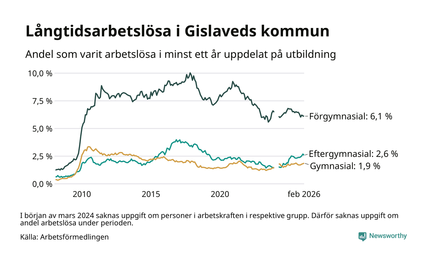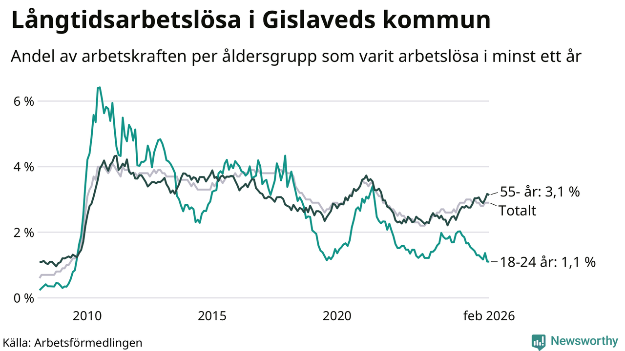 I februari hade 431 Gislavedsbor varit arbetslösa i minst ett år, vilket är en färre än månaden innan. 431 personer motsvarar 2,9 procent av arbetskraften i kommunen – andelen långtidsarbetslösa är ungefär på samma nivå som för ett år sedan.