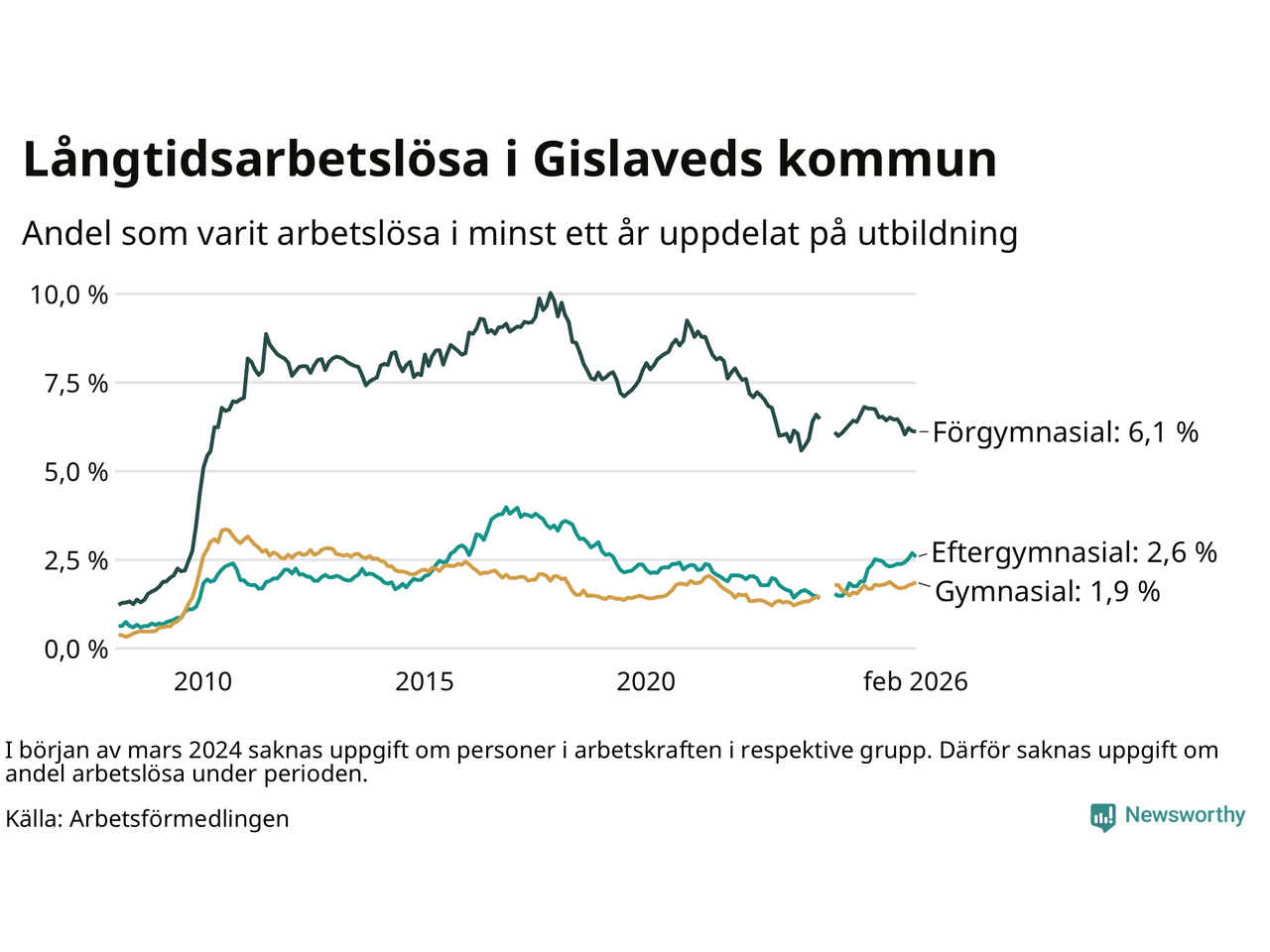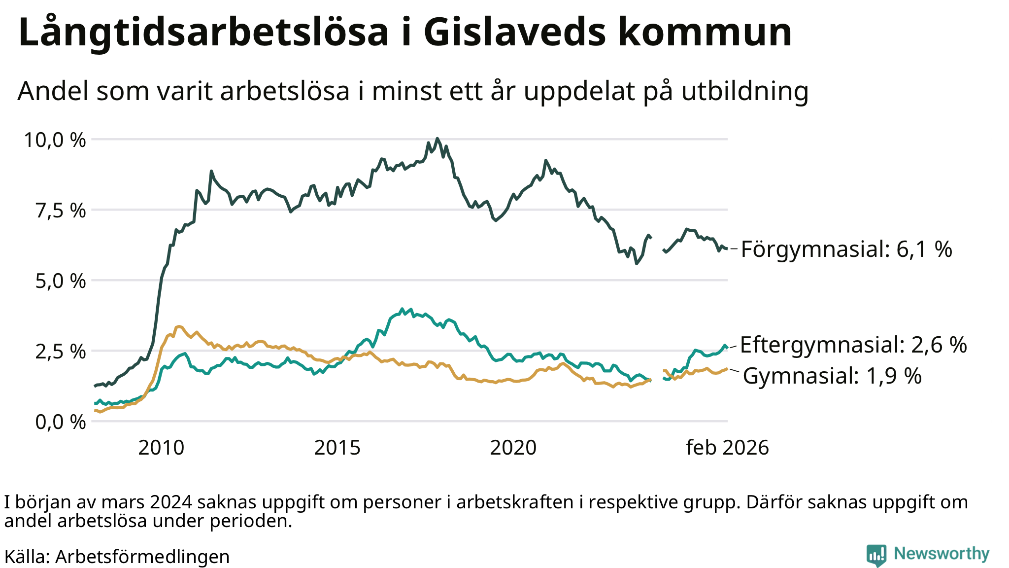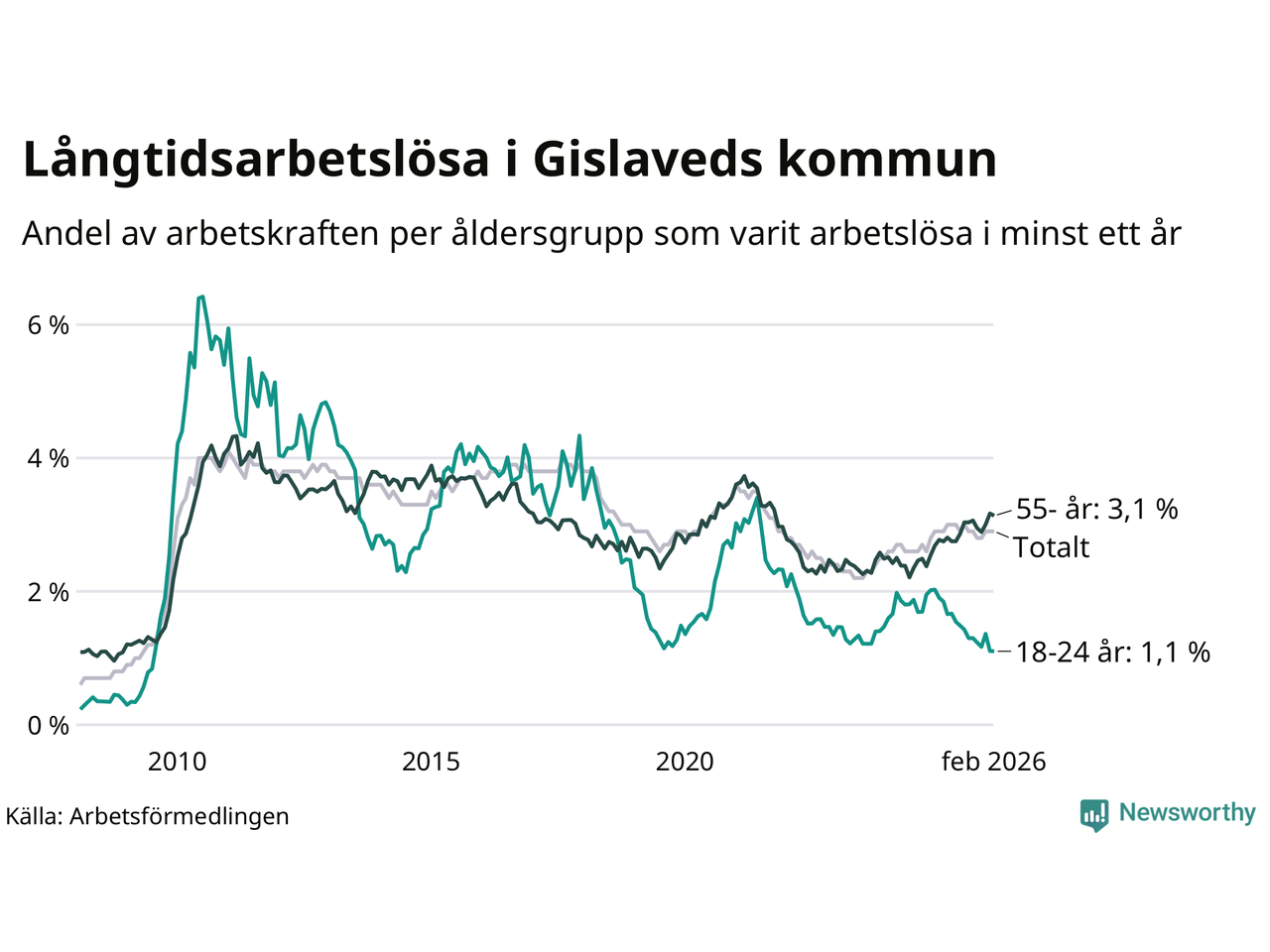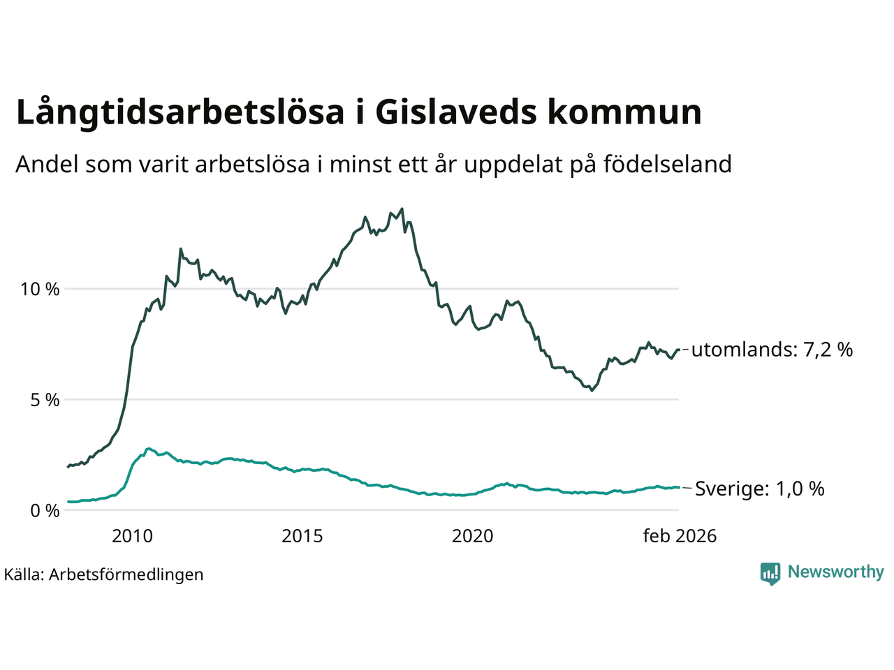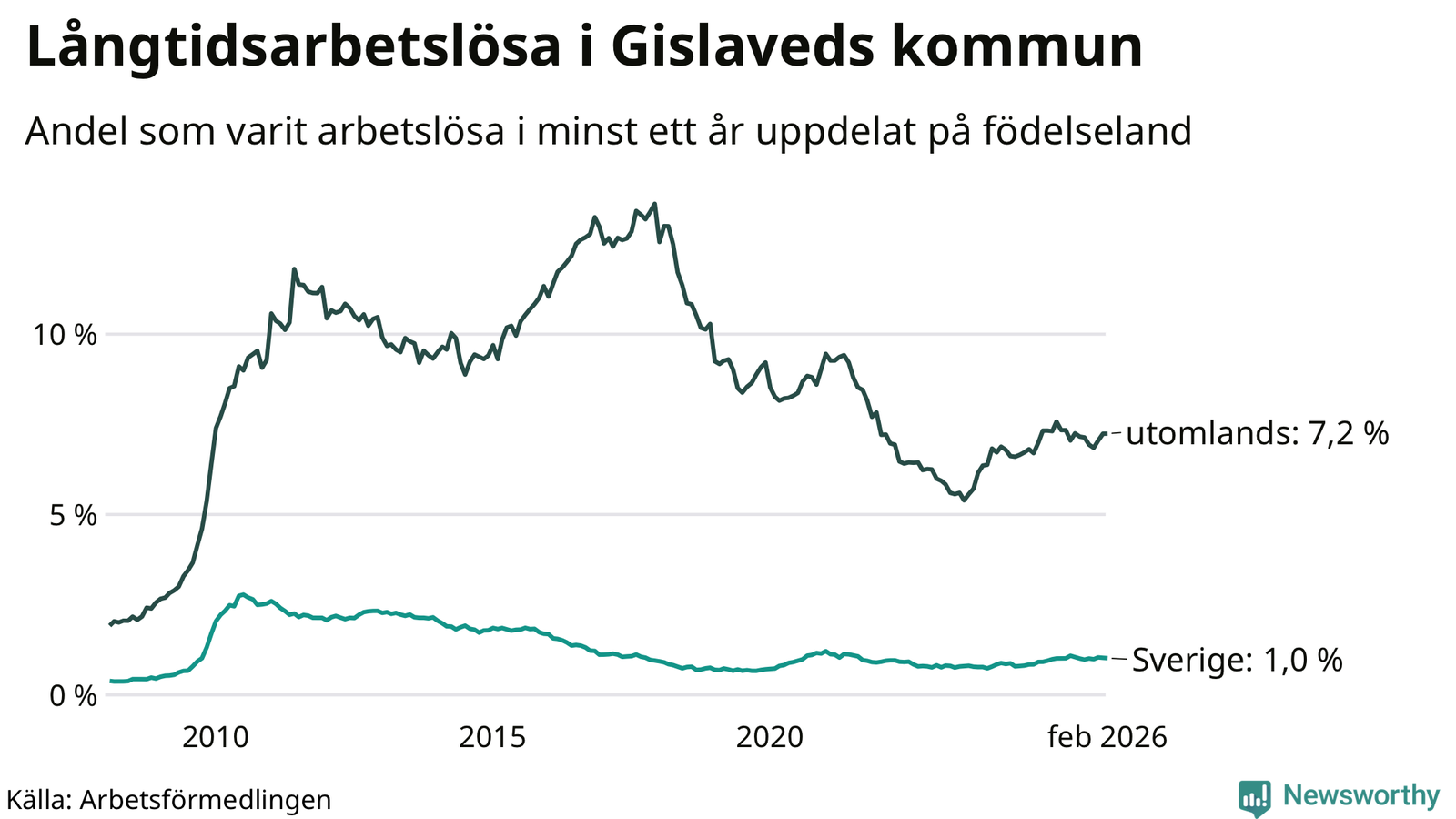 I februari hade 431 Gislavedsbor varit arbetslösa i minst ett år, vilket är en färre än månaden innan. 431 personer motsvarar 2,9 procent av arbetskraften i kommunen – andelen långtidsarbetslösa är ungefär på samma nivå som för ett år sedan.