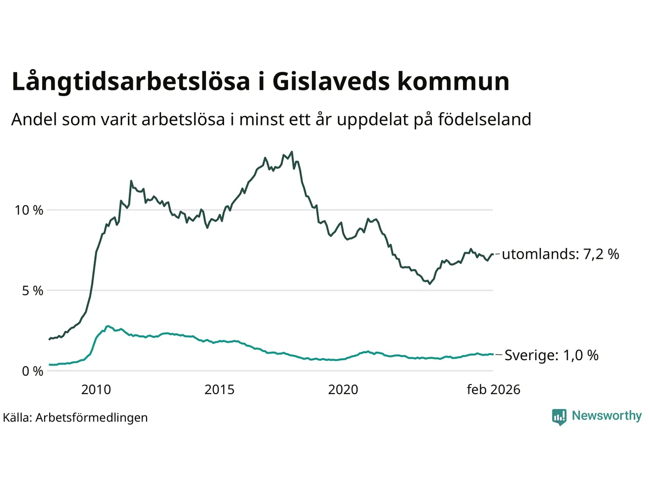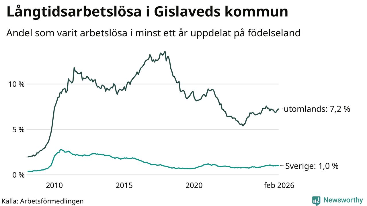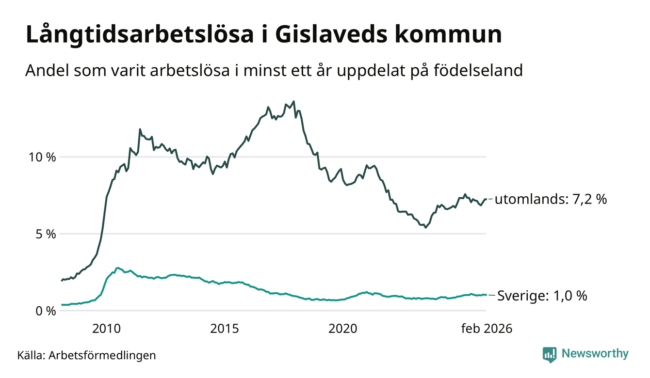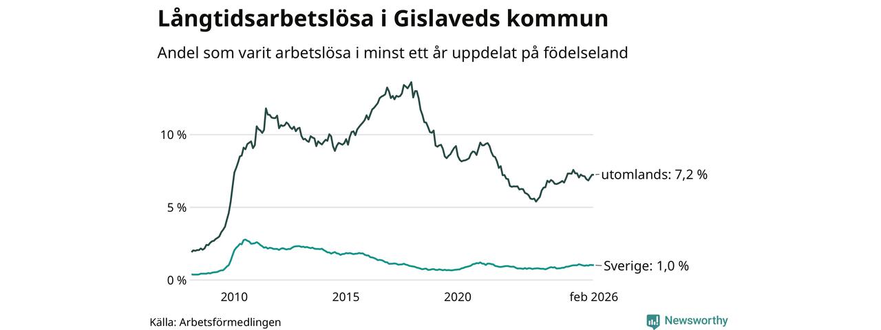 103 av de långtidsarbetslösa i Gislaved är födda i Sverige, medan 328 är födda utomlands. Det innebär att långtidsarbetslösheten bland Sverigefödda är 1,0 procent, medan den är sju gånger så hög – 7,2 procent – bland födda utomlands. Även i riket som helhet är arbetslösheten högre bland utrikesfödda.