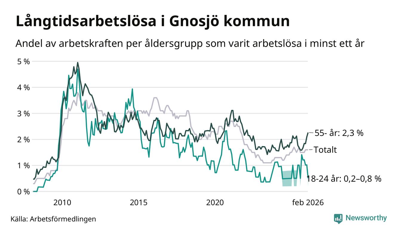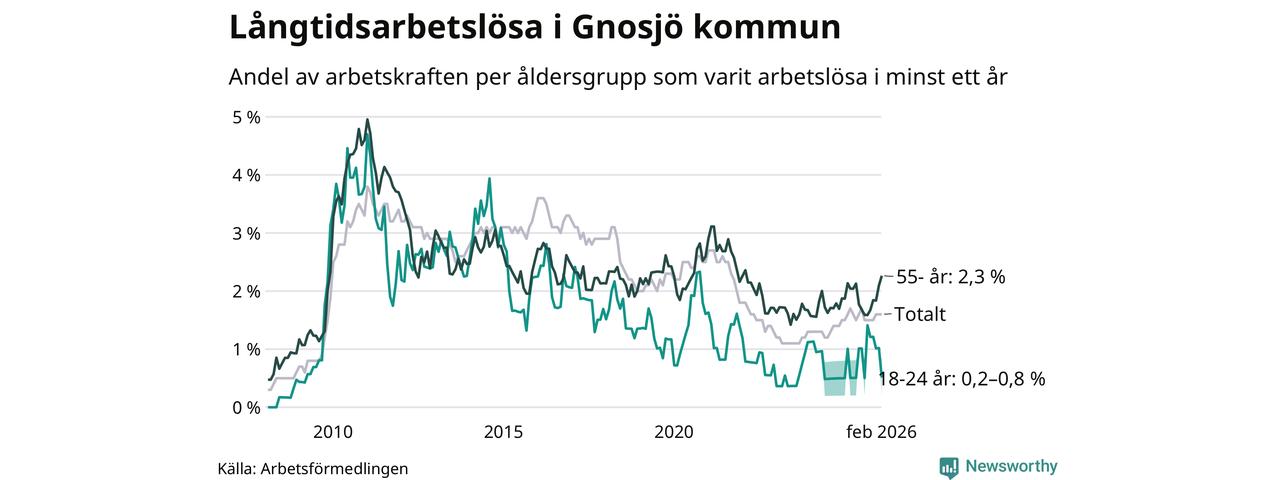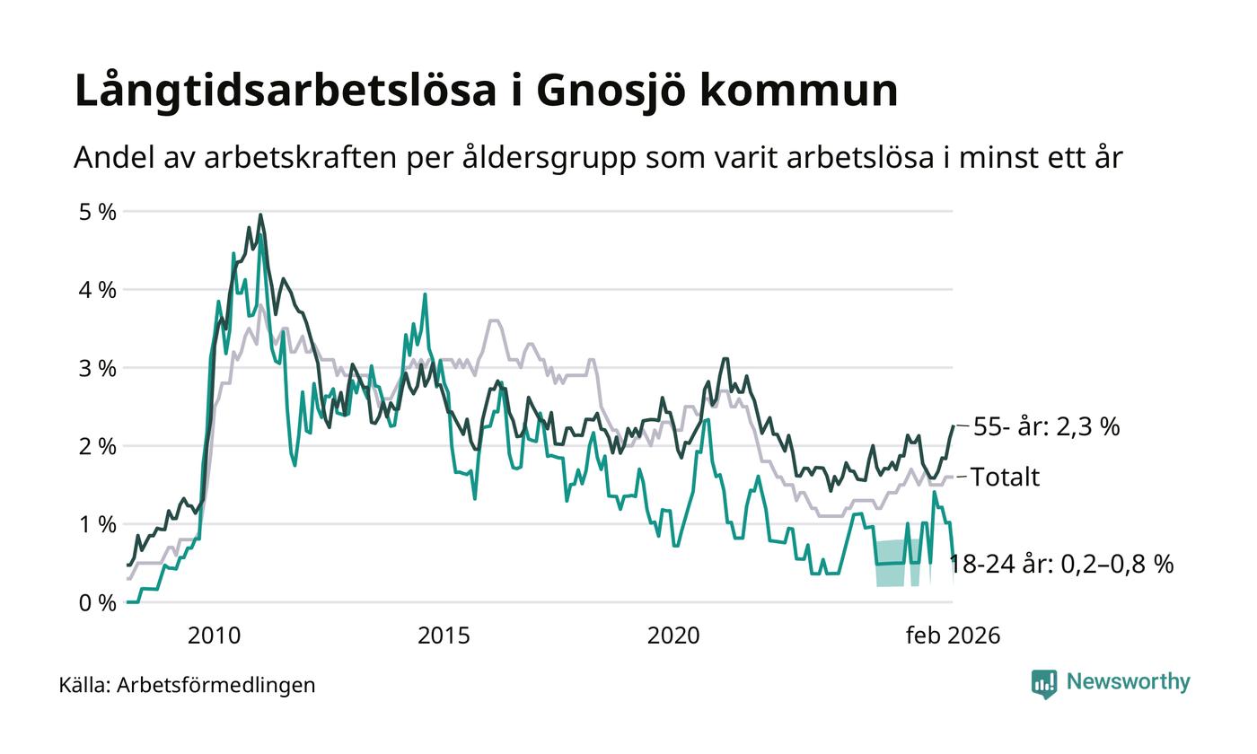 Av de 76 personerna som varit arbetslösa i mer än ett år i Gnosjö kommun är 26 personer mellan 55 och 661 år och mellan en och fyra är mellan 18 och 24 år. För den äldre gruppen är andelen arbetslösa 2,3 procent medan den i den yngre gruppen är mellan 0,2 och 0,8 procent. Även i riket som helhet är långtidsarbetslösheten högre i gruppen äldre.