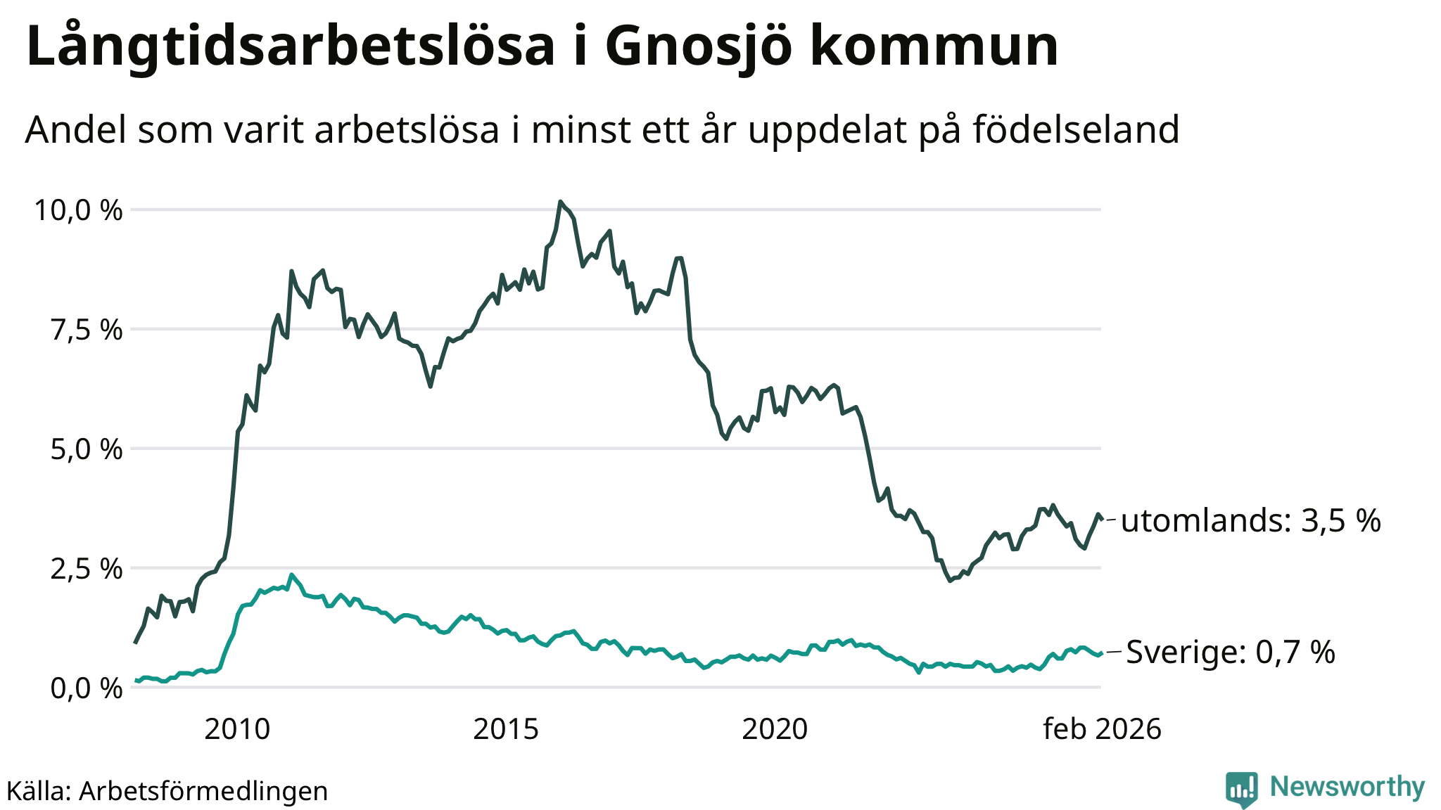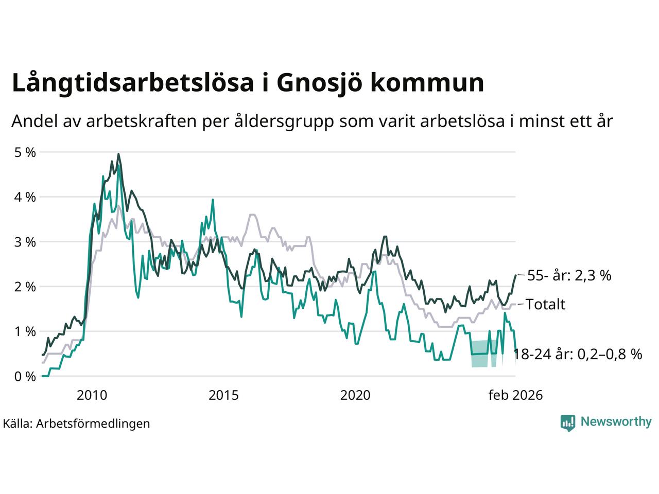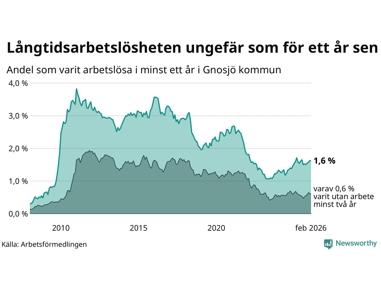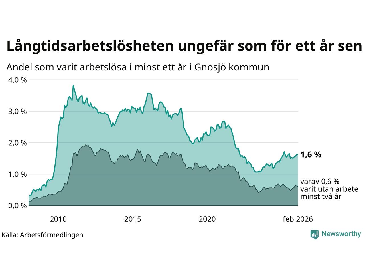 | Andel arbetslösa i minst två år | 0,6 % | 1,3 % | 1,6 % |