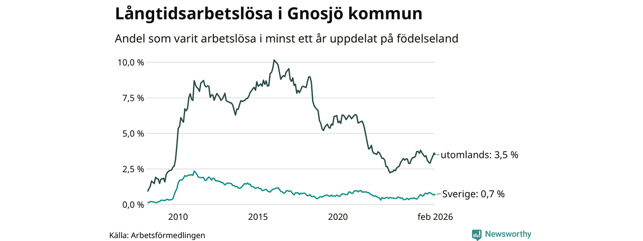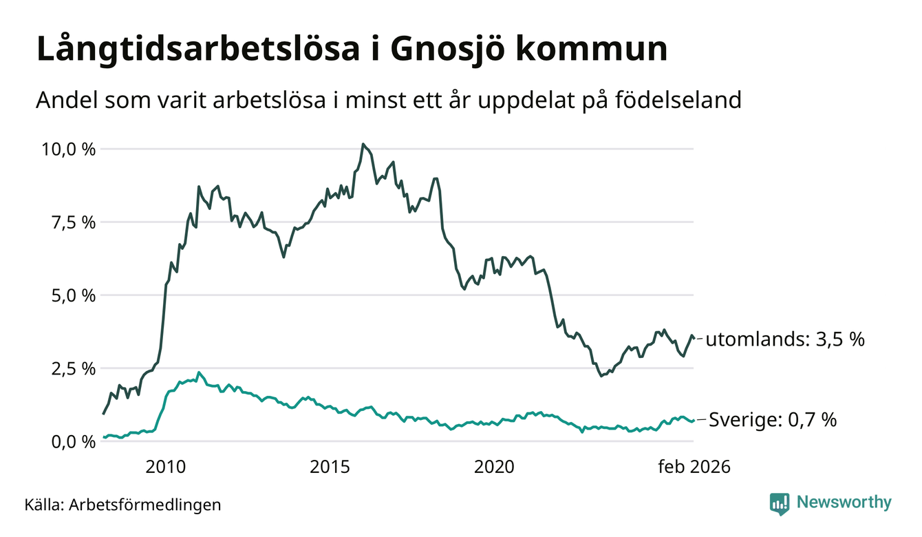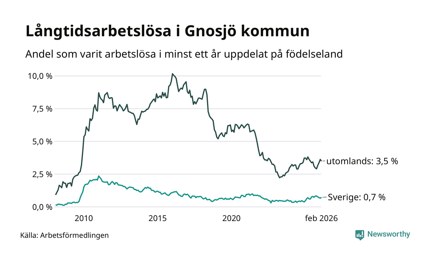 23 av de långtidsarbetslösa i Gnosjö är födda i Sverige, medan 53 är födda utomlands. Det innebär att långtidsarbetslösheten bland Sverigefödda är 0,7 procent, medan den är fem gånger så hög – 3,5 procent – bland födda utomlands. Även i riket som helhet är arbetslösheten högre bland utrikesfödda.