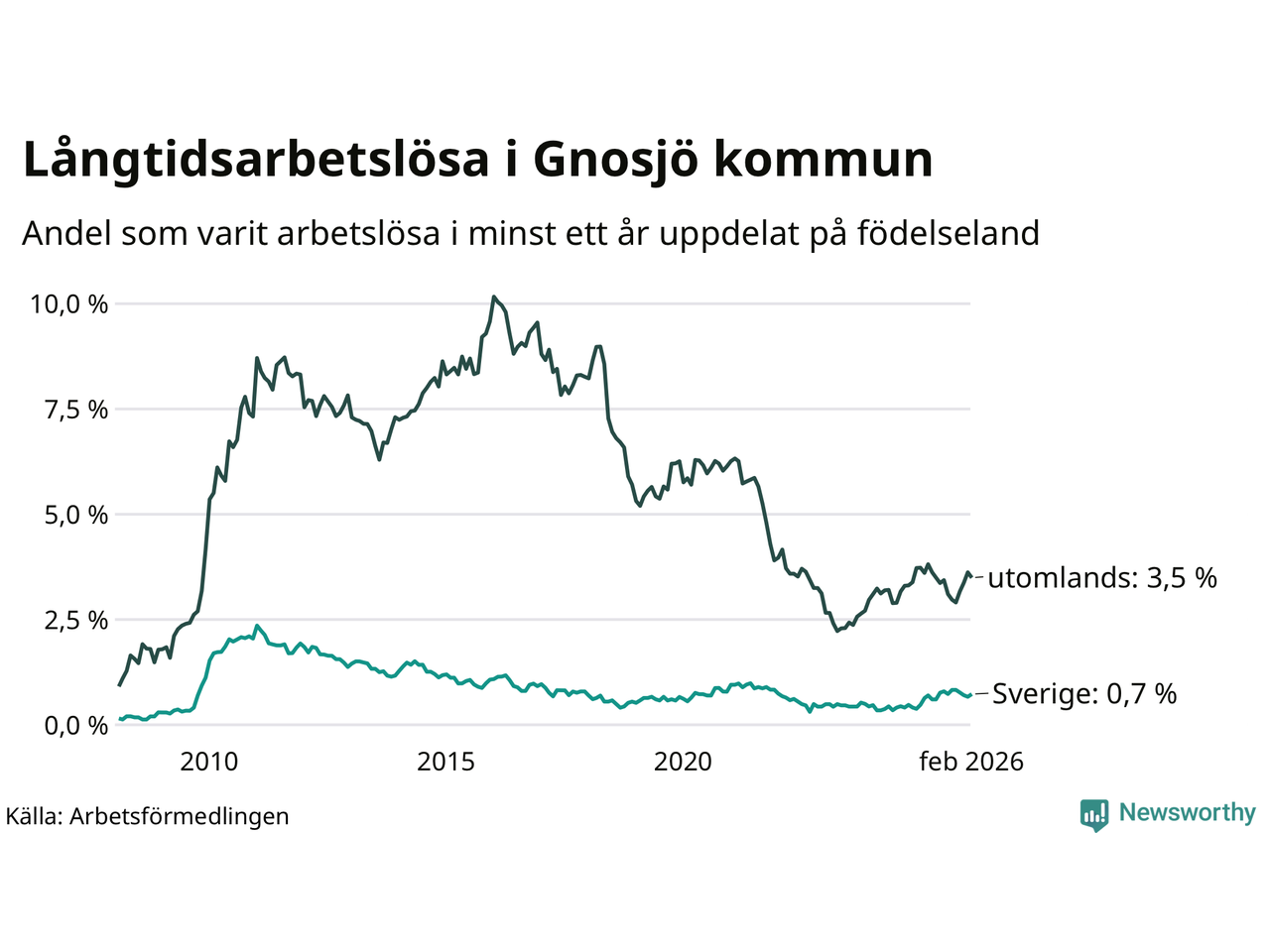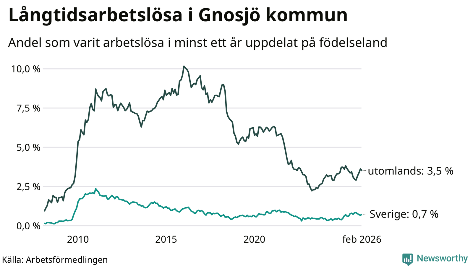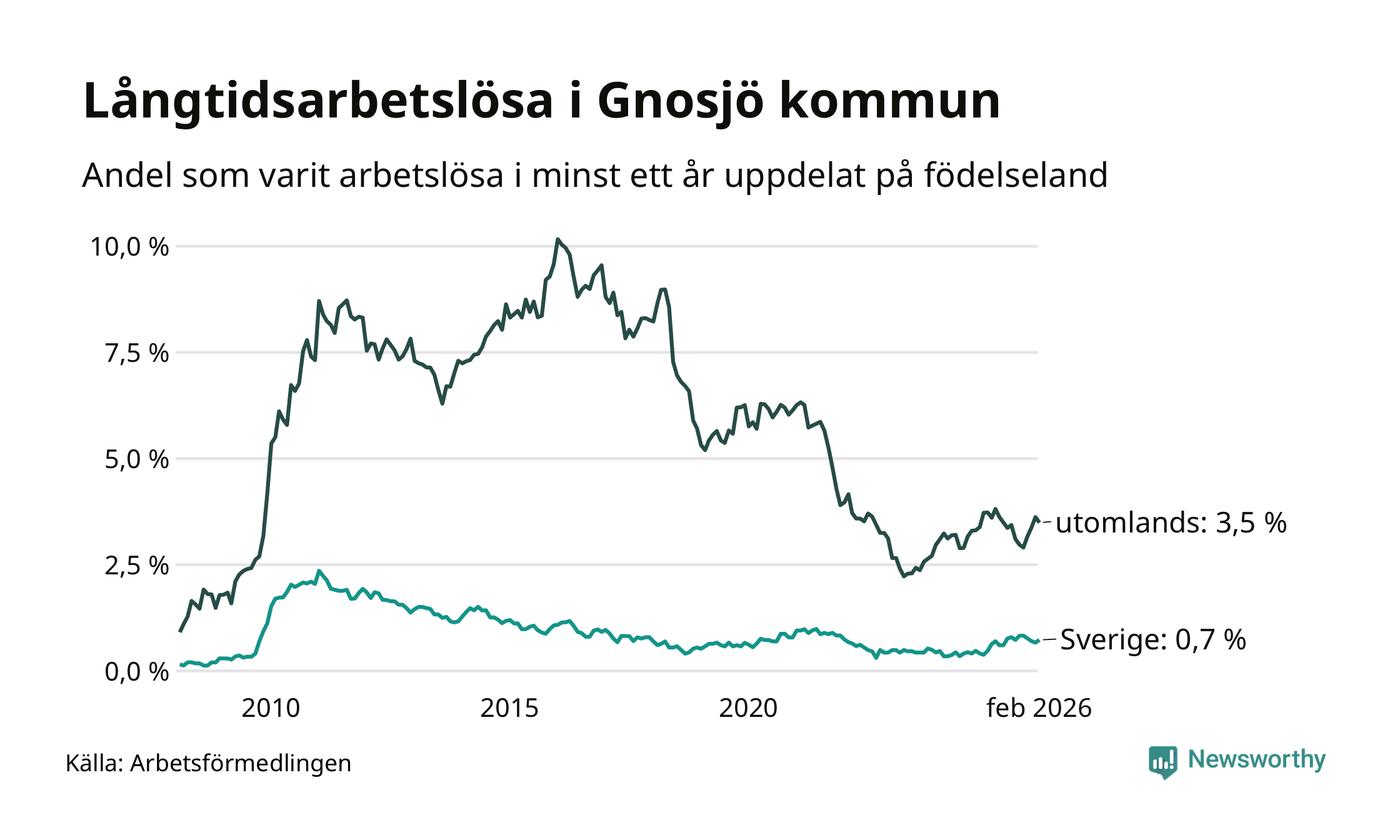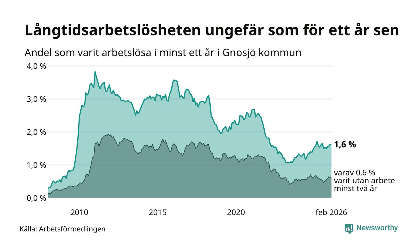 I februari hade 76 Gnosjöbor varit arbetslösa i minst ett år, vilket är lika många som månaden innan. Det är den fjärde månaden i rad med ökande eller oförändrat antal långtidsarbetslösa. 76 personer motsvarar 1,6 procent av arbetskraften i kommunen – andelen långtidsarbetslösa är ungefär på samma nivå som för ett år sedan.