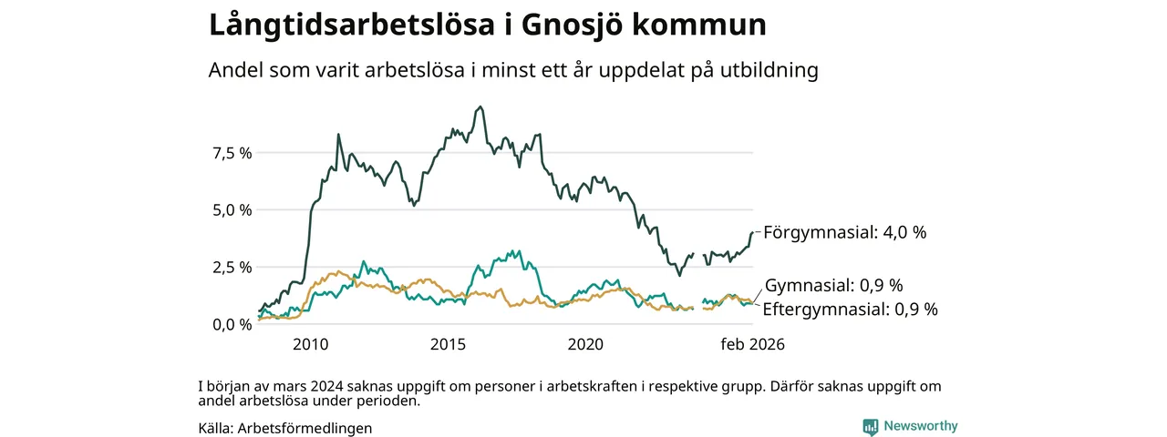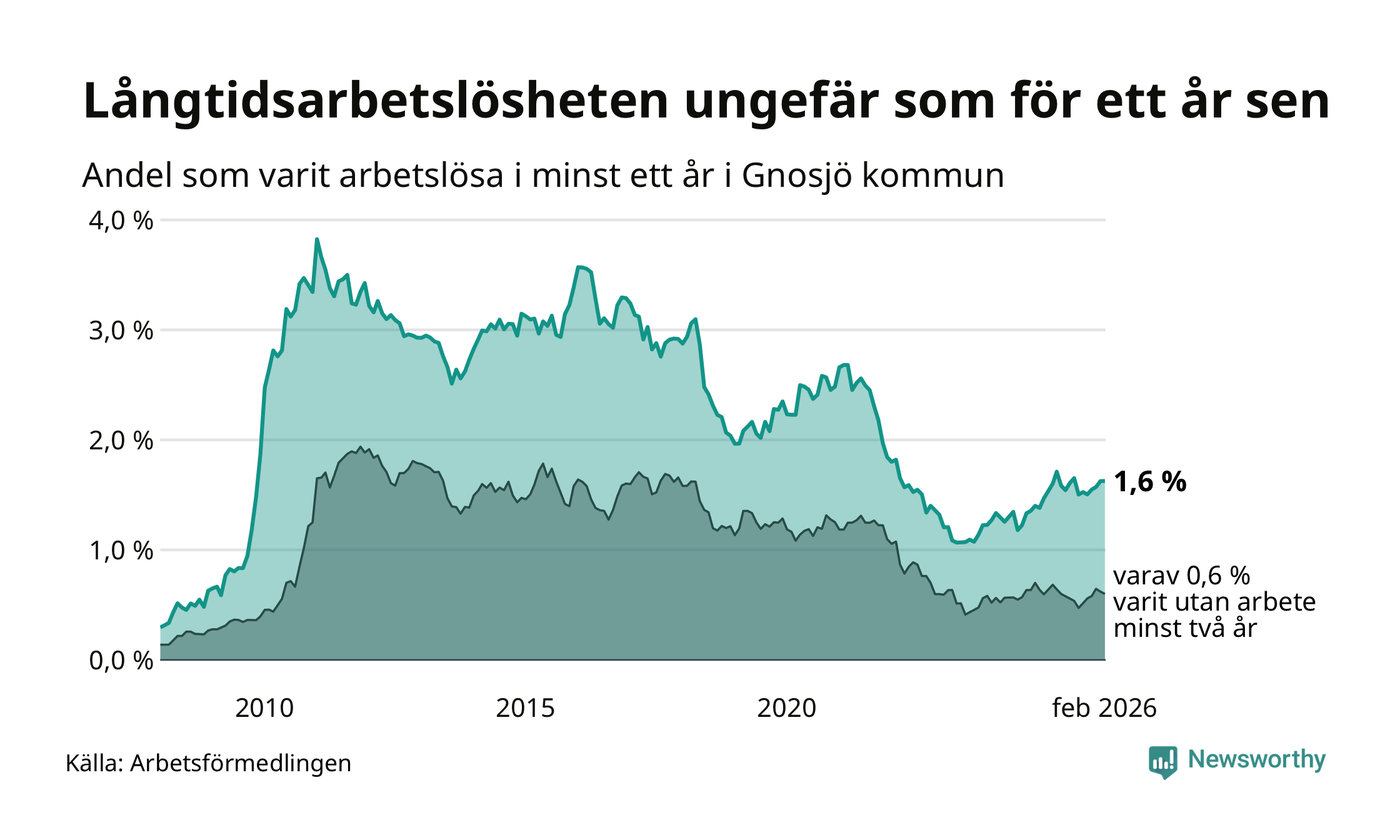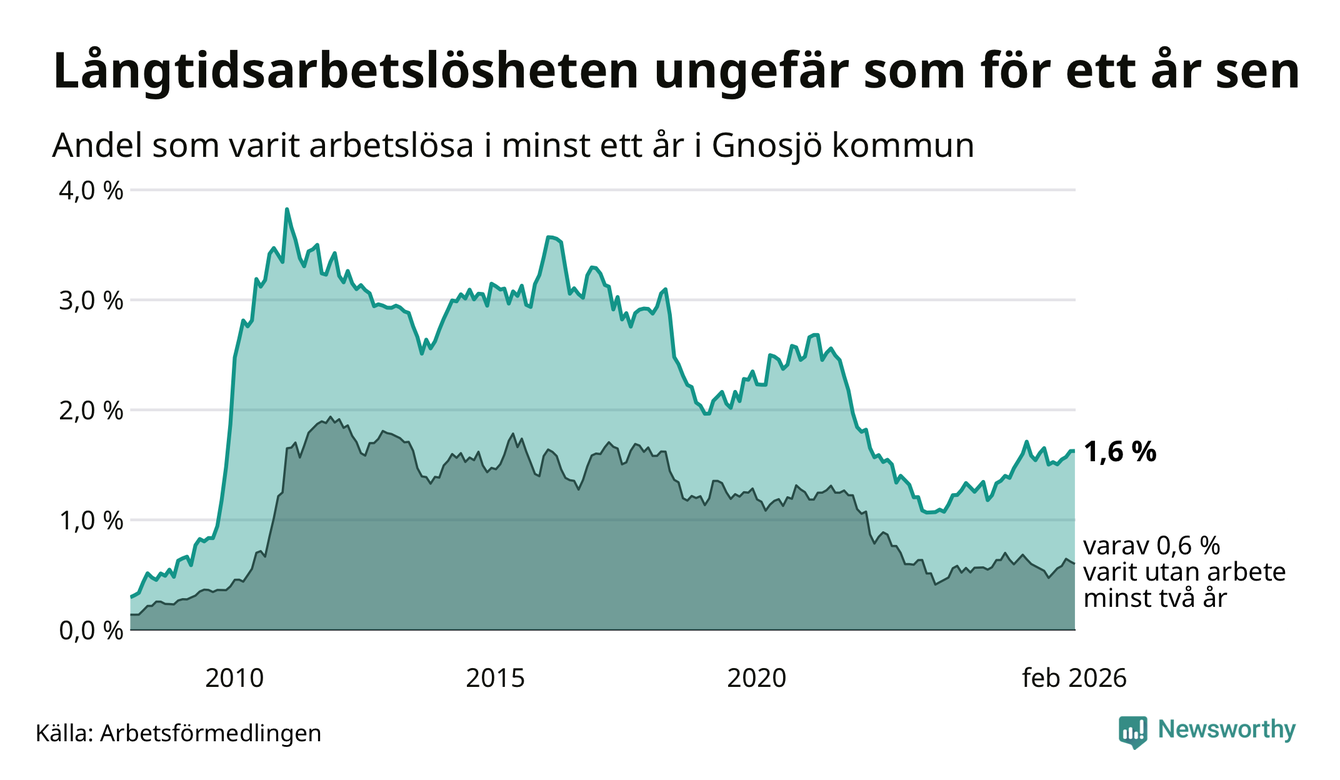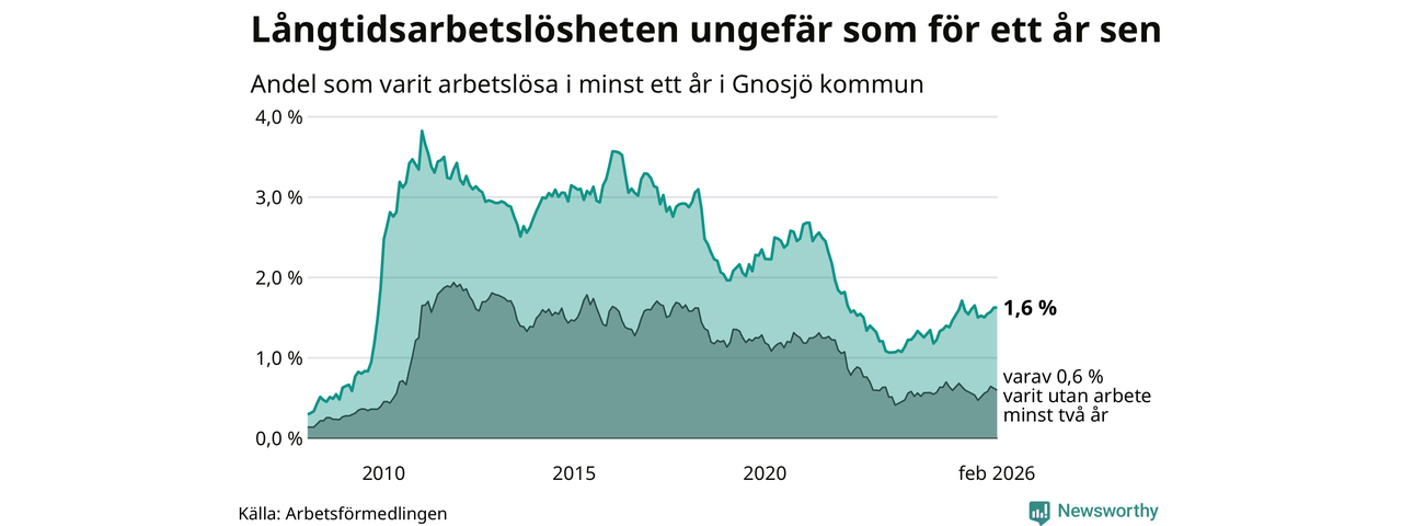 Andelen som varit utan arbete i minst ett år i Gnosjö var ungefär lika stor i februari jämfört med samma månad för ett år sedan. Det visar Arbetsfömedlingens senaste månadsstatistik.
