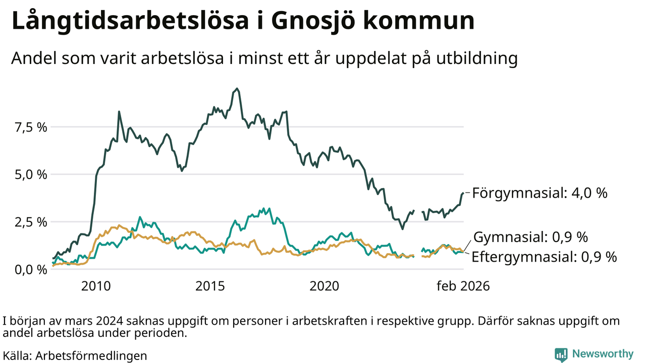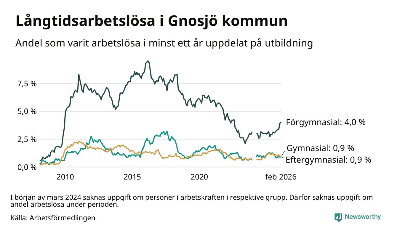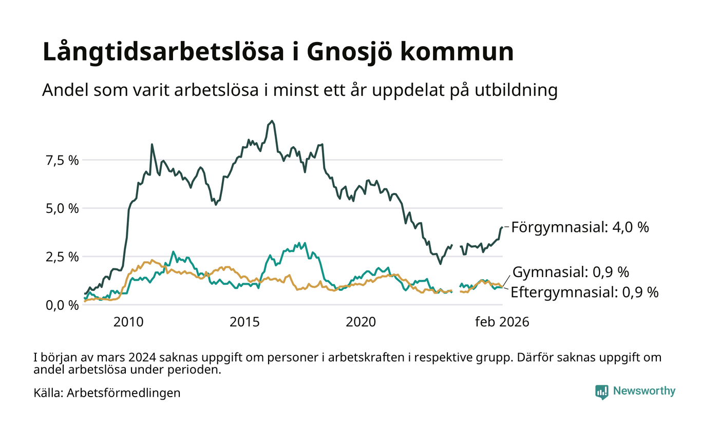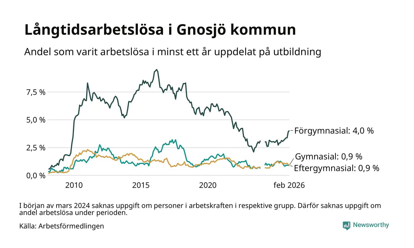 Andelen som varit utan arbete i minst ett år i Gnosjö var ungefär lika stor i februari jämfört med samma månad för ett år sedan. Det visar Arbetsfömedlingens senaste månadsstatistik.